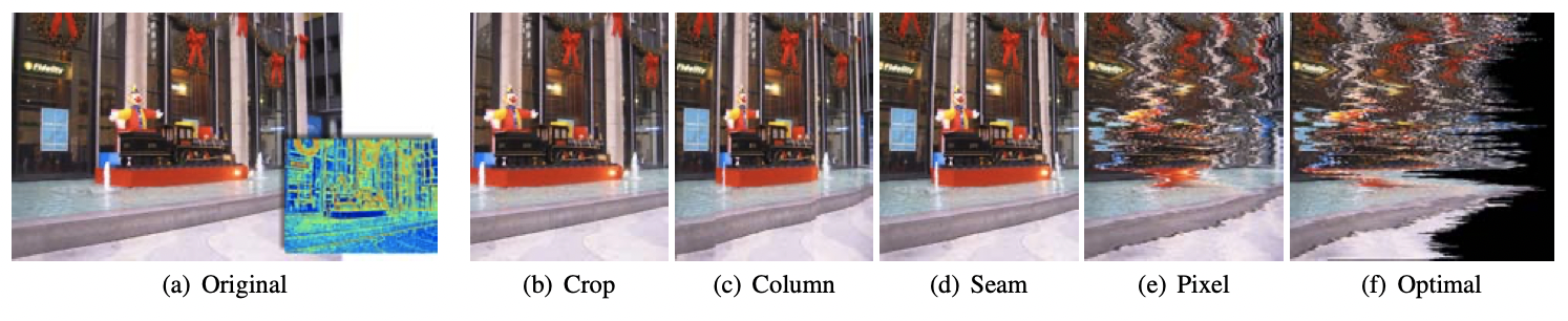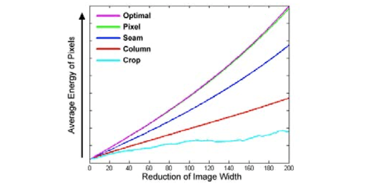Our approach to content-aware resizing is to remove pixels in a ju- dicious manner. Therefor, the question is how to chose the pixels to be removed? Intuitively, our goal is to remove unnoticeable pixels that blend with their surroundings. This leads to the following sim- ple energy function that was used in many figures in this paper such as Figures 1, 6, 5, 8, 11, 12, 13 (we explore other energy functions in subsection 3.2):