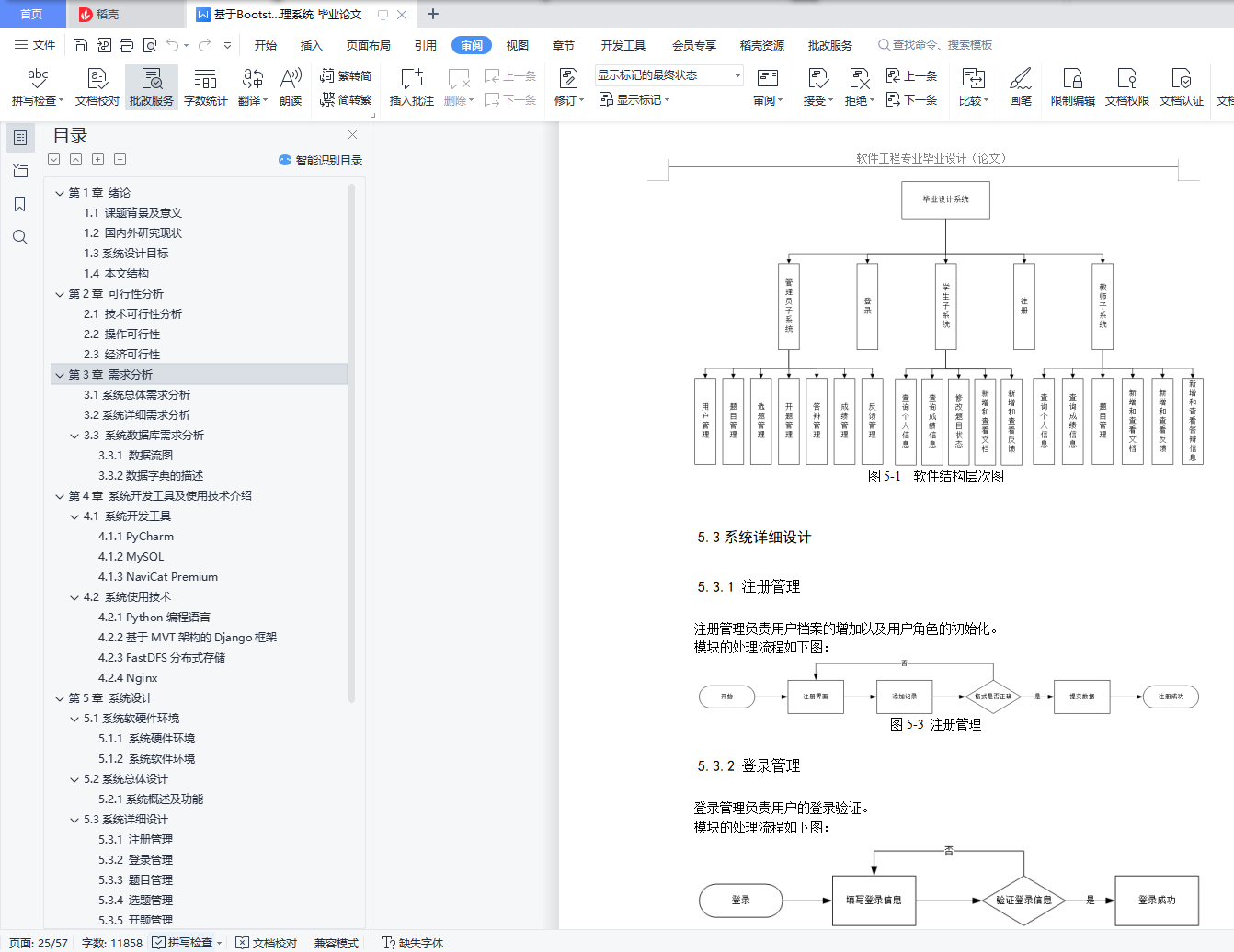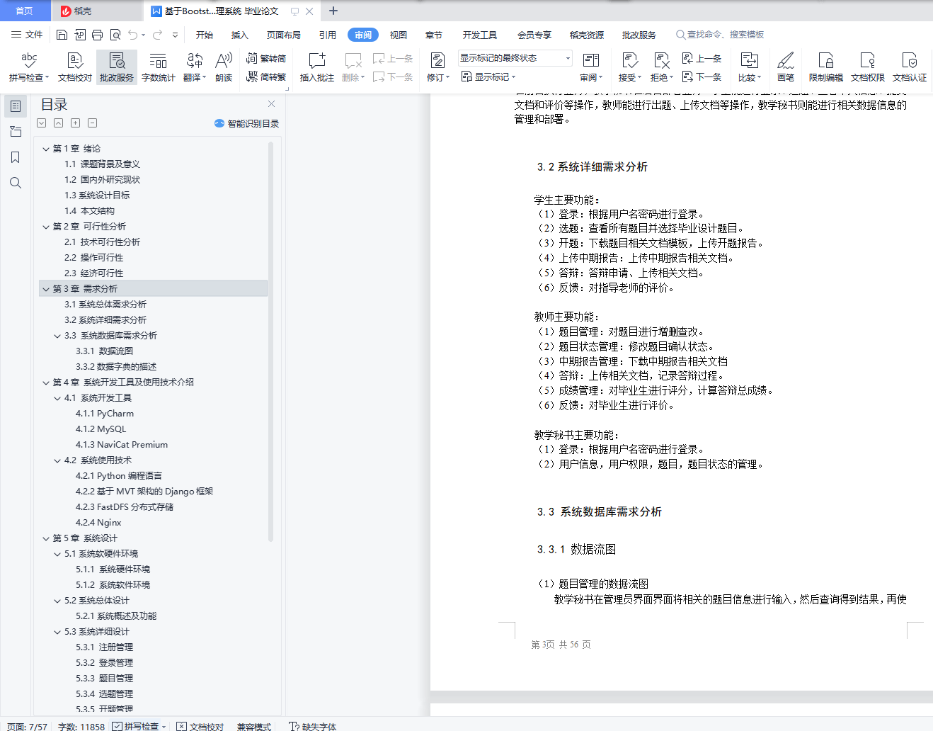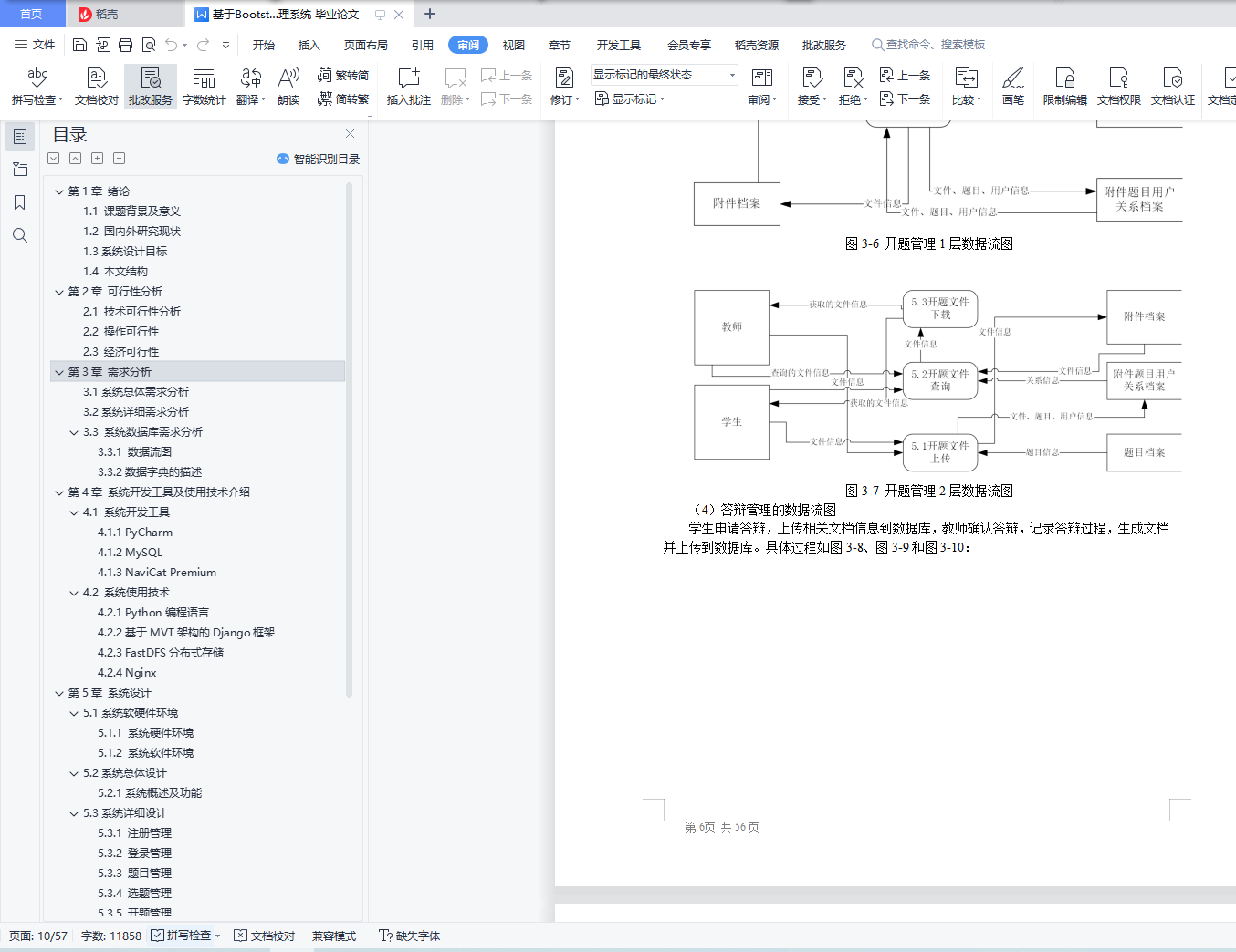 目录摘要 IAbstract II第1章 绪论 11.1 课题背景及意义 11.2 国内外研究现状 11.3系统设计目标 11.4 本文结构 1第2章 可行性分析 22.1 技术可行性分析 22.2 操作可行性 22.3 经济可行性 2第3章 需求分析 33.1系统总体需求分析 33.2系统详细需求分析 33.3 系统数据库需求分析 33.3.1 数据流图 33.3.2数据字典的描述 9第4章 系统开发工具及使用技术介绍 174.1 系统开发工具 174.1.1 PyCharm 174.1.2 MySQL 174.1.3 NaviCat Premium 174.2 系统使用技术 174.2.1 Python编程语言 174.2.2基于MVT架构的Django框架 184.2.3 FastDFS分布式存储 184.2.4 Nginx 19第5章 系统设计 205.1系统软硬件环境 205.1.1 系统硬件环境 205.1.2 系统软件环境 205.2系统总体设计 205.2.1系统概述及功能 205.3系统详细设计 215.3.1 注册管理 215.3.2 登录管理 215.3.3 题目管理 225.3.4 选题管理 235.3.5 开题管理 235.4系统数据库设计 235.4.1 概念设计 245.4.2 逻辑设计 245.4.3 物理设计 25第6章 系统实现 286.1毕业生角色实现 286.1.1选题实现 286.1.2 开题实现 286.1.4 答辩实现 286.2 毕业指导老师功能实现 296.3 教学秘书功能实现 29结束语 31参考文献 31致 谢 31摘要:毕业设计流程繁琐,指导老师与学生之间沟通不够灵活,各种毕业设计文档管理混乱。本毕业设计系统采用了现代的技术方式,提升了质量效率,降低了沟通成本和时间成本。本系统经过实际需求分析,基于B/S架构,采用Django框架、MySQL数据库、FastDFS分布式文件存储系统、Bootstrap前端框架,设计并完成了包括题目管理子系统、选题管理子系统、开题管理子系统、答辩管理子系统、成绩管理子系统、用户权限管理子系统和注册、登录、反馈等各模块,其设计均按照简单灵活,安全稳定的原则来实现。关键词:内容管理系统;B/S模式;Django框架;MySQL数据库;FastDFS分布式系统Graduation design system based on PythonAbstract: Considering the intricate feature of graduation design process, inflexible communication between tutor and student, and discombobulated management of various design files, this graduation design system adopts the counting way of our time. Thus, quality is ameliorated, communication cost reduced, and time line prioritized.This system, been through practical demand analysis, is basded on Browser/Server Architecture, and adopts various technics, such as Django framework, MySQL database, FastDFS distributed file storage system, Bootstrap front frame. This program has been designed and completed arduously, including management subsystems like Subject, Topic selection, Opening, Reply, Score, User authority, and modules like Registration, Login, Feedback, all of them employing the principles of simplicity, flexibility, security and stability.Key words: CMS;B/S mode;Django framework;MySQL;FastDFS
