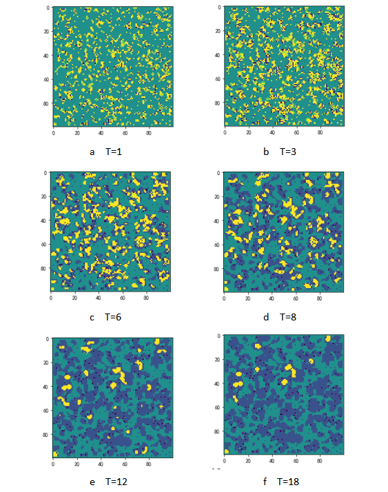 元胞自动机的定义在20世纪中叶,计算机之父冯・诺依曼创立了元胞自动机.元胞自动机由大量元胞组成,元胞间局部相互作用从而产生了整个系统的行为特征.以二维元胞自动机为例,元胞自动机是由元胞(格子)、元胞空间(网络)、邻居(临近元胞)、元胞演化规则(状态转换函数)和元胞状态(有限个)组成,如图1所示