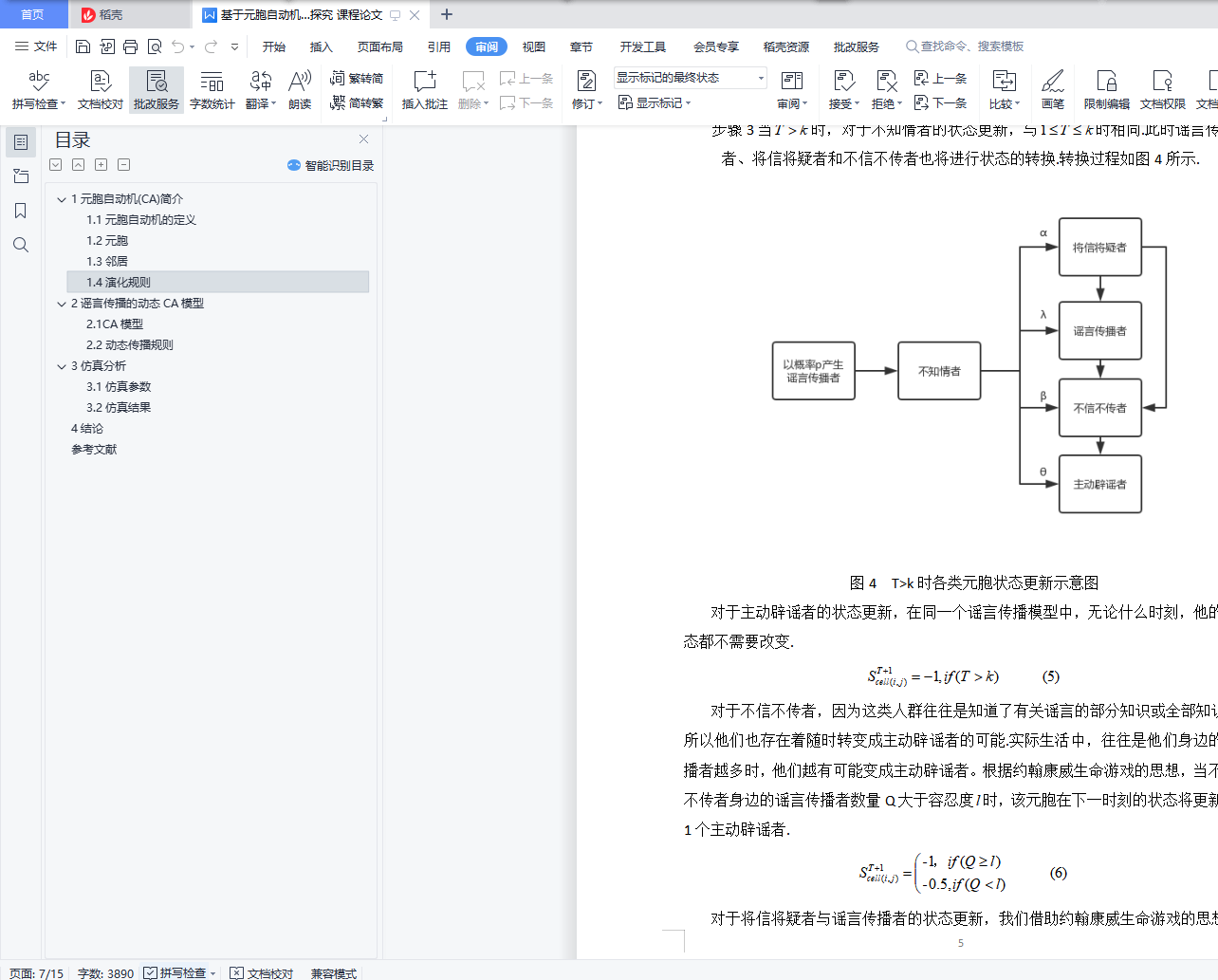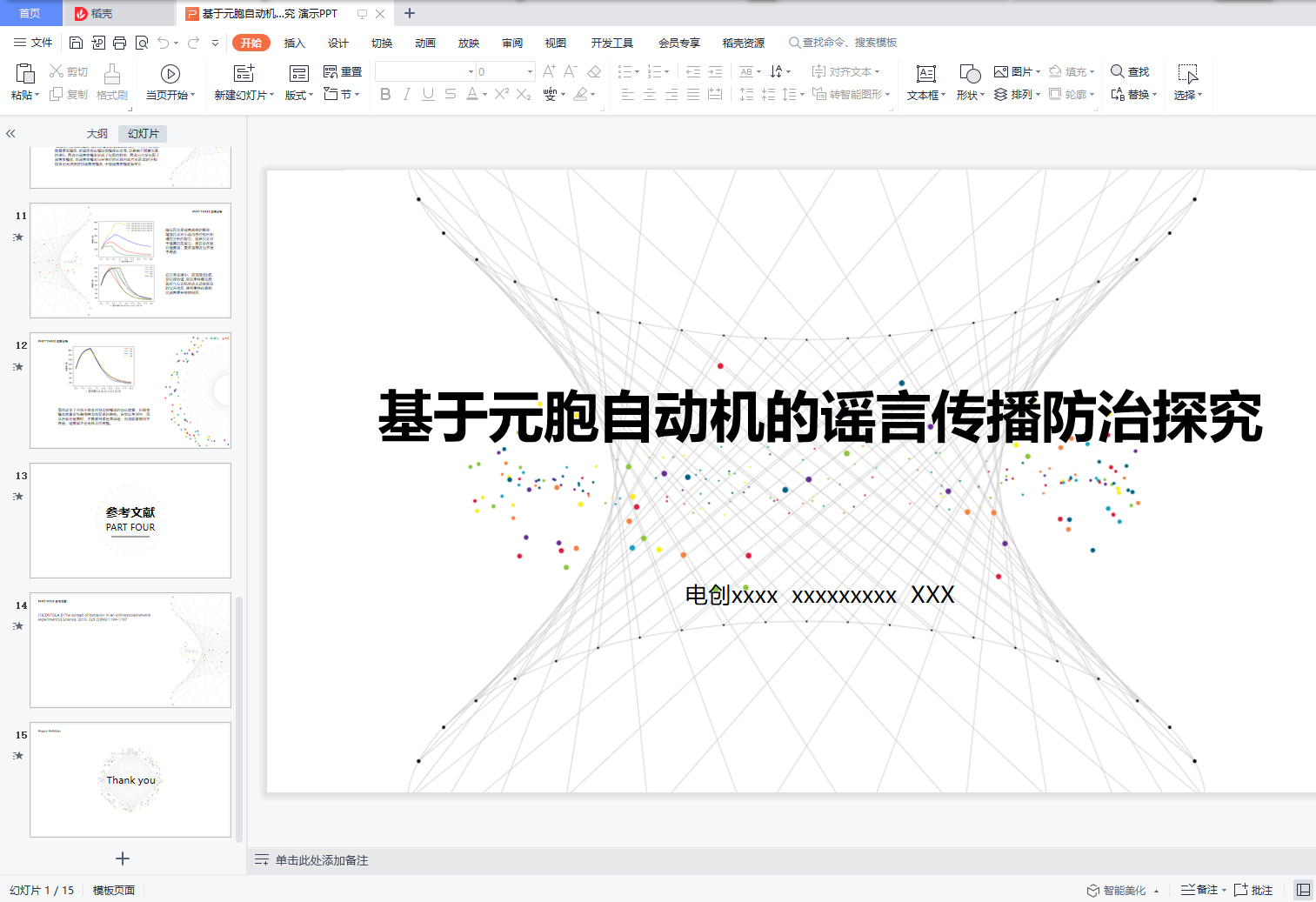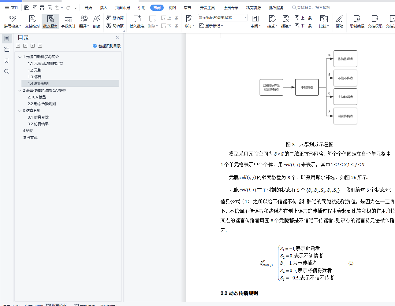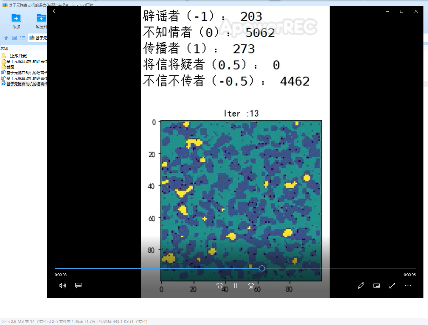 基于元胞自动机的谣言传播防治探究电创xxxx XXX xxxxxxxxx摘要:谣言的社会传播是一个典型的复杂系统。本文采用元胞自动机模型进行描述.利用元胞自动机模型,制定动态的元胞状态演变规则,更加真实地模拟谣言社会传播的过程。首先将元胞划分为谣言传播者、不知情者、将信将疑者、不信不传者和辟谣者5类对象,并对5类对象赋予不同的权值;其次,元胞状态的转变依赖于其周围8个邻元状态。仿真实验表明,民众不需要全部成为辟谣者,在面对谣言时,只要采取冷静的态度,客观分析,不信谣不传谣即可;谣言不会无休止地传播,传播者最终会因被不信不传者包围而使谣言无法继续传播;当传播者的状态因辟谣者的出现等方法而转变时,谣言的传播会逐渐停止,这种变化出现的越早,谣言传播停止的越早。关键词:元胞自动机、谣言传播、传播者、辟谣者目录1元胞自动机(CA)简介 11.1元胞自动机的定义 11.2元胞 11.3邻居 11.4演化规则 22谣言传播的动态CA模型 22.1CA模型 22.2动态传播规则 33仿真分析 73.1仿真参数 73.2仿真结果 74结论 11参考文献 12