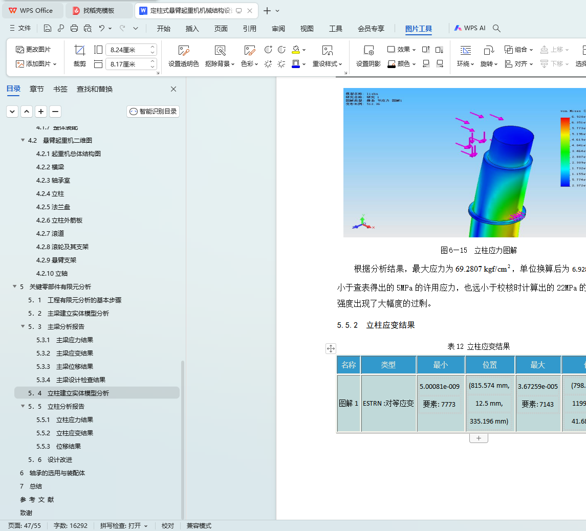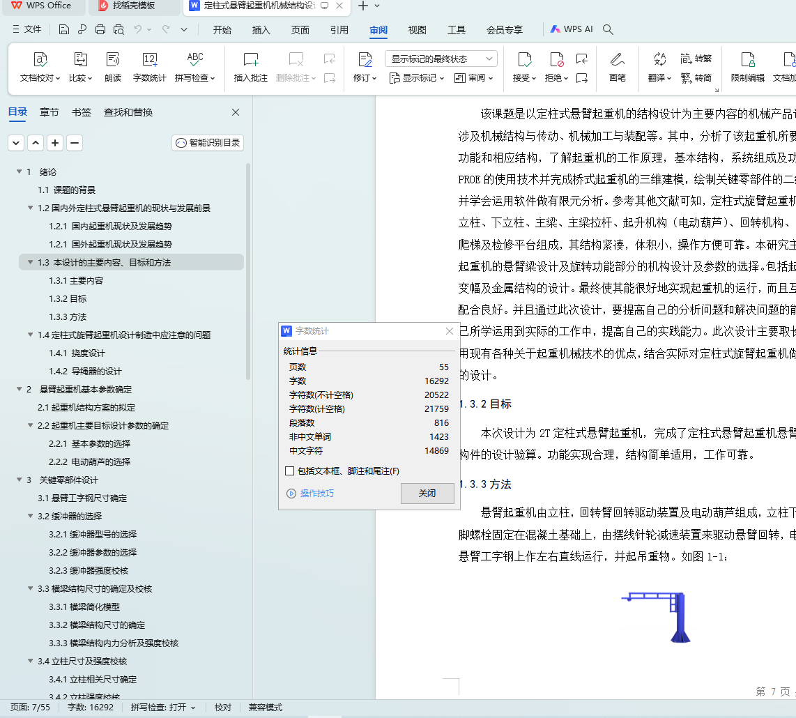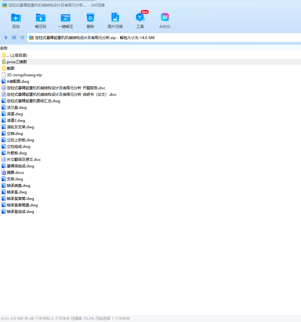 本设计从整体设计出发,依次设计计算了2t定柱式悬臂起重机的悬臂和立柱的主要机构部件。选取了螺栓,开式齿轮等主要零部件。设计了符合要求的悬臂结构,并校核了轴承,焊缝强度和转动轴键的强度和刚度等力学性能参数。在设计过程中,运用优化设计的方法,使各个结构尽量达到最合理的布置和选择。