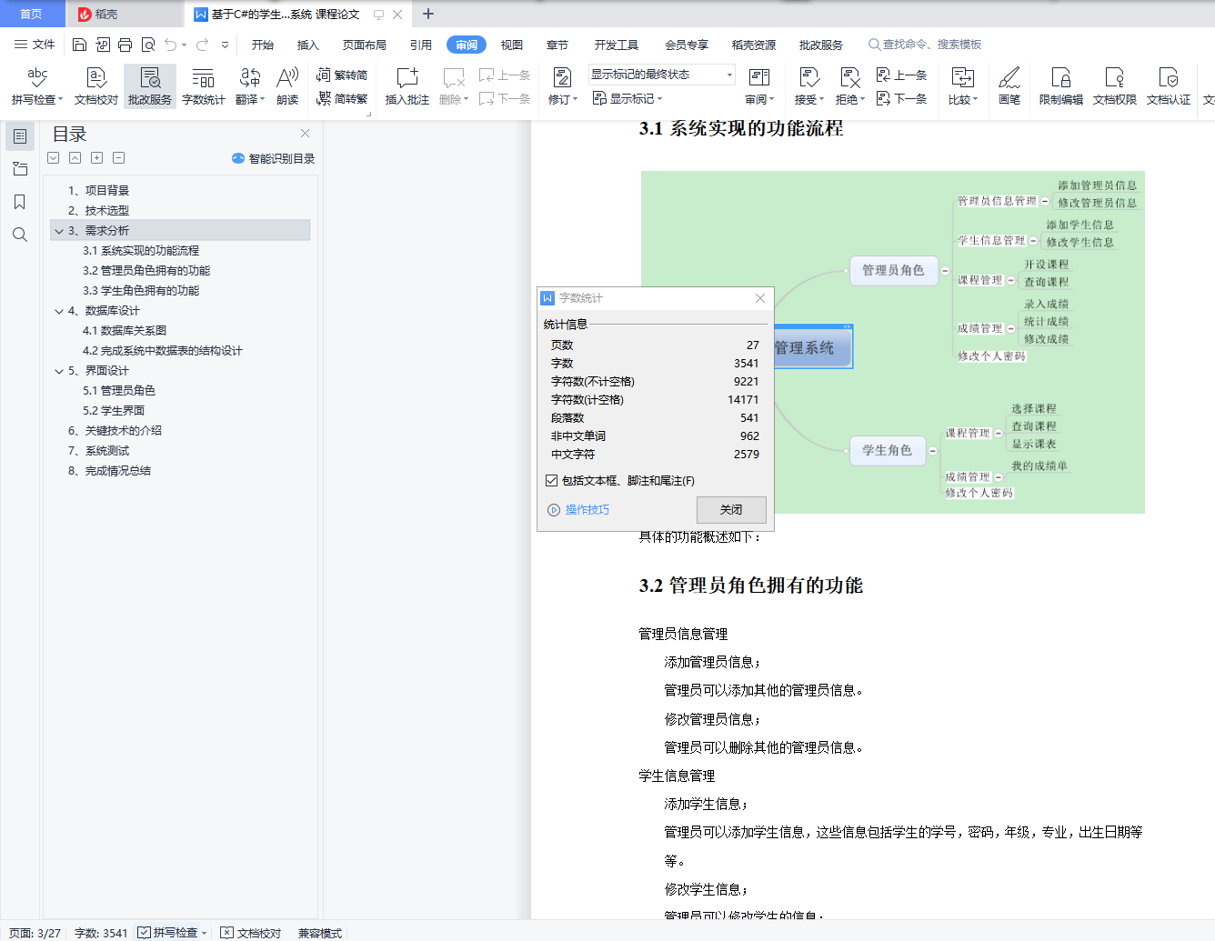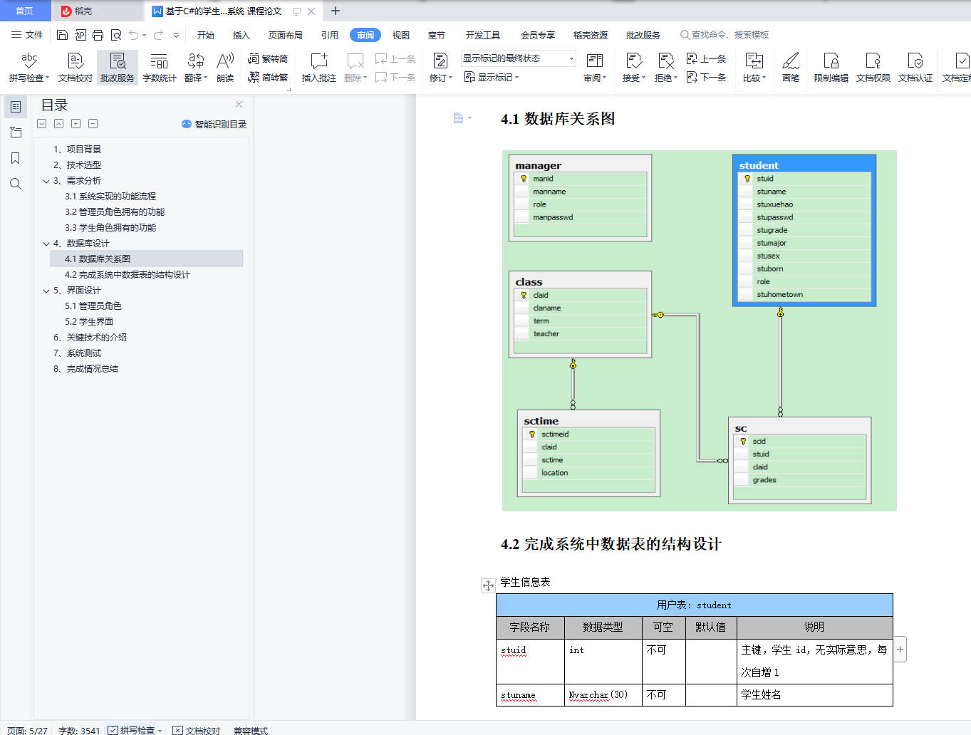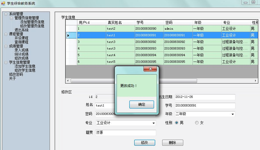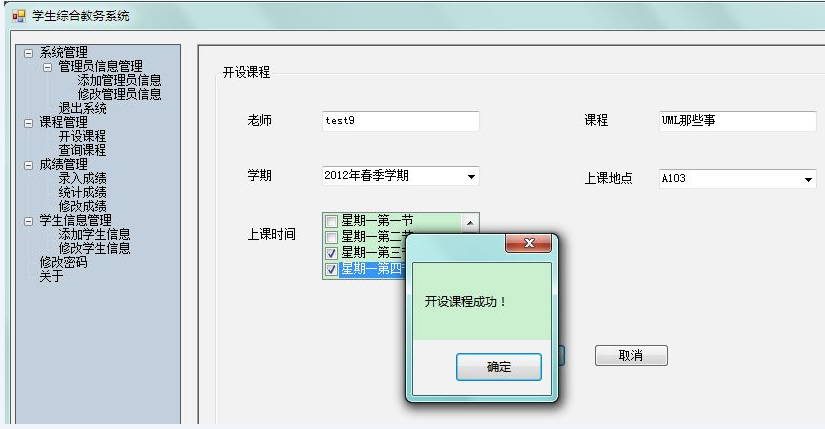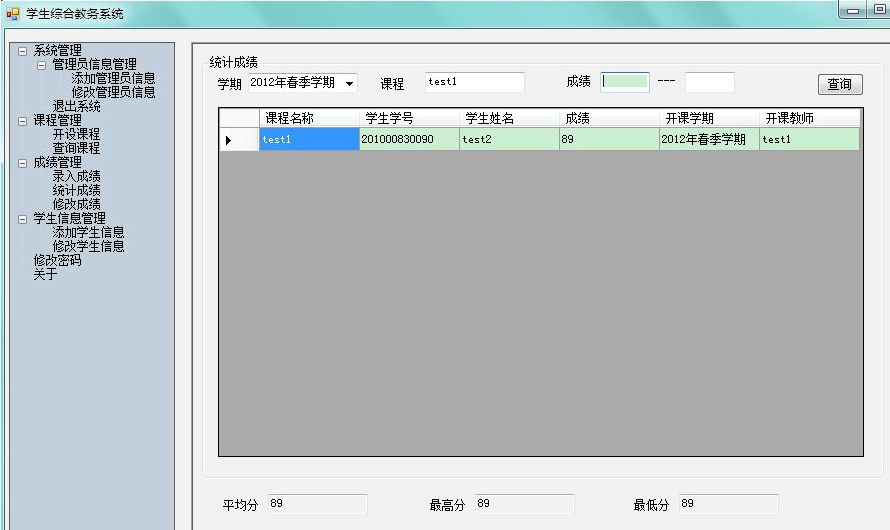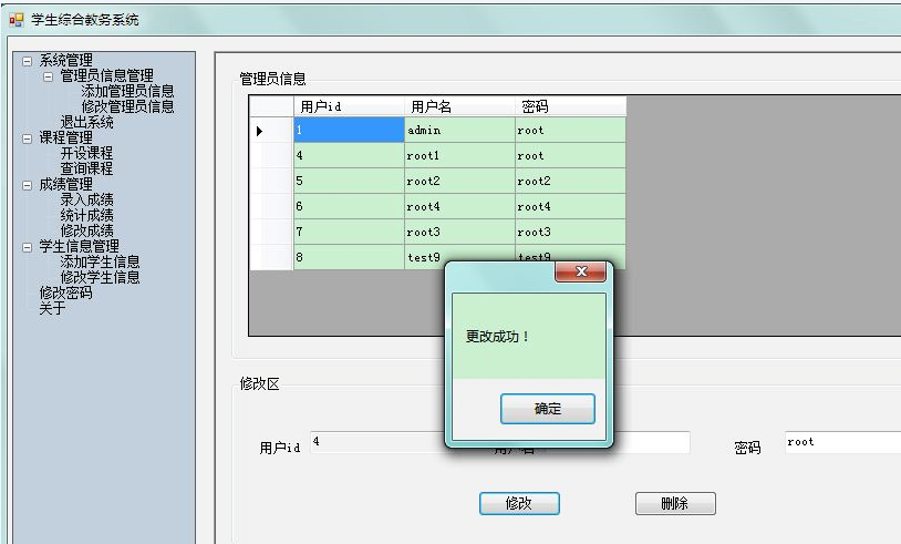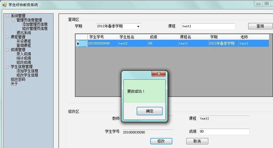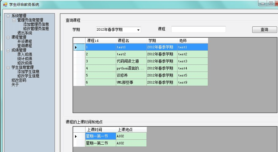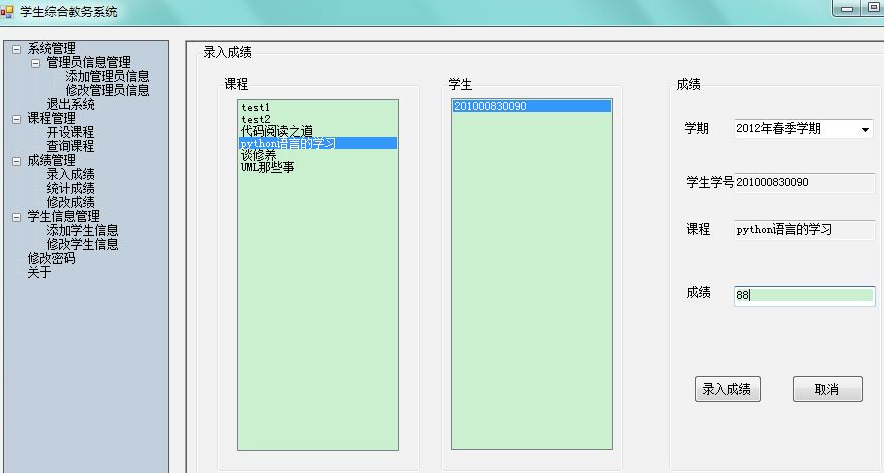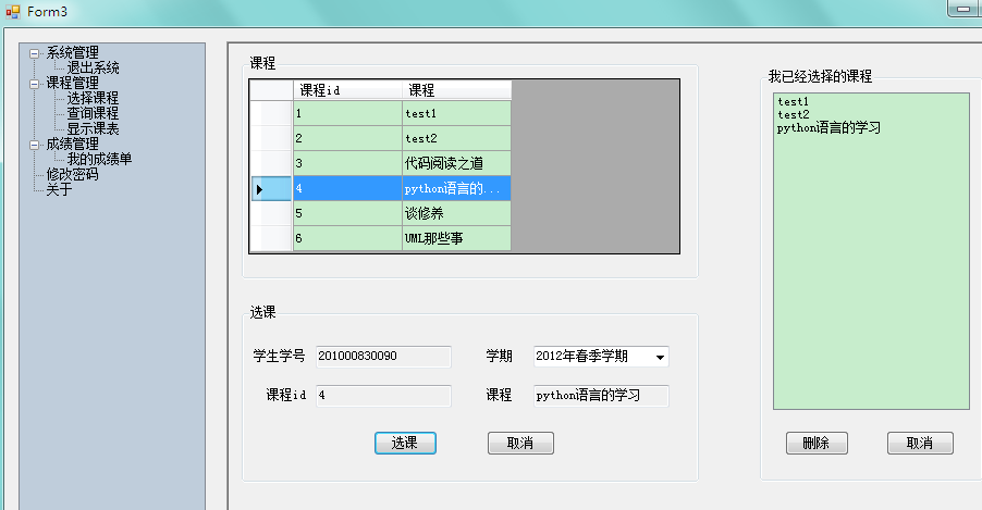 目录1、项目背景 12、技术选型 13、需求分析 23.1系统实现的功能流程 23.2管理员角色拥有的功能 23.3学生角色拥有的功能 34、数据库设计 44.1数据库关系图 44.2完成系统中数据表的结构设计 55、界面设计 65.1管理员角色 75.2学生界面 126、关键技术的介绍 157、系统测试 258、完成情况总结 261、项目背景学生选课及成绩查询系统是一个学校不可缺少的部分,传统的人工管理档案的方式存在着很多的缺点,如:效率低、保密性差等,所以开发一套综合教务系统管理软件很有必要,它应该具有传统的手工管理所无法比拟的优点,如:检索迅速、查找方便、可靠性高、存储量大、保密性好、寿命长、成本低等。这些优点能够极大的提高学校的管理效率,有助于推进学校的信息化建设。2、技术选型C#的窗体程序开发本系统未采用C#实现MDI――多文档窗口,因为考虑到C#的该技术与java类似,而暑期java实训时,曾用过类似的方法做过停车场管理系统,所以想为这次的系统注入一点新鲜的血液,所以本系统设计的主题采用了了C#的C#TreeView 实现。Sql server数据库3、需求分析本系统包括两类用户:学生、管理员。管理员可以通过系统来添加管理员信息、修改管理员信息、添加学生信息、修改学生信息;开设课程、查询课程、录入成绩、统计成绩、修改成绩、修改个人密码等,而学生则可以通过系统来选择课程、查询课程、显示自己的课表、查询自己的成绩单、修改个人密码等等。
