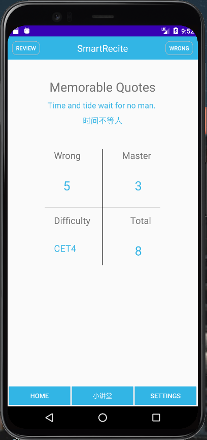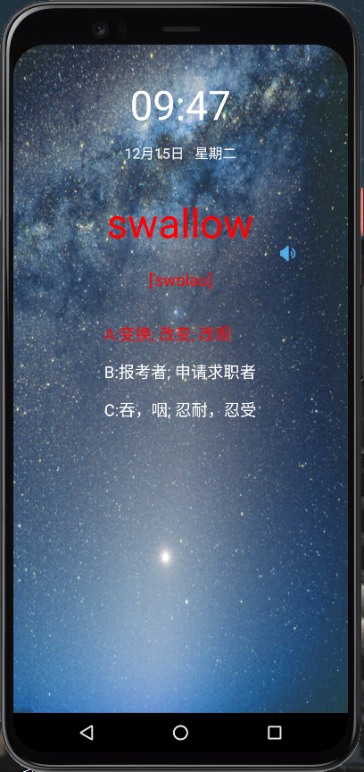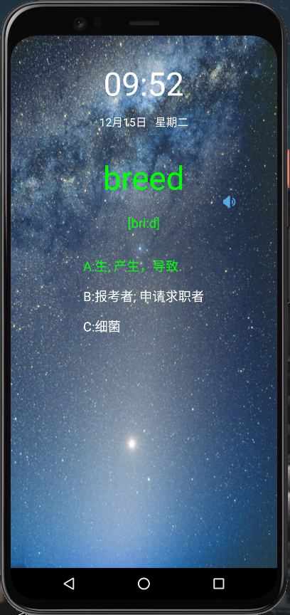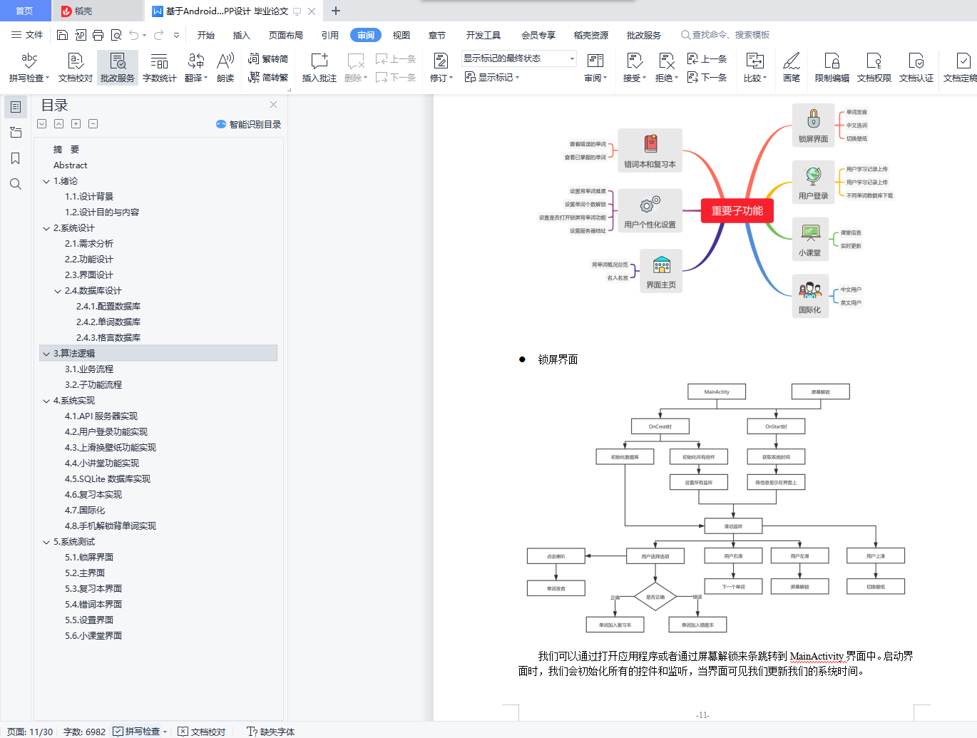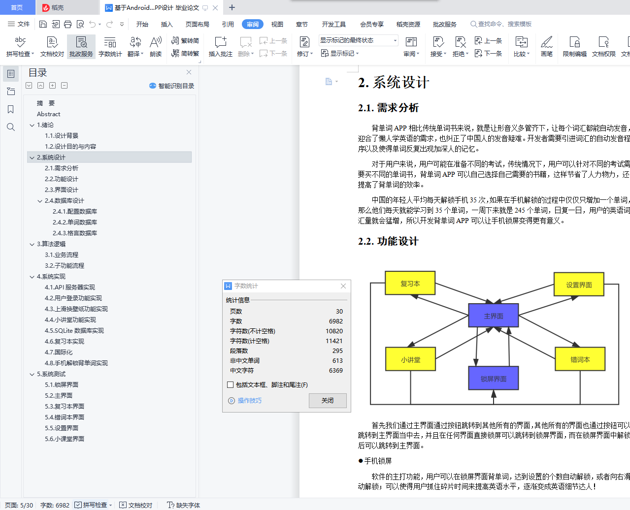 摘 要调查显示,我国的年轻人平均每天解锁屏幕35次,在解锁屏幕时背单词可以有效利用琐碎时间。本APP可以让用户通过对锁屏界面单词的拼写和发音来进行中文选词达到记忆单词的目的,当用户选择错误时,将单词加入错题本。同时支持切换壁纸、用户登录、错词和复习词上传、拉取数据功能、解锁需要的单词个数和选择词库难度等用户个性化设置,以此来实现多设备同步的功能,切合用户使用特点。本应用还提供了小讲堂功能,向用户推送最新的英语知识和英语技巧,给用户带来极大的便利。关键词:安卓应用开发;异步编程;网络编程;国际化;VCSAbstractAccording to a survey, young Chinese unlock their screens an average of 35 times a day, and memorising words while doing so can help them make the most of their time. This APP allows the user to memorize words by spelling and pronunciation of words on the lock screen. When the user makes a wrong choice, he/she adds words to the wrong text. At the same time, it supports user's personalized Settings such as wallpaper switching, user login, wrong word and review word uploading, pull data function, number of words needed to unlock, difficulty of selecting thesaurus, etc., so as to realize the function of multi-device synchronization and meet users' usage characteristics. The app also provides a small lecture room to push the latest English knowledge and Skills to users, which brings great convenience to users.Keywords: Android application development; asynchronous programming; network programming; internationalization; VCS目录摘 要 IAbstract II1. 绪论 41.1. 设计背景 41.2. 设计目的与内容 42. 系统设计 42.1. 需求分析 42.2. 功能设计 52.3. 界面设计 62.4. 数据库设计 72.4.1. 配置数据库 72.4.2. 单词数据库 72.4.3. 格言数据库 83. 算法逻辑 103.1. 业务流程 103.2. 子功能流程 114. 系统实现 154.1. API服务器实现 154.2. 用户登录功能实现 154.3. 上滑换壁纸功能实现 164.4. 小讲堂功能实现 174.5. SQLite数据库实现 184.6. 复习本实现 194.7. 国际化 194.8. 手机解锁背单词实现 195. 系统测试 205.1. 锁屏界面 205.2. 主界面 225.3. 复习本界面 235.4. 错词本界面 245.5. 设置界面 255.6. 小课堂界面 28