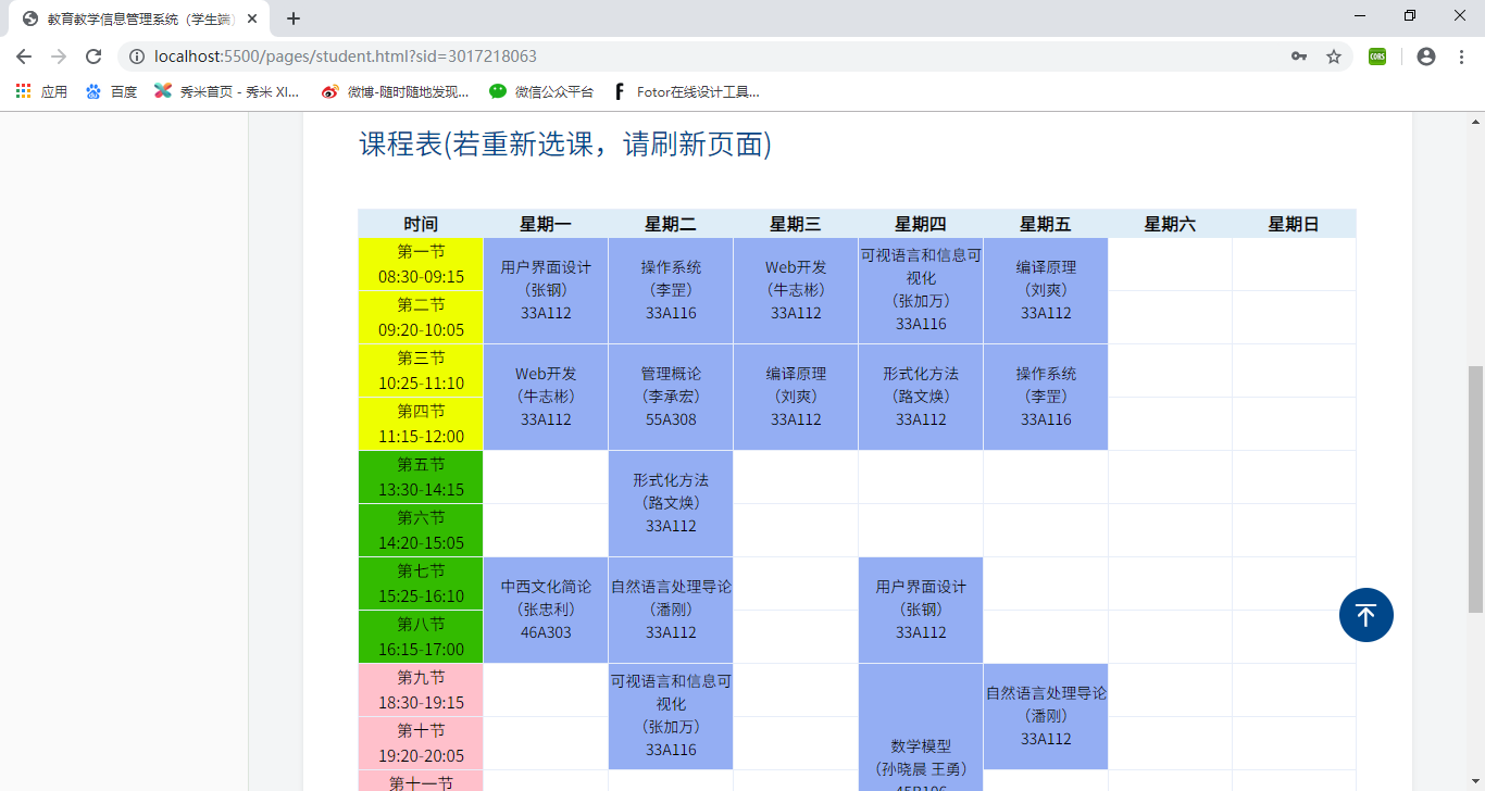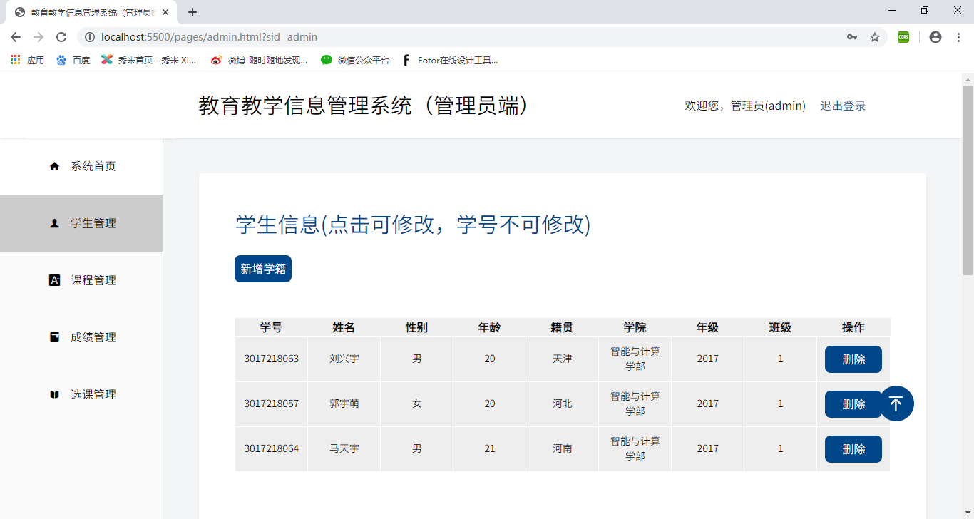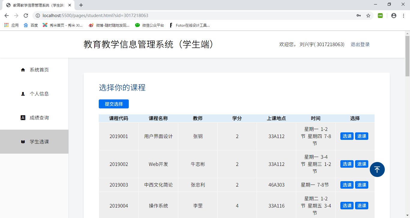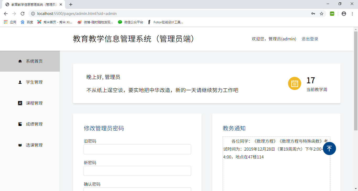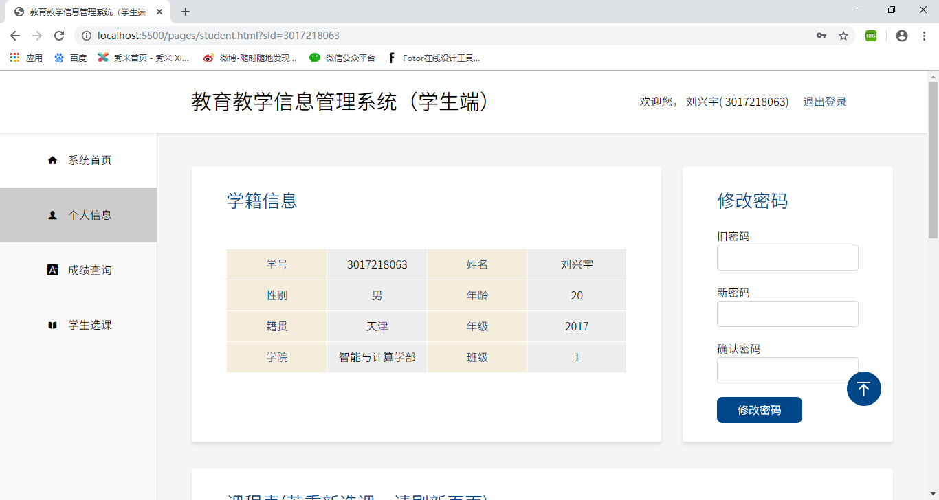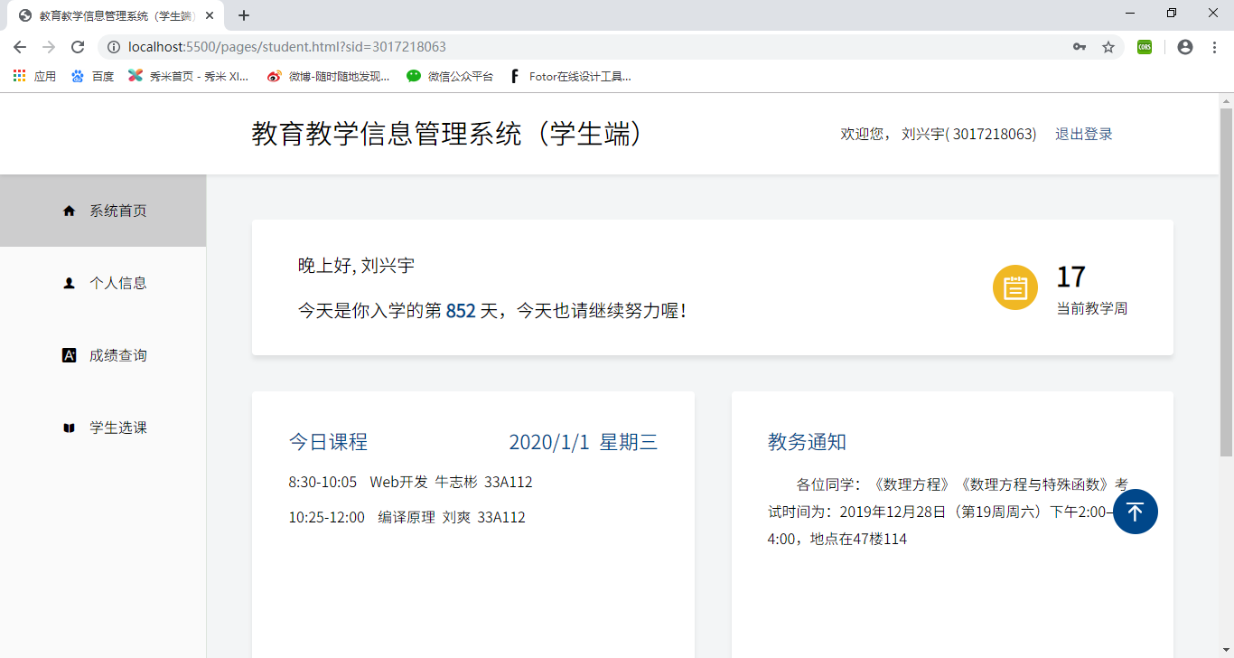 目录一、 实验目的 1二、实验内容 1三、实验步骤 11. 确定需求 12. 体系结构设计 23. 数据库设计 24. 后端 45. 前端设计 7四、实验结果 12五、实验结论 20一、实验目的本次实验题目为综合性的Web项目练习,自选题目实现全栈开发。我的作业题目是《教育教学信息管理系统》二、实验内容开发全栈Web项目天津大学教育教学信息管理系统,包括数据库设计、后端、前端三、实验步骤1. 确定需求系统分为管理员端和用户端。在登录界面可以选择学生登录或者教师登录、注册学生账号注册学生账号:只有注册了学籍的学生才可以使用学号注册账户学生登录需要先注册管理员登录拥有固定的密码学生端分为四个功能主页面:显示欢迎语、时间信息(入学天数和周数)、今日课程、教务通知个人信息:查看自己的学籍信息、课程表、修改密码成绩管理:查看各学期的加权成绩折线图、选择年份查看具体年份的成绩及雷达图选课管理:选课未开始不能选课,选课开始可以选课和退课,并且显示实时课程表管理员端分为五个功能主页面:显示欢迎语、时间信息、修改管理员密码、修改教务通知学生管理:添加学籍、修改学籍信息、删除学籍课程管理:添加课程、修改课程信息、删除课程成绩管理:登课程成绩、修改学生成绩、按课程或学生查看成绩统计信息选课管理:开始/停止选课,为特定学生选课并实时显示课程表