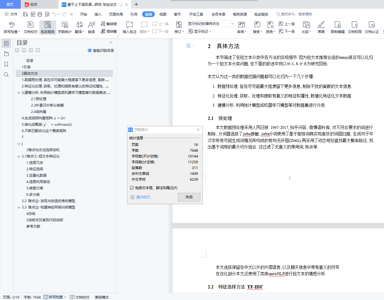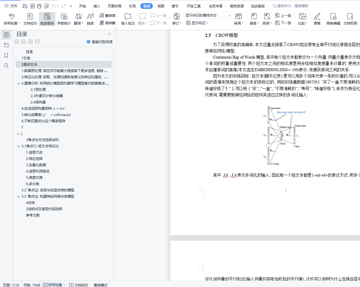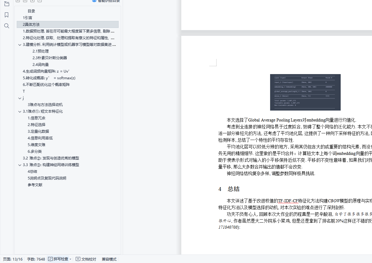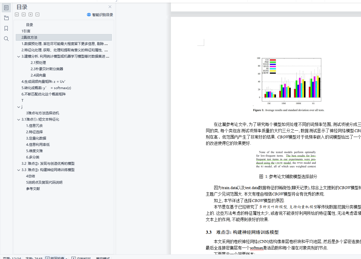 为短文本推荐合适的emoji ― 基于上下词及语境的CBOW多层神经网络分类模型研究Abstract Aiming at the feature sparsity and context dependence of short texts, this paper proposes a short text classification method based on CBOW multilayer neural network. Using the sentiment tendency of short text itself, this paper adopts TF-IDF-CF characterization method, on the other hand, associates the short text context with the CBOW model to optimize the emoji of the chat data. Experiments show that this hybrid model is higher in classification performance better than the traditional Bayesian or SVM classification model. In the Kaggle competition private leaderboard it achieved a higher accuracy of 0.17554.Key words Short text classification CBOW model Improved weight TF-IDF-CF method Multi-layer neural network classification Data Mining摘要 针对短文本的特征稀疏性和上下文依赖性等特点, 本文提出一种基于CBOW多层神经网络的短文本分类方法. 利用短文本本身的情感倾向, 一方面采用改进权值的TF-IDF-CF特征化方法, 另一方面关联短文本上下文语境运用CBOW模型对聊天数据进行最优emoji推荐. 实验表明这种混合模型在分类性能上比传统的贝叶斯或支持向量机分类模型高出很多, 在Kaggle竞赛private榜上取得0.17554的较高准确率.关键词 短文本分类 CBOW模型 改进权值TF-IDF-CF方法 多层神经网络分类 数据挖掘目录1引言 22具体方法 22.1预处理 22.2特征选择方法 TF-IDF 32.3朴素贝叶斯分类器 32.4词向量 42.5CBOW模型 52.5.1CBOW模型实现细节 63难点与方法选择动机 73.1难点①: 短文本特征化 73.1.1改进权值的TF-IDF方法选择动机 93.2难点②: 发现与创造优秀的模型 103.2.1CBOW模型选择动机 103.3难点③: 构建神经网络训练模型 114 总结 125 说明点及复现代码说明 13