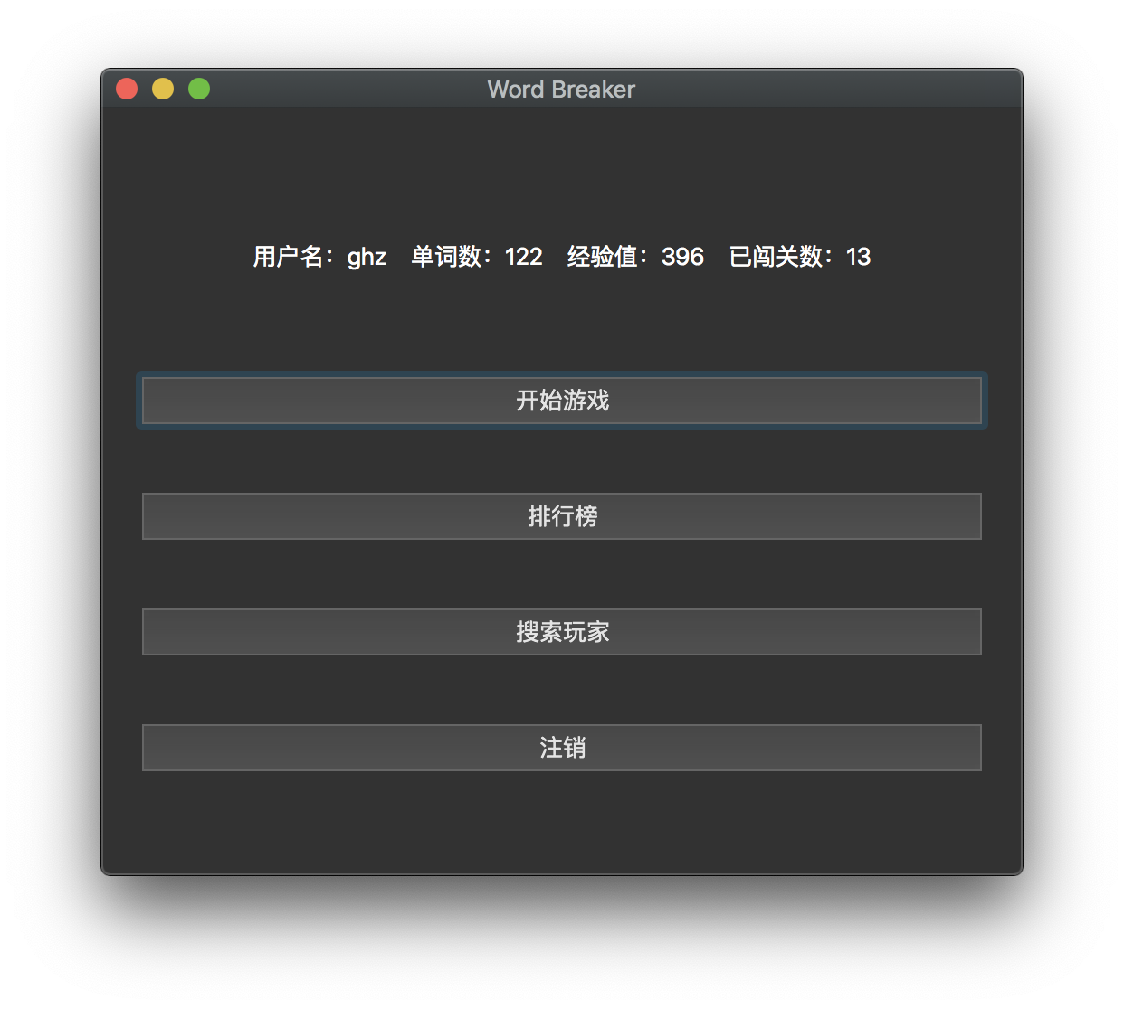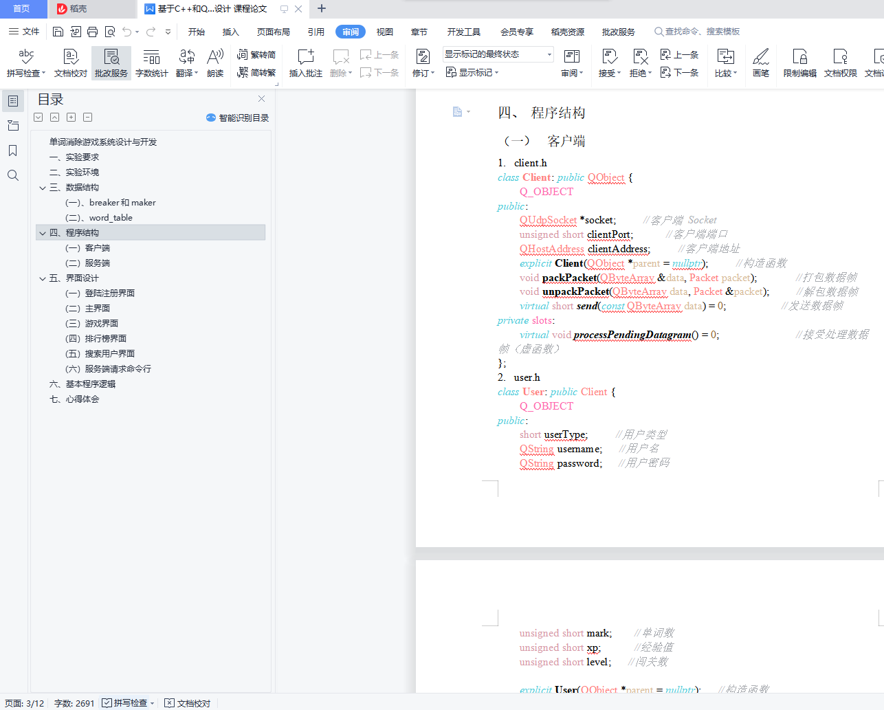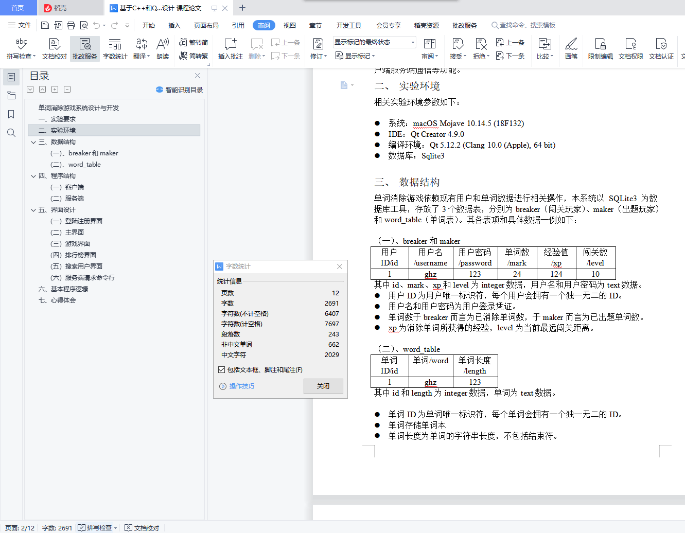 单词消除游戏系统设计与开发目录单词消除游戏系统设计与开发 1一、 实验要求 1二、 实验环境 1三、 数据结构 1(一)、breaker和maker 2(二)、word_table 2四、 程序结构 2(一) 客户端 2(二) 服务端 4五、 界面设计 6(一) 登陆注册界面 6(二) 主界面 7(三) 游戏界面 8(四) 排行榜界面 9(五) 搜索用户界面 10(六) 服务端请求命令行 11六、 基本程序逻辑 12七、 心得体会 12一、实验要求使用面向对象编程的思想完成一个单词消除游戏。游戏由两类参与者组成:闯关者(即游戏玩家),出题者(为游戏增加游戏中使用单词)。游戏规则为,游戏每一轮,程序会根据该关卡难度,显示一个单词,一定时间后单词消失。闯关者需要在相应地方输入刚刚显示并消失的单词,如果闯关者输入正确(即闯关者输入的单词与刚刚显示的单词完全一致,包含大小写)则为通过。一关可以由一轮或者多轮组成。在基本游戏规则的基础上,课程设计还需学生扩展玩家注册登陆,查询,CS客户端服务端通信等功能。二、实验环境相关实验环境参数如下:系统:macOS Mojave 10.14.5 (18F132)IDE:Qt Creator 4.9.0编译环境:Qt 5.12.2 (Clang 10.0 (Apple), 64 bit)数据库:Sqlite3三、数据结构单词消除游戏依赖现有用户和单词数据进行相关操作,本系统以 SQLite3 为数据库工具,存放了3个数据表,分别为breaker(闯关玩家)、maker(出题玩家)和word_table(单词表)。其各表项和具体数据一例如下: