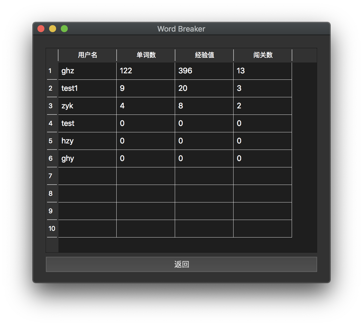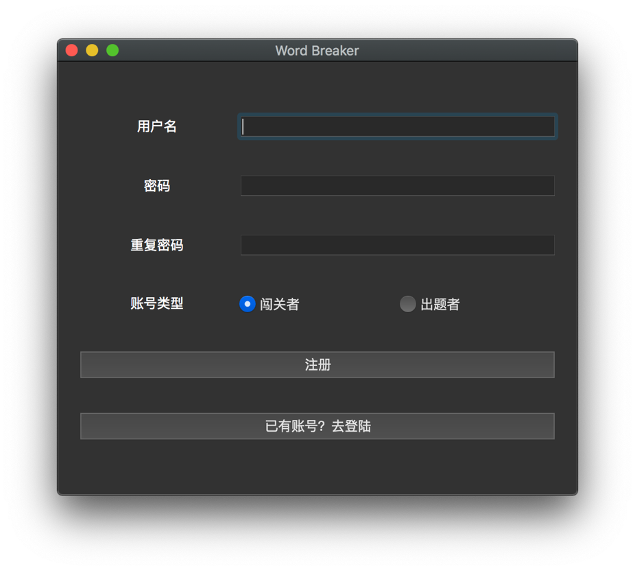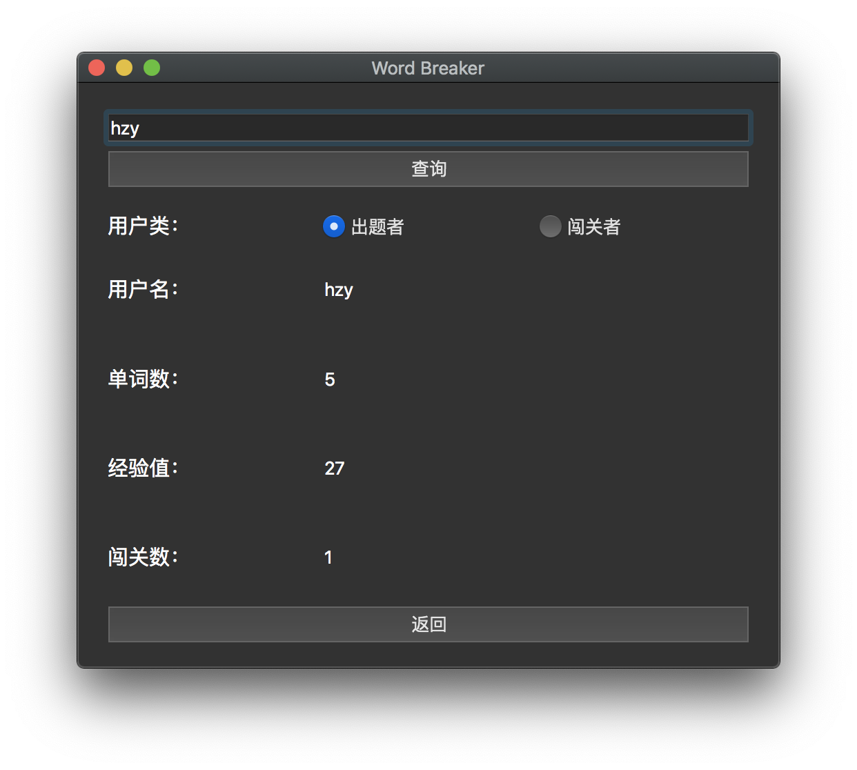 单词消除游戏系统设计与开发目录单词消除游戏系统设计与开发 1一、 实验要求 1二、 实验环境 1三、 数据结构 1(一)、breaker和maker 2(二)、word_table 2四、 程序结构 2(一) 客户端 2(二) 服务端 4五、 界面设计 6(一) 登陆注册界面 6(二) 主界面 7(三) 游戏界面 8(四) 排行榜界面 9(五) 搜索用户界面 10(六) 服务端请求命令行 11六、 基本程序逻辑 12七、 心得体会 12一、实验要求使用面向对象编程的思想完成一个单词消除游戏。游戏由两类参与者组成:闯关者(即游戏玩家),出题者(为游戏增加游戏中使用单词)。游戏规则为,游戏每一轮,程序会根据该关卡难度,显示一个单词,一定时间后单词消失。闯关者需要在相应地方输入刚刚显示并消失的单词,如果闯关者输入正确(即闯关者输入的单词与刚刚显示的单词完全一致,包含大小写)则为通过。一关可以由一轮或者多轮组成。在基本游戏规则的基础上,课程设计还需学生扩展玩家注册登陆,查询,CS客户端服务端通信等功能。二、实验环境相关实验环境参数如下:系统:macOS Mojave 10.14.5 (18F132)IDE:Qt Creator 4.9.0编译环境:Qt 5.12.2 (Clang 10.0 (Apple), 64 bit)数据库:Sqlite3三、数据结构单词消除游戏依赖现有用户和单词数据进行相关操作,本系统以 SQLite3 为数据库工具,存放了3个数据表,分别为breaker(闯关玩家)、maker(出题玩家)和word_table(单词表)。其各表项和具体数据一例如下: