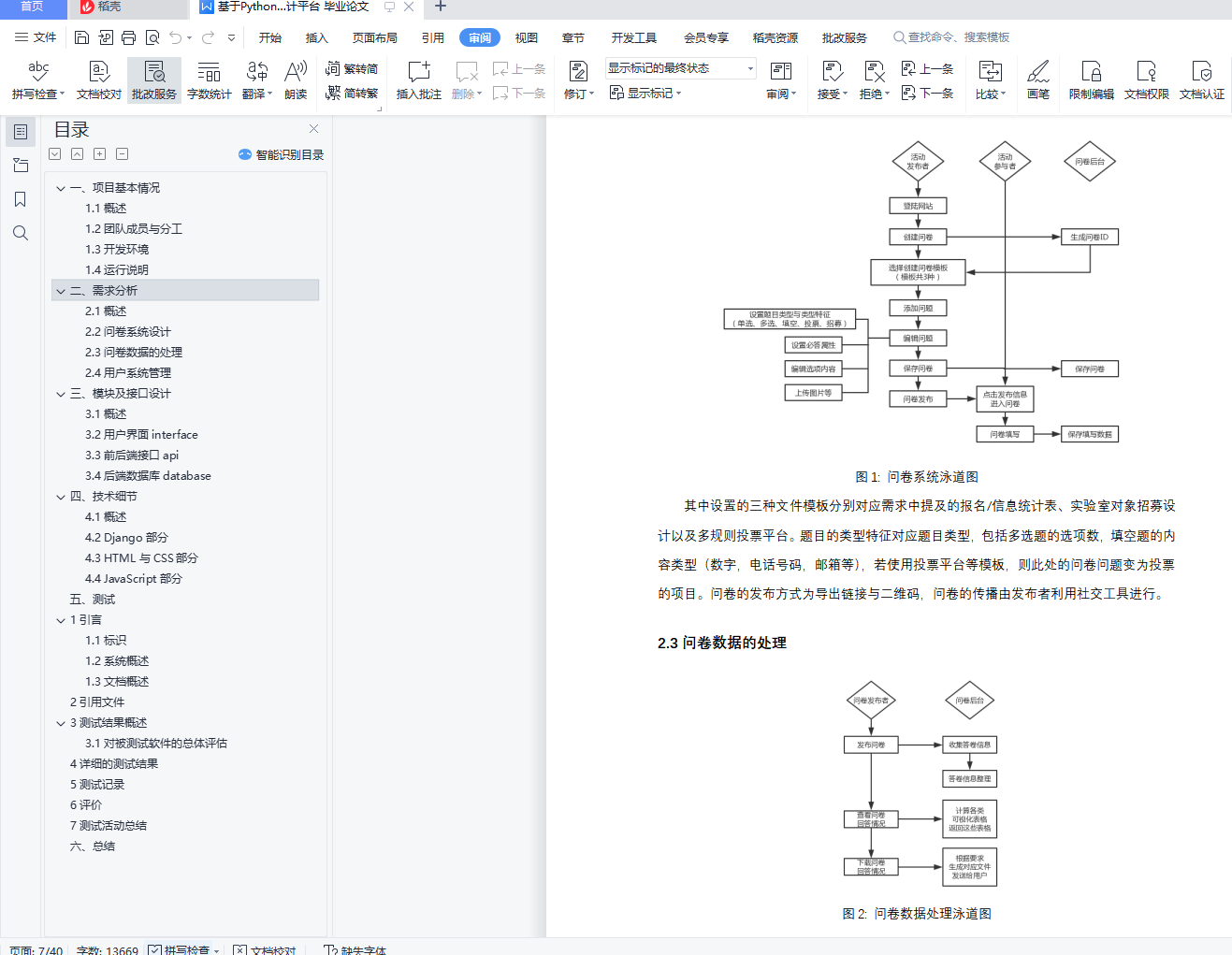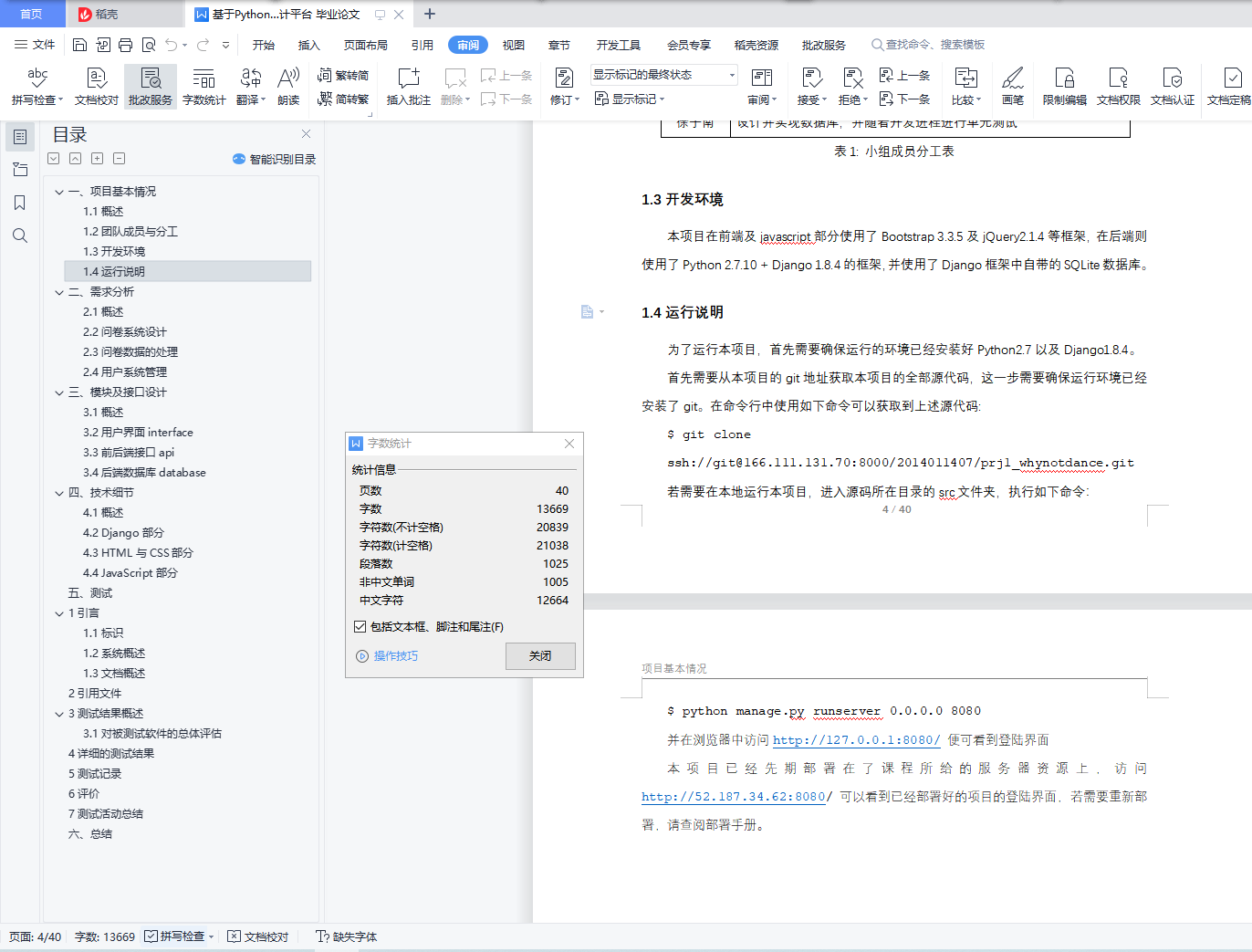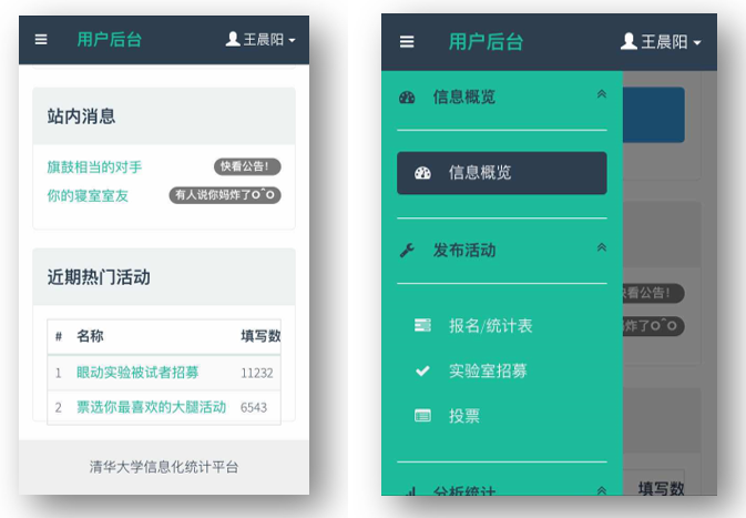 目录一、项目基本情况 41.1概述 41.2团队成员与分工 41.3开发环境 41.4运行说明 4二、需求分析 62.1概述 62.2问卷系统设计 72.3问卷数据的处理 72.4用户系统管理 8三、模块及接口设计 93.1概述 93.2用户界面interface 93.3前后端接口api 103.4后端数据库database 11四、技术细节 134.1概述 134.2 Django部分 134.3 HTML与CSS部分 234.4 JavaScript部分 27五、总结 36一、项目基本情况1.1概述本项目以大学为预期用户,作为校内信息化统计平台进行服务,建立网页端和移动端校内信息化统计平台,基于Project_1的需求实现。本项目能够满足校内学生团体的几类统计需求,如活动报名、实验室招募、多规则投票;对于收集到的数据可以进行一定的统计、分析,并且将分析结果进行可视化的展示,为提升校园工作的效率和数据的安全性供帮助。同时也为公司和校外团队提供服务。1.2团队成员与分工本项目的开发小组名为whyNotDance,组员共为4人,组长为王晨阳,具体分工如下:成员名 分工王晨阳 设计整体架构,负责前端页面的设计与实现以及前后端沟通的设计何熙巽 实现整体架构,实现前端部分页面,实现前后端沟通及用户体验优化田文龙 实现部分前端页面,实现部分前后端数据接口徐子南 设计并实现数据库,并随着开发进程进行单元测试表1: 小组成员分工表1.3开发环境本项目在前端及javascript部分使用了Bootstrap 3.3.5及jQuery2.1.4等框架,在后端则使用了Python 2.7.10 + Django 1.8.4的框架,并使用了Django框架中自带的SQLite数据库。1.4运行说明为了运行本项目,首先需要确保运行的环境已经安装好Python2.7以及Django1.8.4。首先需要从本项目的git地址获取本项目的全部源代码,这一步需要确保运行环境已经安装了git。在命令行中使用如下命令可以获取到上述源代码:$ git clone ssh://git@166.111.131.70:8000/2014011407/prj1_whynotdance.git若需要在本地运行本项目,进入源码所在目录的src文件夹,执行如下命令:$ python manage.py runserver 0.0.0.0 8080并在浏览器中访问http://127.0.0.1:8080/ 便可看到登陆界面本项目已经先期部署在了课程所给的服务器资源上,访问http://52.187.34.62:8080/ 可以看到已经部署好的项目的登陆界面,若需要重新部署,请查阅部署手册。