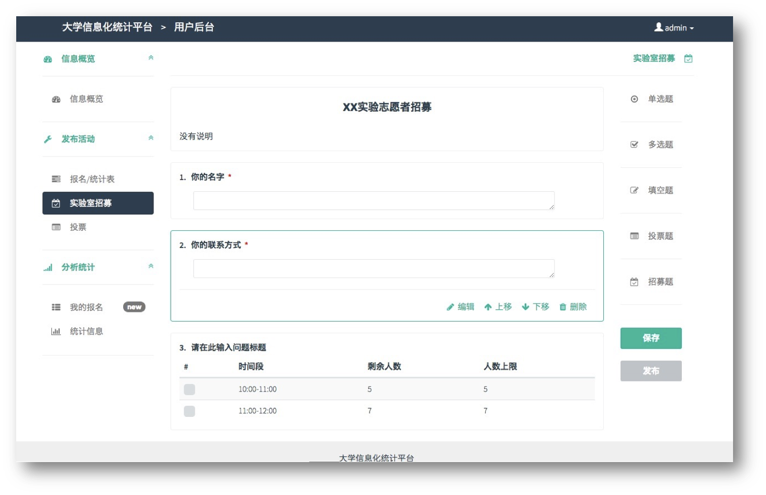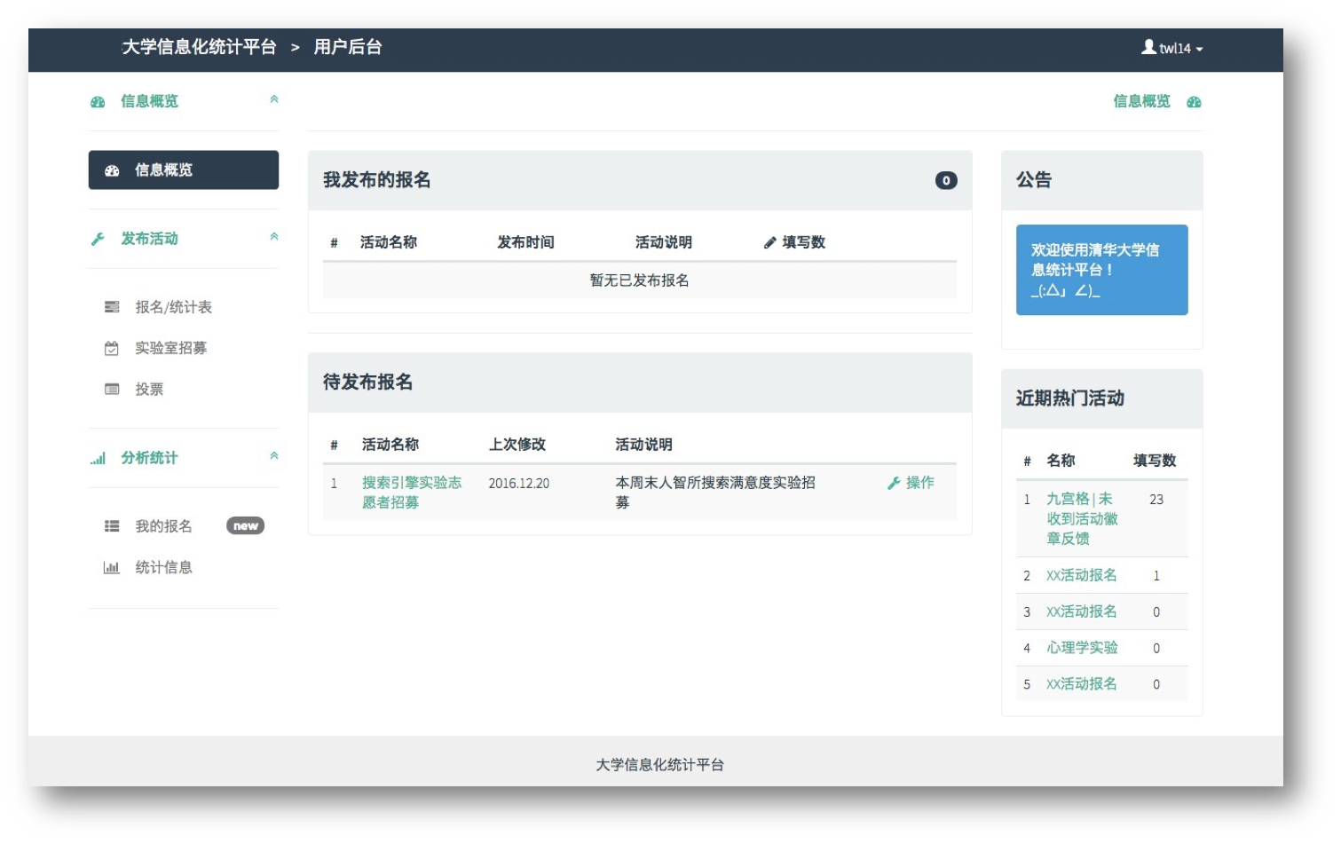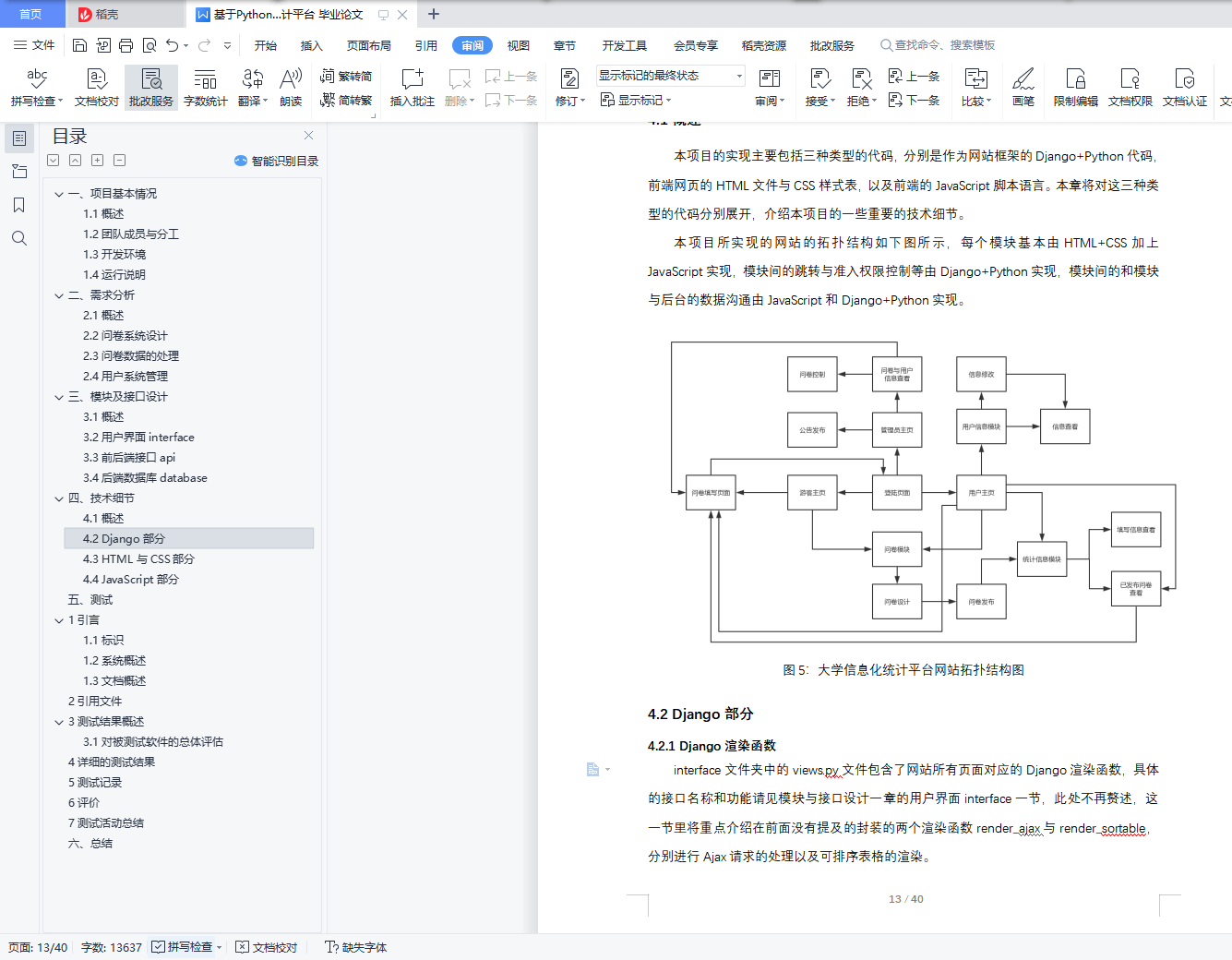 目录一、项目基本情况 41.1概述 41.2团队成员与分工 41.3开发环境 41.4运行说明 4二、需求分析 62.1概述 62.2问卷系统设计 72.3问卷数据的处理 72.4用户系统管理 8三、模块及接口设计 93.1概述 93.2用户界面interface 93.3前后端接口api 103.4后端数据库database 11四、技术细节 134.1概述 134.2 Django部分 134.3 HTML与CSS部分 234.4 JavaScript部分 27五、总结 36一、项目基本情况1.1概述本项目以大学为预期用户,作为校内信息化统计平台进行服务,建立网页端和移动端校内信息化统计平台,基于Project_1的需求实现。本项目能够满足校内学生团体的几类统计需求,如活动报名、实验室招募、多规则投票;对于收集到的数据可以进行一定的统计、分析,并且将分析结果进行可视化的展示,为提升校园工作的效率和数据的安全性供帮助。同时也为公司和校外团队提供服务。1.2团队成员与分工本项目的开发小组名为whyNotDance,组员共为4人,组长为王晨阳,具体分工如下:成员名 分工王晨阳 设计整体架构,负责前端页面的设计与实现以及前后端沟通的设计何熙巽 实现整体架构,实现前端部分页面,实现前后端沟通及用户体验优化田文龙 实现部分前端页面,实现部分前后端数据接口徐子南 设计并实现数据库,并随着开发进程进行单元测试表1: 小组成员分工表1.3开发环境本项目在前端及javascript部分使用了Bootstrap 3.3.5及jQuery2.1.4等框架,在后端则使用了Python 2.7.10 + Django 1.8.4的框架,并使用了Django框架中自带的SQLite数据库。1.4运行说明为了运行本项目,首先需要确保运行的环境已经安装好Python2.7以及Django1.8.4。首先需要从本项目的git地址获取本项目的全部源代码,这一步需要确保运行环境已经安装了git。在命令行中使用如下命令可以获取到上述源代码:$ git clone ssh://git@166.111.131.70:8000/2014011407/prj1_whynotdance.git若需要在本地运行本项目,进入源码所在目录的src文件夹,执行如下命令:$ python manage.py runserver 0.0.0.0 8080并在浏览器中访问http://127.0.0.1:8080/ 便可看到登陆界面本项目已经先期部署在了课程所给的服务器资源上,访问http://52.187.34.62:8080/ 可以看到已经部署好的项目的登陆界面,若需要重新部署,请查阅部署手册。
