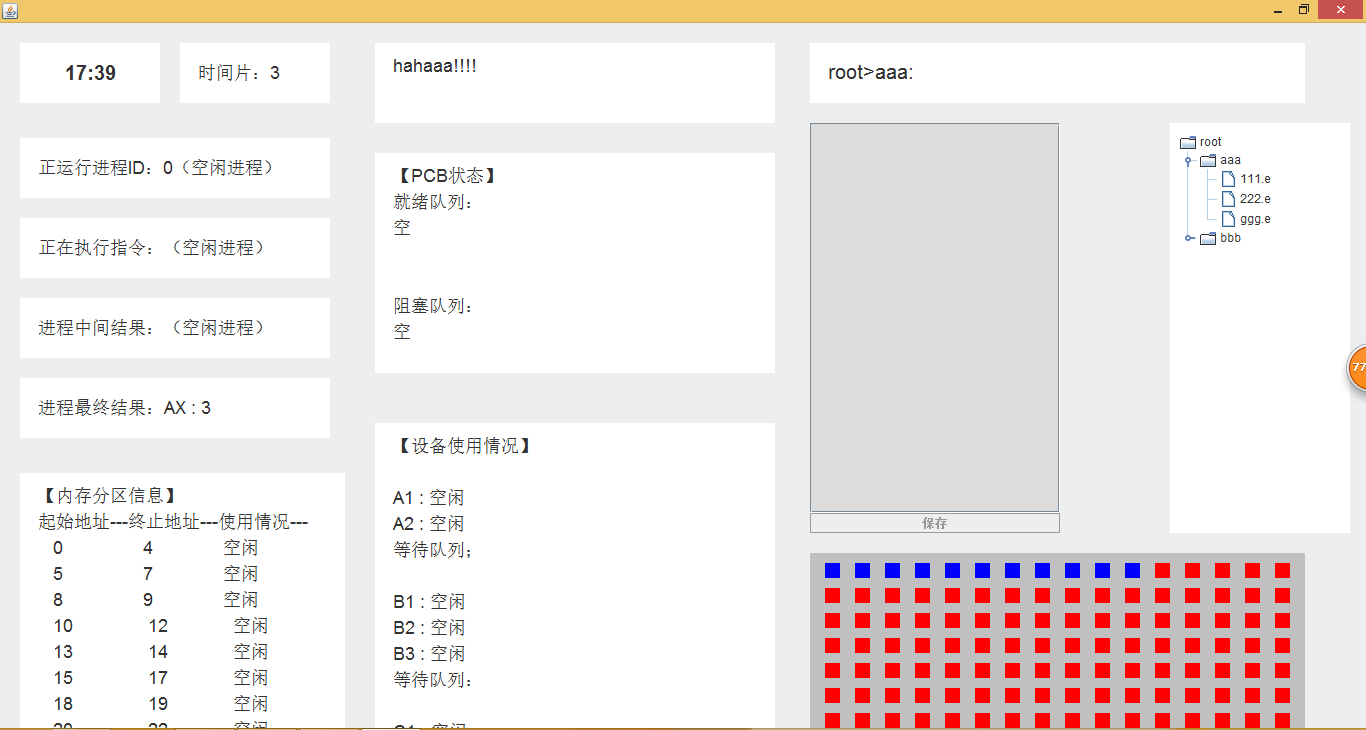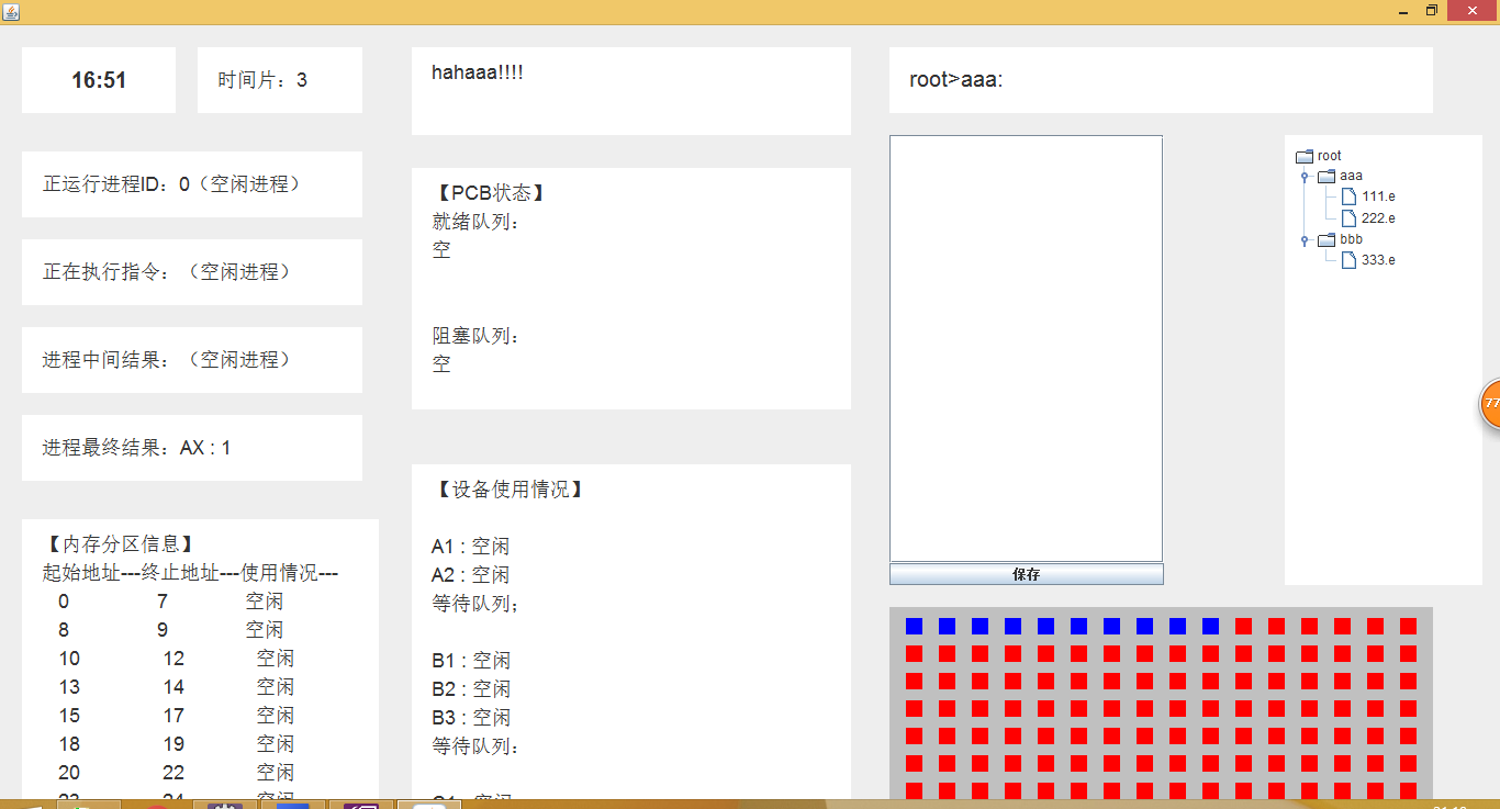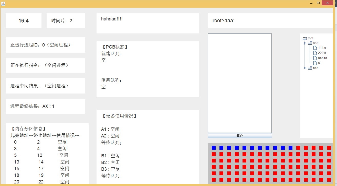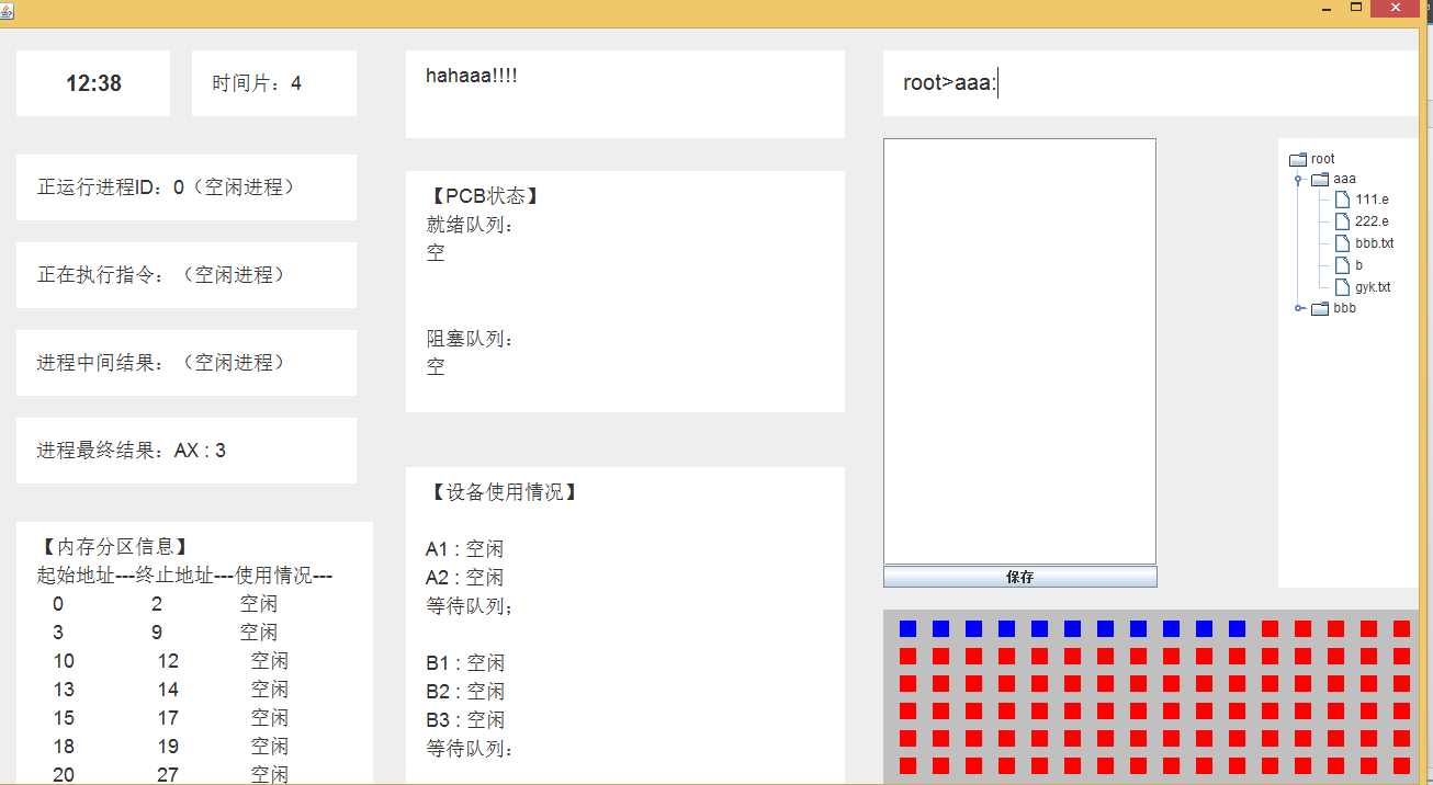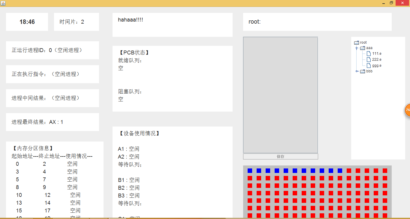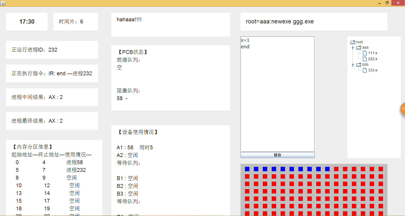 目录一、 需求分析 1二、 概要设计 4三、 详细设计 4四、 调试分析 12五、 用户使用说明 13六、 测试与运行结果 14一、需求分析明确陈述说明程序设计的任务,强调的是程序要做什么,主要包括:任务要求:模拟一个采用多道程序设计方法的单用户操作系统,该操作系统包括进程管理、存储管理、设备管理、文件管理和用户接口四部分。(1)输入的形式和输入值的范围;①从用户界面输入字符串形式的8个命令,如下:1.创建文件: create2.删除文件: delete3.显示文件: type4.拷贝文件: copy5.建立目录: mkdir6.删除空目录: rmdir7.进入退出某个目录::cd8.新建可执行文件:newexecreate新建文件时,type打开文件,从用户界面输入文本内容,并点击保存。目前仅支持第一次保存,暂不支持修改。(2)输出的形式;①进程管理部分系统时间,相对时钟(时间片)、正运行进程ID、正在执行指令、进程中间执行结果、进程最终结果以及就绪队列、阻塞队列(均以字符串形式输出并显示于用户界面)②存储管理部分内存分区情况(列表形式输出显示)③设备管理部分A、B、C三种设备的使用情况和相应等待使用的进程ID(列表形式输出显示)④文件管理部分文件树状目录、文本文件的内容和磁盘使用情况(文件内容字符串形式输出显示,单个磁盘用红蓝小方块表示)⑤用户接口部分显示软件系统的界面(3)程序所能达到的功能;总体功能:实现一个采用多道程序设计方法的单用户操作系统,包括进程管理、存储管理、设备管理、文件管理和用户接口四部分。①进程管理部分功能1.实现简单的CPU,包括指令的读取、解析、执行等2.实现系统时钟,控制CPU和系统的节拍3.实现主要的寄存器4.进程管理主要包括进程调度、进程的创建和撤销、进程的阻塞和唤醒, 中断作用的实现②存储管理部分功能1.划分系统区和用户区2.实现内存空间的分配和回收、存储保护(采用动态分区存储管理和首次适配)③设备管理部分功能1.实现设备的分配和回收,可实现进程的阻塞和唤醒,并管理等待设备的进程2.设备使用倒计时来表示占用某个设备④文件管理部分功能1.实现了进入退出目录、新建文件、删除文件、复制文件、删除空目录、新建exe文件、读取文件。2.显示文件目录树3.显示磁盘使用情况,红色表示未被占用,蓝色表示已经被占用。⑤用户接口部分1.将进程执行中的各种状态、数据以及内存、磁盘使用情况显示出来2.可输入各种文件命令,响应并显示各种文件命令操作(4)测试数据:包括正确的输入及其输出结果和含有错误的输入及其输出结果。