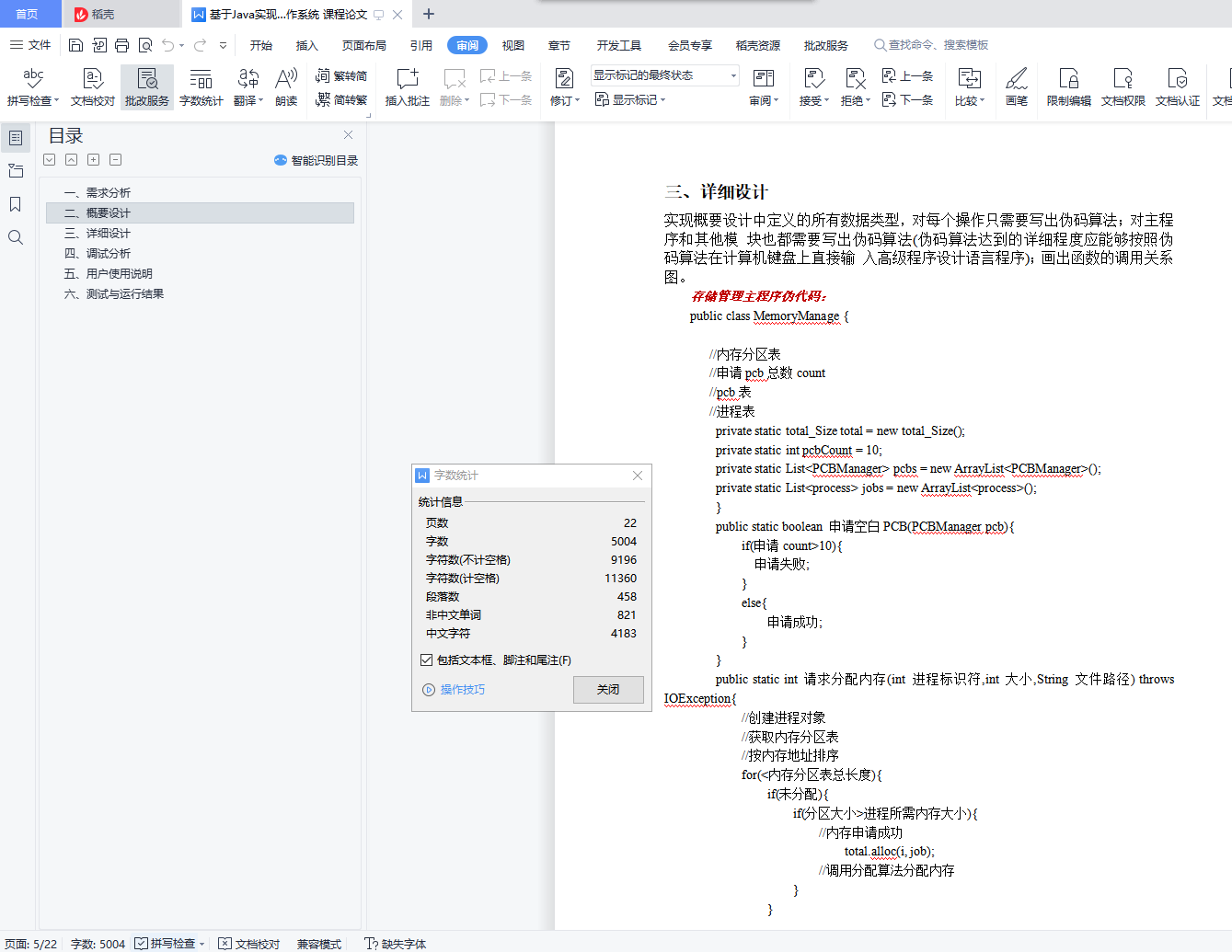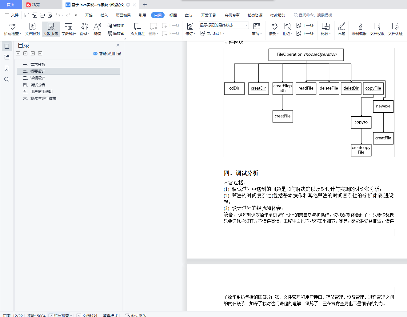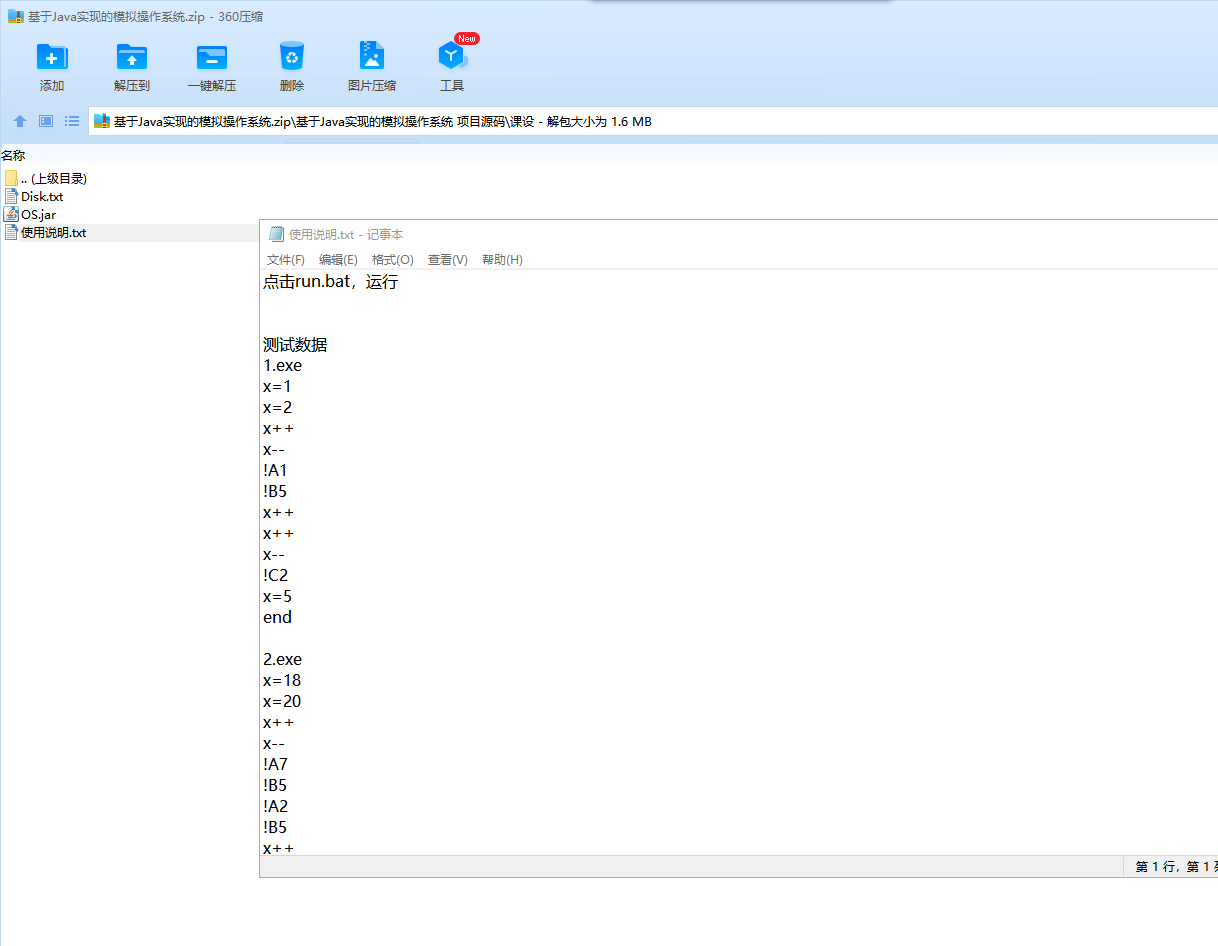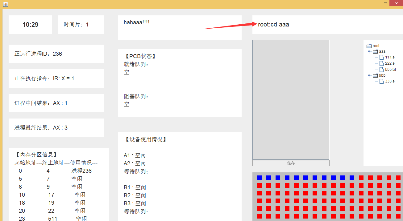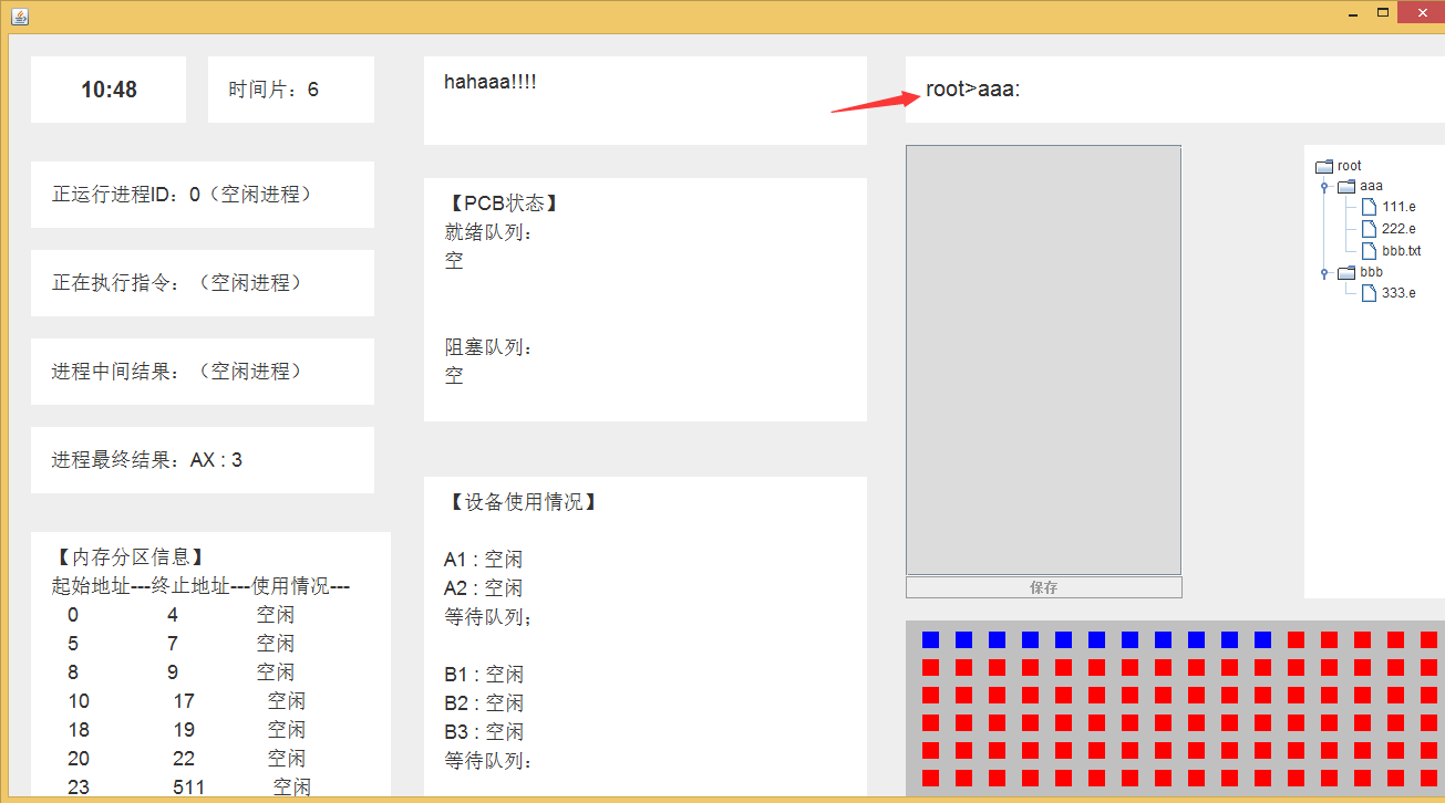 目录一、 需求分析 1二、 概要设计 4三、 详细设计 4四、 调试分析 12五、 用户使用说明 13六、 测试与运行结果 14一、需求分析明确陈述说明程序设计的任务,强调的是程序要做什么,主要包括:任务要求:模拟一个采用多道程序设计方法的单用户操作系统,该操作系统包括进程管理、存储管理、设备管理、文件管理和用户接口四部分。(1)输入的形式和输入值的范围;①从用户界面输入字符串形式的8个命令,如下:1.创建文件: create2.删除文件: delete3.显示文件: type4.拷贝文件: copy5.建立目录: mkdir6.删除空目录: rmdir7.进入退出某个目录::cd8.新建可执行文件:newexecreate新建文件时,type打开文件,从用户界面输入文本内容,并点击保存。目前仅支持第一次保存,暂不支持修改。(2)输出的形式;①进程管理部分系统时间,相对时钟(时间片)、正运行进程ID、正在执行指令、进程中间执行结果、进程最终结果以及就绪队列、阻塞队列(均以字符串形式输出并显示于用户界面)②存储管理部分内存分区情况(列表形式输出显示)③设备管理部分A、B、C三种设备的使用情况和相应等待使用的进程ID(列表形式输出显示)④文件管理部分文件树状目录、文本文件的内容和磁盘使用情况(文件内容字符串形式输出显示,单个磁盘用红蓝小方块表示)⑤用户接口部分显示软件系统的界面(3)程序所能达到的功能;总体功能:实现一个采用多道程序设计方法的单用户操作系统,包括进程管理、存储管理、设备管理、文件管理和用户接口四部分。①进程管理部分功能1.实现简单的CPU,包括指令的读取、解析、执行等2.实现系统时钟,控制CPU和系统的节拍3.实现主要的寄存器4.进程管理主要包括进程调度、进程的创建和撤销、进程的阻塞和唤醒, 中断作用的实现②存储管理部分功能1.划分系统区和用户区2.实现内存空间的分配和回收、存储保护(采用动态分区存储管理和首次适配)③设备管理部分功能1.实现设备的分配和回收,可实现进程的阻塞和唤醒,并管理等待设备的进程2.设备使用倒计时来表示占用某个设备④文件管理部分功能1.实现了进入退出目录、新建文件、删除文件、复制文件、删除空目录、新建exe文件、读取文件。2.显示文件目录树3.显示磁盘使用情况,红色表示未被占用,蓝色表示已经被占用。⑤用户接口部分1.将进程执行中的各种状态、数据以及内存、磁盘使用情况显示出来2.可输入各种文件命令,响应并显示各种文件命令操作(4)测试数据:包括正确的输入及其输出结果和含有错误的输入及其输出结果。