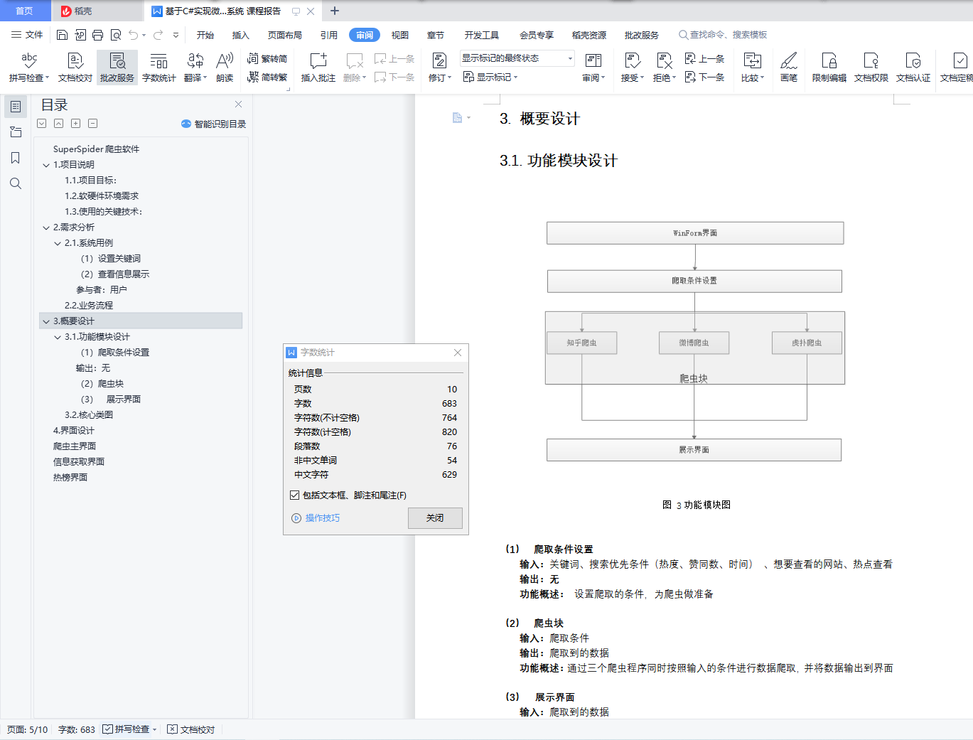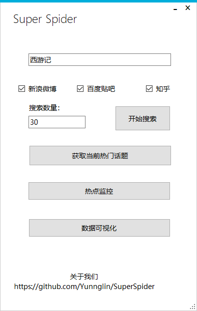 SuperSpider爬虫软件目录SuperSpider爬虫软件 1需求分析与概要设计 11. 项目说明 11.1. 项目目标: 11.2. 软硬件环境需求 21.3. 使用的关键技术: 22. 需求分析 22.1. 系统用例 2(1) 设置关键词 3(2) 查看信息展示 3参与者:用户 32.2. 业务流程 33. 概要设计 43.1. 功能模块设计 4(1) 爬取条件设置 4输出:无 4(2) 爬虫块 4(3) 展示界面 43.2. 核心类图 54. 界面设计 6爬虫主界面 6信息获取界面 8热榜界面 91.项目说明1.1.项目目标:制作一个爬虫软件,可以根据关键词爬取知乎、百度贴吧、微博的相关信息(高赞答案、神回复)或热点信息,然后呈现在界面上。1.2.软硬件环境需求环境:.Net Framework操作系统:Windows需要网络1.3.使用的关键技术:分析URL、下载WebServer返回的HTML、分析HTML内容、构建HTTP请求的模拟、在爬虫过程中存储有用的信息2.需求分析2.1.系统用例图 1 系统用例图(1)设置关键词参与者:用户基本事件流: 在输入框中输入想要查询的关键词,在复选框中勾选想要筛选的条件(热度、点赞数),在复选框中勾选想要爬取的网站(知乎、虎扑、微博)。(2)查看信息展示参与者:用户基本事件流: 单击开始,爬取成功后会在新的弹出框中可以查看爬取到的数据2.2.业务流程图 2软件使用流程图3.概要设计3.1.功能模块设计图 3功能模块图(1)爬取条件设置输入:关键词、搜索优先条件(热度、赞同数、时间) 、想要查看的网站、热点查看输出:无功能概述: 设置爬取的条件,为爬虫做准备(2)爬虫块输入:爬取条件输出:爬取到的数据功能概述:通过三个爬虫程序同时按照输入的条件进行数据爬取,并将数据输出到界面(3) 展示界面输入:爬取到的数据输出:爬取到的数据功能概述:将爬取到的数据展示在界面上