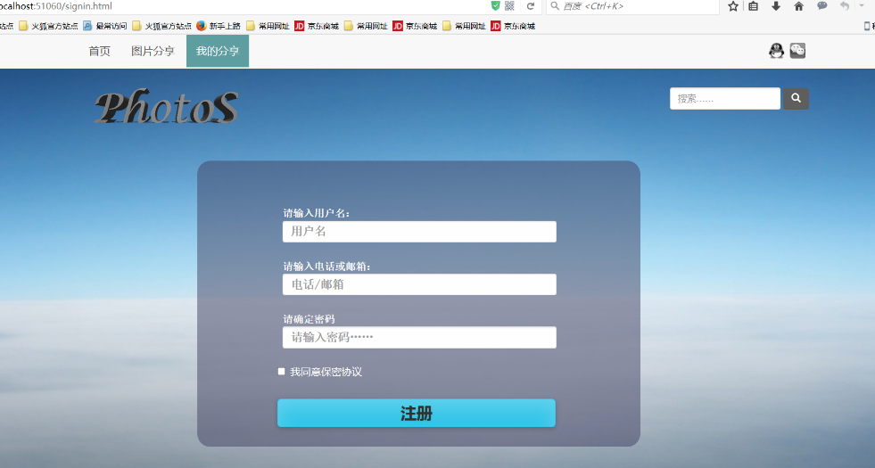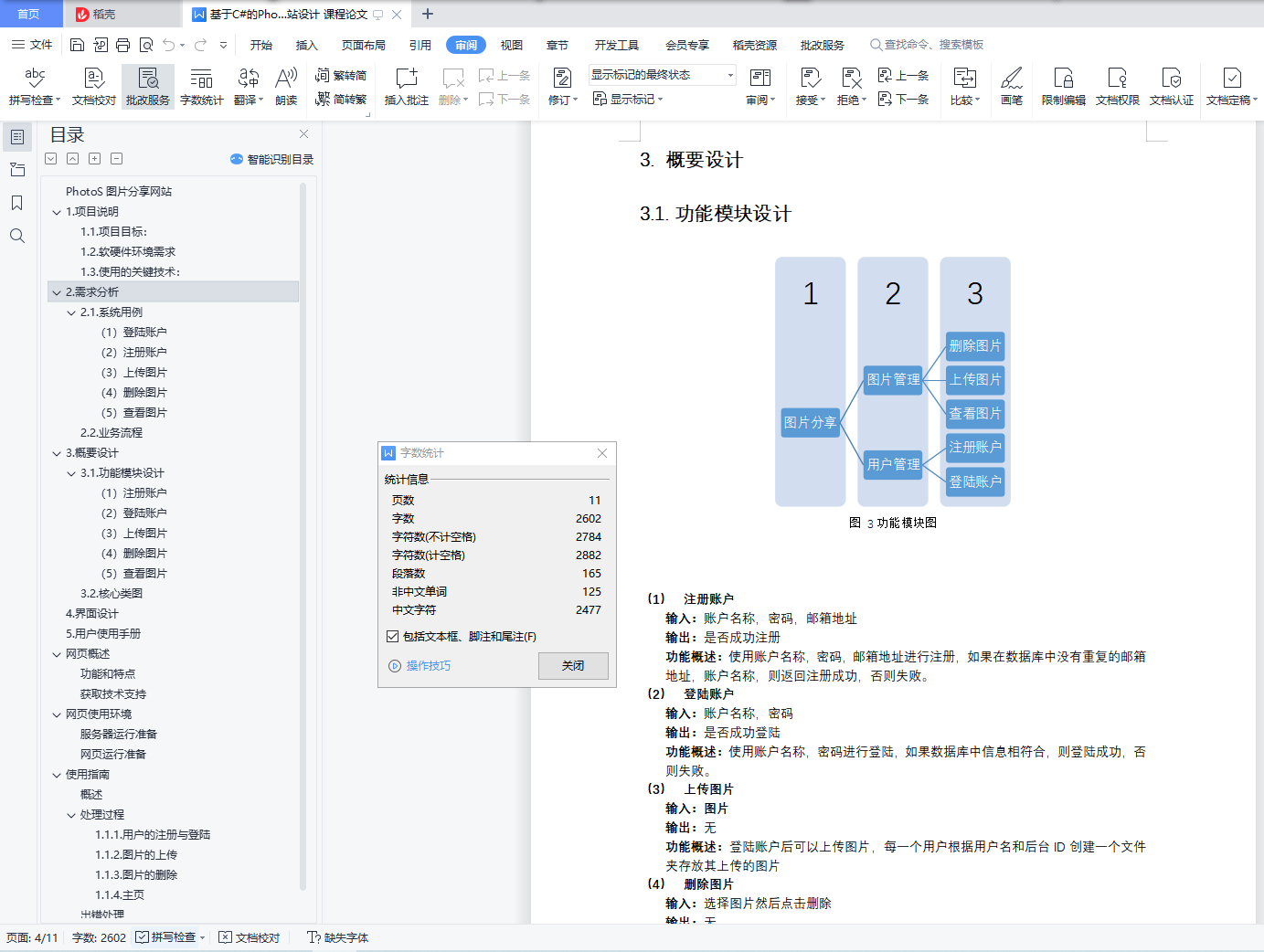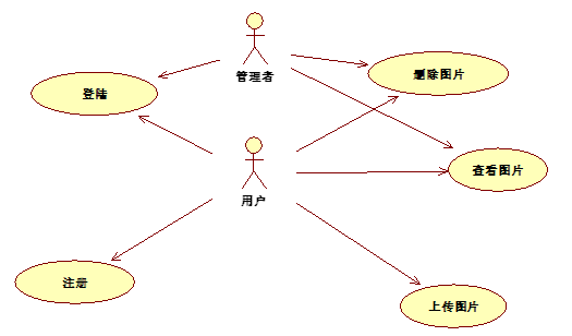 PhotoS图片分享网站目录PhotoS图片分享网站 11. 项目说明 21.1. 项目目标: 21.2. 软硬件环境需求 21.3. 使用的关键技术: 22. 需求分析 32.1. 系统用例 3(1) 登陆账户 3(2) 注册账户 3(3) 上传图片 3(4) 删除图片 3(5) 查看图片 32.2. 业务流程 33. 概要设计 43.1. 功能模块设计 4(1) 注册账户 5(2) 登陆账户 5(3) 上传图片 5(4) 删除图片 5(5) 查看图片 53.2. 核心类图 64. 界面设计 65.用户使用手册 9网页概述 9功能和特点 9获取技术支持 9网页使用环境 10服务器运行准备 10网页运行准备 10使用指南 10概述 10处理过程 101.1.1. 用户的注册与登陆 101.1.2. 图片的上传 111.1.3. 图片的删除 111.1.4. 主页 12出错处理 12附录 121.项目说明项目旨在建立一个面向用户的图片分享网站1.1.项目目标:一个能在本地服务器运行的图片分享网站,以用户为主题,结合一些分类功能,建立一个功能较为完善的图片分享网站1.2.软硬件环境需求软件在Windows平台上运行,使用visual Studio中的localDB作为数据库,在本地建立服务器,不需要网络连接。1.3.使用的关键技术:Web API,EF框架,bootstrap, angularjs2.需求分析2.1.系统用例图 1 系统用例图(1)登陆账户参与者:用户,管理者基本事件流:用户进入网页,进行验证然后登陆(2)注册账户参与者:用户基本事件流:用户进入网页,通过邮箱注册账户(3)上传图片参与者:用户基本事件流:用户可以上传图片到自己的相册(4)删除图片参与者:用户,管理者基本事件流:用户有权限删除自己的图片,管理者有权限删除所有图片。(5)查看图片参与者:用户,管理者基本事件流:用户进入网页,可以查看自己的图片和他人的图片。管理者可以查看所有人的图片