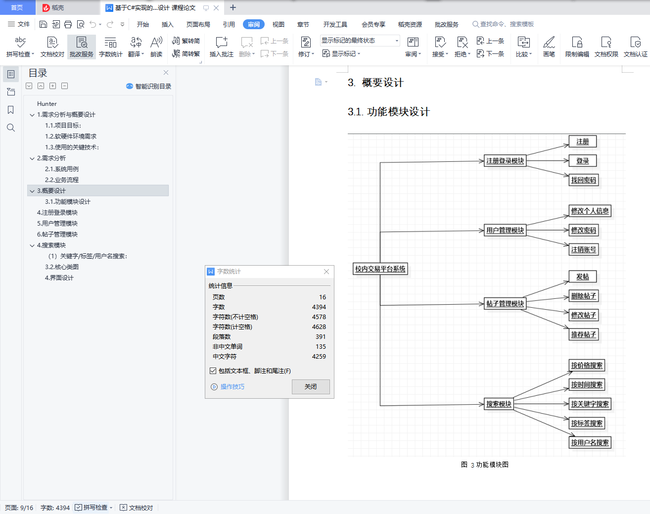 Hunter目录Hunter 11. 需求分析与概要设计 11.1. 项目目标: 11.2. 软硬件环境需求 11.3. 使用的关键技术: 22. 需求分析 22.1. 系统用例 22.2. 业务流程 73. 概要设计 93.1. 功能模块设计 94. 注册登录模块 115. 用户管理模块 126. 帖子管理模块 134.搜索模块 13(1)关键字/标签/用户名搜索: 133.2. 核心类图 154. 界面设计 161.需求分析与概要设计1.1.项目目标:做一款校内自由物品供需交易平台,属于winForm桌面应用程序。用户随时都能在上面寻找自己想要的东西和发布想要获得或出售的物品。找到后可以查看目标用户的个人信息,包括联系方式和现居住地址。然后,用户自行用QQ或微信进行交流。1.2.软硬件环境需求开发环境:visual studio2019开发语言:C#开发环境: .net framework4.7.2数据库:MySQL运行环境: windows用户需安装.net framework4.7.2版本,其他操作系统需自行安装.net core环境,需联网。1.3.使用的关键技术:Winform各种控件的组合使用、数据库增删改查、文本搜索匹配算法、多线程、SMTP协议、正则表达式