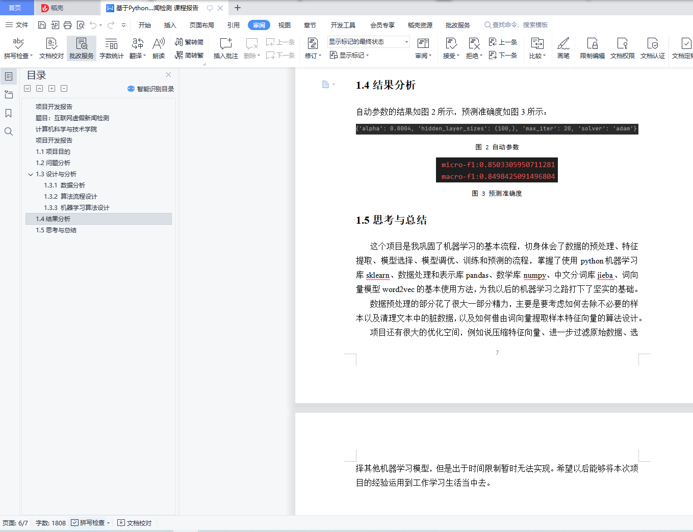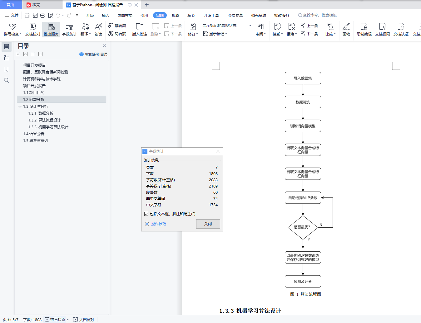 目录项目开发报告 1题目:互联网虚假新闻检测 1计算机科学与技术学院 1项目开发报告 31.1项目目的 31.2问题分析 31.3设计与分析 41.3.1 数据分析 41.3.2 算法流程设计 41.3.3 机器学习算法设计 51.4结果分析 61.5思考与总结 6项目开发报告1.1项目目的随着互联网的飞速发展,家家户户都逐渐牵上了网线,凭借着网络的便利性,外界信息得以轻松的得知,对于百姓们熟知的新闻信息的获取也能在须臾之间完成。然而任何事物的发展都具有两面性,互联网虽说使得信息的产生和获取更加便捷,也滋生了不少虚假新闻扰乱民众的视听,倘若放任不管甚至可能导致谣言泛滥成灾,最终影响到现实社会秩序。本项目旨在通过机器学习训练出具有一定可靠性的互联网虚假新闻检测模型,更具体一点是通过监督学习训练出一个判断新闻是否虚假或者无需判断的分类模型,从而为网络环境的精华献出一份力量。1.2问题分析互联网虚假新闻检测可以视为一个三分类监督学习问题,主要难点在于如何将新闻材料中的信息主体和评论两种文本转化为特征向量,以及筛选、过滤掉对模型训练无用的信息。为方便后续分析,可以构建如下模型:记一条新闻的新闻内容为content,全部评论为comment_all,新闻真假为label,这样的三元组(content, comment_all, label) 为一个训练样本,二元组的集合{(content, comment), …}为待预测的数据。于是问题转化为:①数据清理(清理无用样本,对content、comment_all分词,停用词过滤)②特征向量提取(首先训练出词向量模型然后组成文本向量)③选择训练模型④ 预测和评价1.3设计与分析1.3.1 数据分析首先通过粗略地观察数据集可以发现存在部分N/A空值,这些不完整地信息肯会干扰到后续数据清理,因此要事先调用pandas库进行空值填充;文本信息中通常会夹杂着一些表情代码(通常以中括号包裹)和@字段,这些对于新闻真假的判断来说作用不大可以去掉。1.3.2 算法流程设计本项目主要分为以下几个步骤:①预处理proccess;这个阶段要进行数据导入,数据清理和分词工作,此外还要生成词向量模型,再根据得到的词向量模型构建样本的特征向量。②模型参数自动调优 optimize;③模型训练 fit;本项目将采用多层感知机的机器学习模型,该模型是一个多分类的线性分类模型。④预测 predict;⑤分析优化 analyze;由于中文分词、训练词向量、模型参数选择、模型训练这四个部分耗时较大,为了避免不必要的时间浪费,我将分词结果、词向量模型、模型参数、训练好的MLP模型分别保存,方便下一阶段直接使用,以实现模型的持久化。总体的算法流程图描述如下: