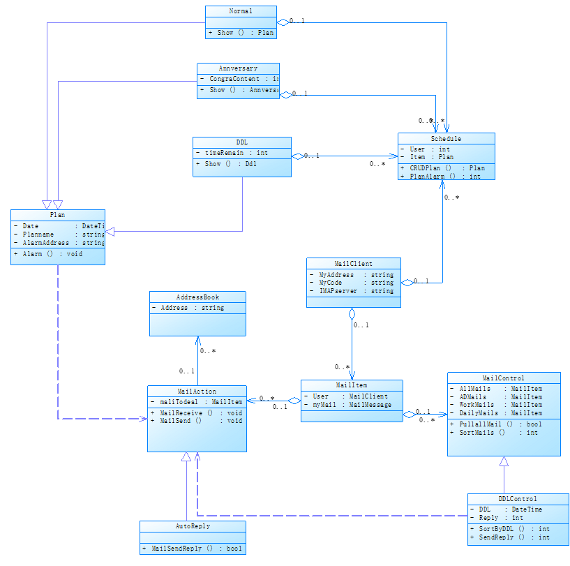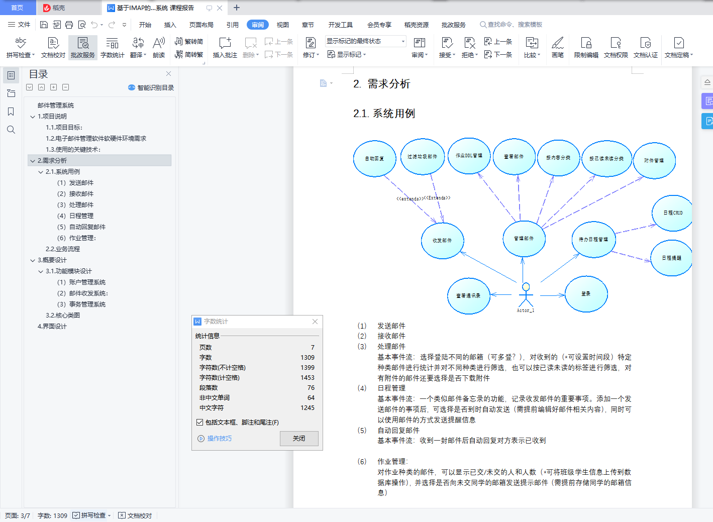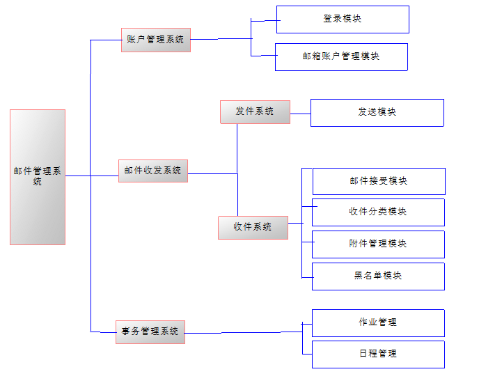 邮件管理系统目录邮件管理系统需求分析与概要设计 11. 项目说明 11.1. 项目目标: 11.2. 电子邮件管理软件软硬件环境需求 11.3. 使用的关键技术: 22. 需求分析 22.1. 系统用例 2(1) 发送邮件 2(2) 接收邮件 2(3) 处理邮件 2(4) 日程管理 2(5) 自动回复邮件 3(6) 作业管理: 32.2. 业务流程 33. 概要设计 43.1. 功能模块设计 4(1) 账户管理系统 5(2) 邮件收发系统: 5(3) 事务管理系统 53.2. 核心类图 64. 界面设计 61.项目说明在当下即时通讯软件已经极大满足我们通讯需求需要,电子邮件在我们生活中更多的是承担着一种更为正式的通讯服务。每个人会有多个邮箱,而来自于不同邮箱电子邮件需要我们登录不同的网页进行查看和管理。这种方式相对不便捷,在学习了C#开发和计算机网络中电子邮件相关知识后,我们小组决定将邮件管理系统作为我们的开发项目1.1.项目目标:完成一个Winform形式的电子邮件管理软件,可以实现邮件收发,邮件分类管理和通过邮件实现的日程系统,并实现课代表助手功能,实现作业邮件的高效率管理1.2.电子邮件管理软件软硬件环境需求在Windows下的VS使用C#完成操作系统:Window10IDE:Visual Studio数据库:Sql Lite1.3.使用的关键技术:基本的C#,使用数据库保存数据,winform的设计课代表外挂部分: Winform设计,怎样登陆到邮箱? 网络下载收件箱相关内容,正则表达式过滤,数据库的连接通过SMTP(或者其他协议)收发邮件