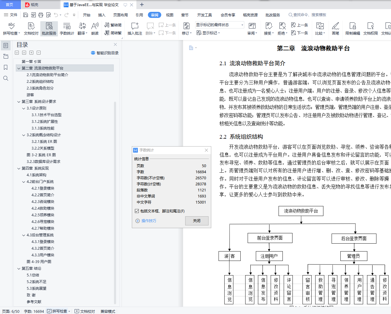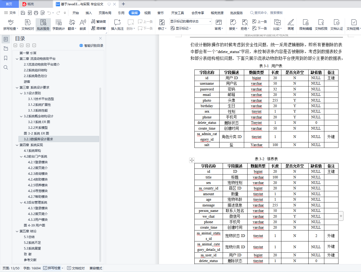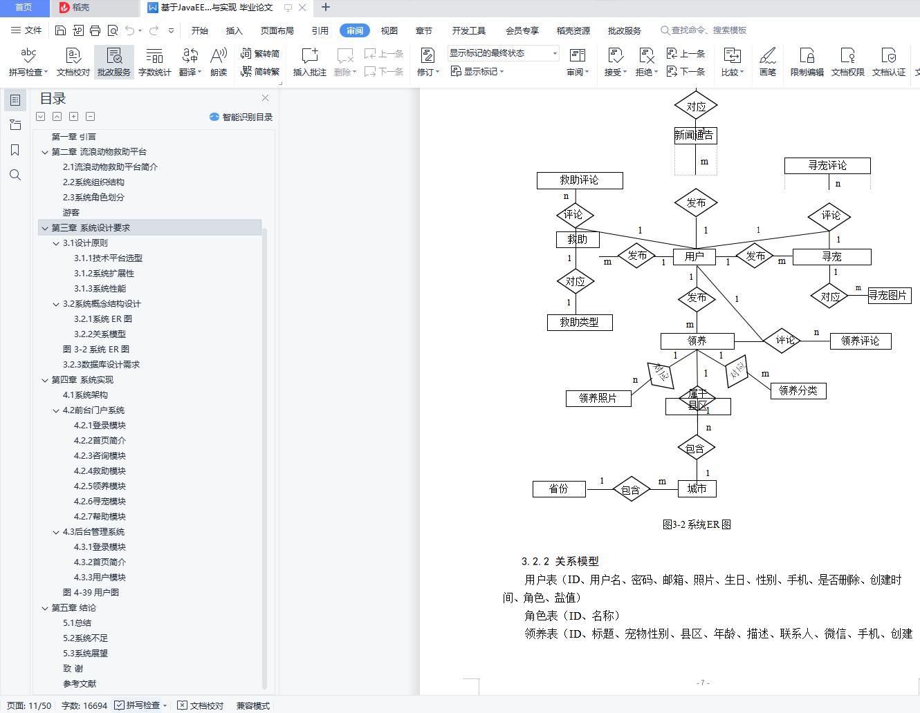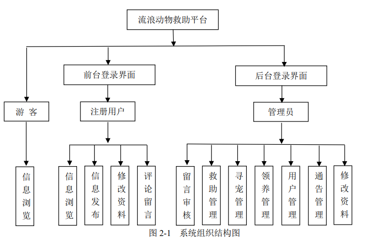 摘 要近年来,随着经济的发展,人民的生活水平日益提高,许多的家庭开始饲养宠物, 城市中的宠物数量也是随之大幅度增长。然而,在人们享受着宠物为生活所带来的乐趣的同时,一系列的安全威胁和宠物丢弃等问题也是铺天盖地地袭来。在城市宠物数量在快速增长的同时,许多的宠物由于主人的疏忽而走失,或者因为主人的某些生活原因, 一些宠物在主人短暂的宠爱之后被无情的丢弃……这一系列的原因,导致城市中的流浪动物数量快速增长,给居民的安居、交通、卫生、人身安全等造成了严重的威胁。面对以上问题,虽然城市中存在着一些宠物救助机构和热心居民,时常为它们送去关怀和救助,但是庞大的流浪动物基数以及流浪位置的分散性和不确定性,导致难以管理和救助效果不佳。流浪动物救助平台是基于 J2EE 设计的管理平台,可以分为普通游客端、注册用户端和管理员端。在该平台上,普通游客端可以浏览别人发布的救助、寻宠、领养等信息, 及时的参与到救助中去。而注册用户端不仅可以浏览各类信息,同时也可以登记自己发现的流浪动物的信息,或者是寻找丢失的宠物和为爱宠寻找新的主人等操作。而管理员端,可以发布公告,对注册用户及被救助动物进行管理、登记、审核相关信息以及查询统计等功能。该平台是一个功能较完善、操作简单的平台。关键词:流浪动物救助平台;JAVA EE;JavaDesign and Implementation of a Rescue Platform for Stray AnimalsAbstractIn recent years, with the development of economy and the improvement of people's living standard, many families begin to keep pets, and the number of pets in the city also increases greatly. However, while people enjoy the fun of pets for life, a series of security threats and pet discard problems are also overwhelming. At the same time of the rapid growth of the number of pets in the city, many pets are lost due to the negligence of their owners, or some pets are mercilessly discarded after their owners' short-term love for some living reasons This series of reasons lead to the rapid growth of the number of stray animals in the city, which poses a serious threat to the residents' living, traffic, health and life safety.In the face of the above problems, although there are some pet rescue institutions and enthusiastic residents in the city, they are often sent to care and rescue, but the large number of stray animals and the dispersion and uncertainty of the location of stray animals make it difficult to manage and rescue.Tramp animal rescue platform is a management platform designed based on J2EE, which can be divided into ordinary tourists, registered users and administrators. On this platform, ordinary tourists can browse the information of rescue, pet seeking, adoption and other information released by others, and participate in the rescue in time. The registered client can not only browse all kinds of information, but also register the information of stray animals found by itself, or search for lost pets and new owners for pets. The administrator side can issue announcements, manage, register, audit relevant information and query statistics for registered users and rescued animals. This platform is a platform with perfect function and simple operation.Key Words:Rescue Platform for Stray Animals; JAVA EE; Java目录第一章 引言 ......................................................... 1第二章 流浪动物救助平台 ............................................. 22.1 流浪动物救助平台简介 ........................................... 22.2 系统组织结构 ................................................... 22.3 系统角色划分 ................................................... 3第三章 系统设计要求 ................................................. 53.1 设计原则 ........................................................ 53.1.1 技术平台选型 .............................................. 53.1.2 系统扩展性 ................................................ 63.1.3 系统性能 .................................................. 63.2 系统概念结构设计 ............................................... 63.2.1 系统 ER 图 ................................................. 73.2.2 关系模型 .................................................. 73.2.3 数据库设计需求 ............................................ 8第四章 系统实现 .................................................... 114.1 系统架构 ....................................................... 114.2 前台门户系统 ................................................... 124.2.1 登录模块 ................................................. 144.2.2 首页简介 ................................................. 204.2.3 咨询模块 ................................................. 224.2.4 救助模块 ................................................. 234.2.5 领养模块 ................................................. 274.2.6 寻宠模块 ................................................. 314.2.7 帮助模块 ................................................. 334.3 后台管理系统 ................................................... 344.3.1 登录模块 ................................................. 354.3.2 首页简介 ................................................. 354.3.3 用户模块 ................................................. 364.3.4 领养模块 ................................................. 374.3.5 新闻通知模块 ............................................. 394.3.6 设置模块 ................................................. 40第五章 结论 ......................................................... 425.1 总结 ........................................................... 425.2 系统不足 ...............................................