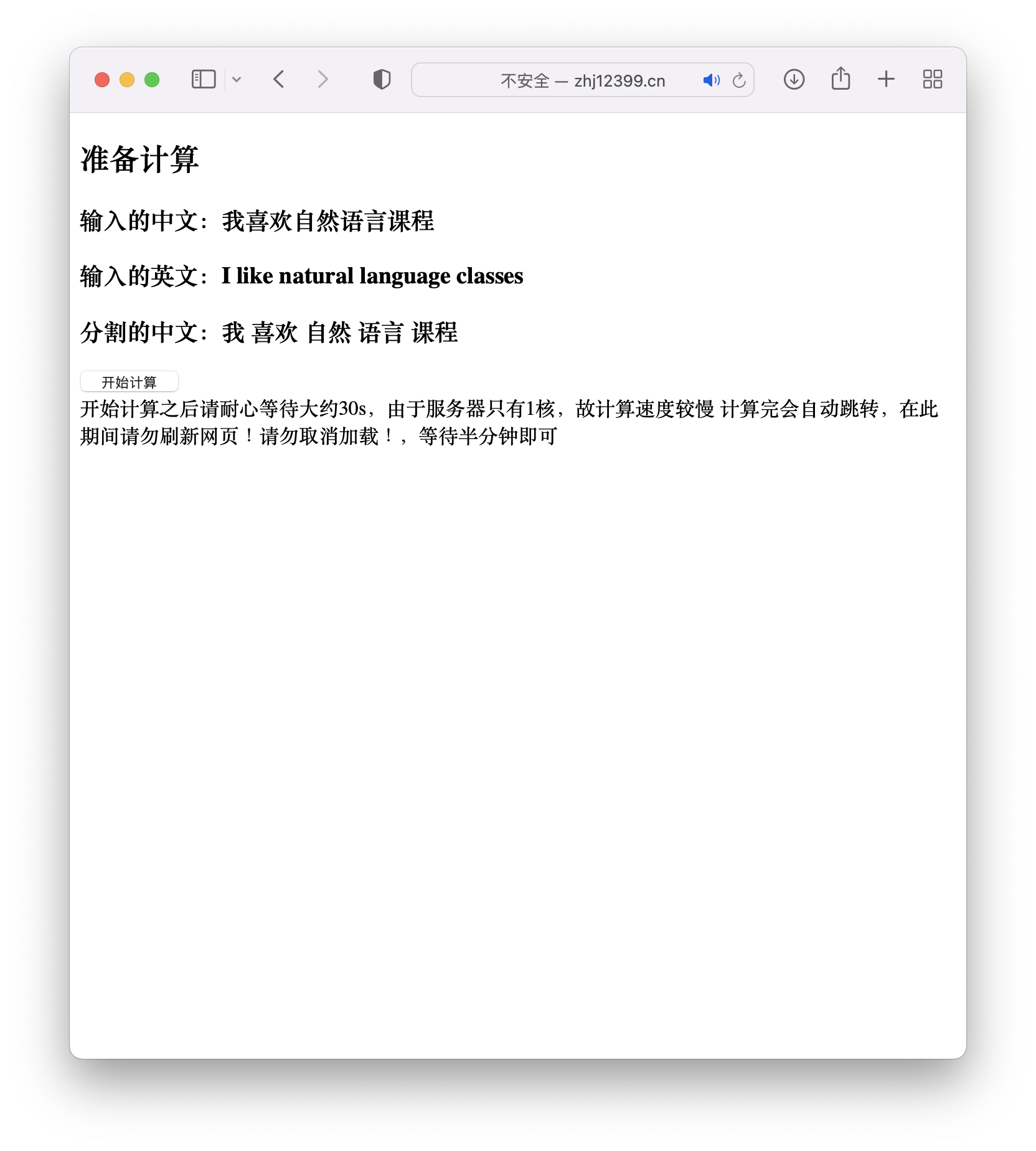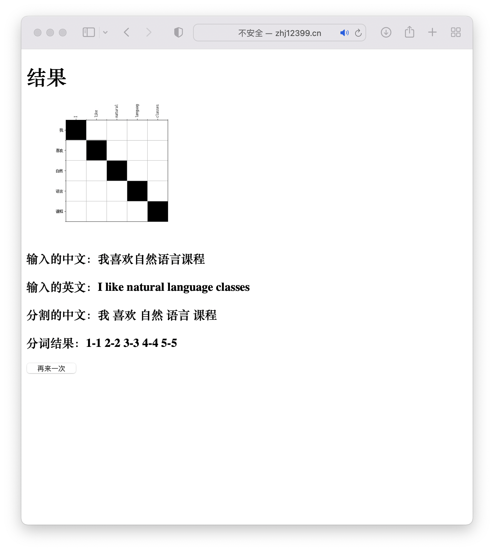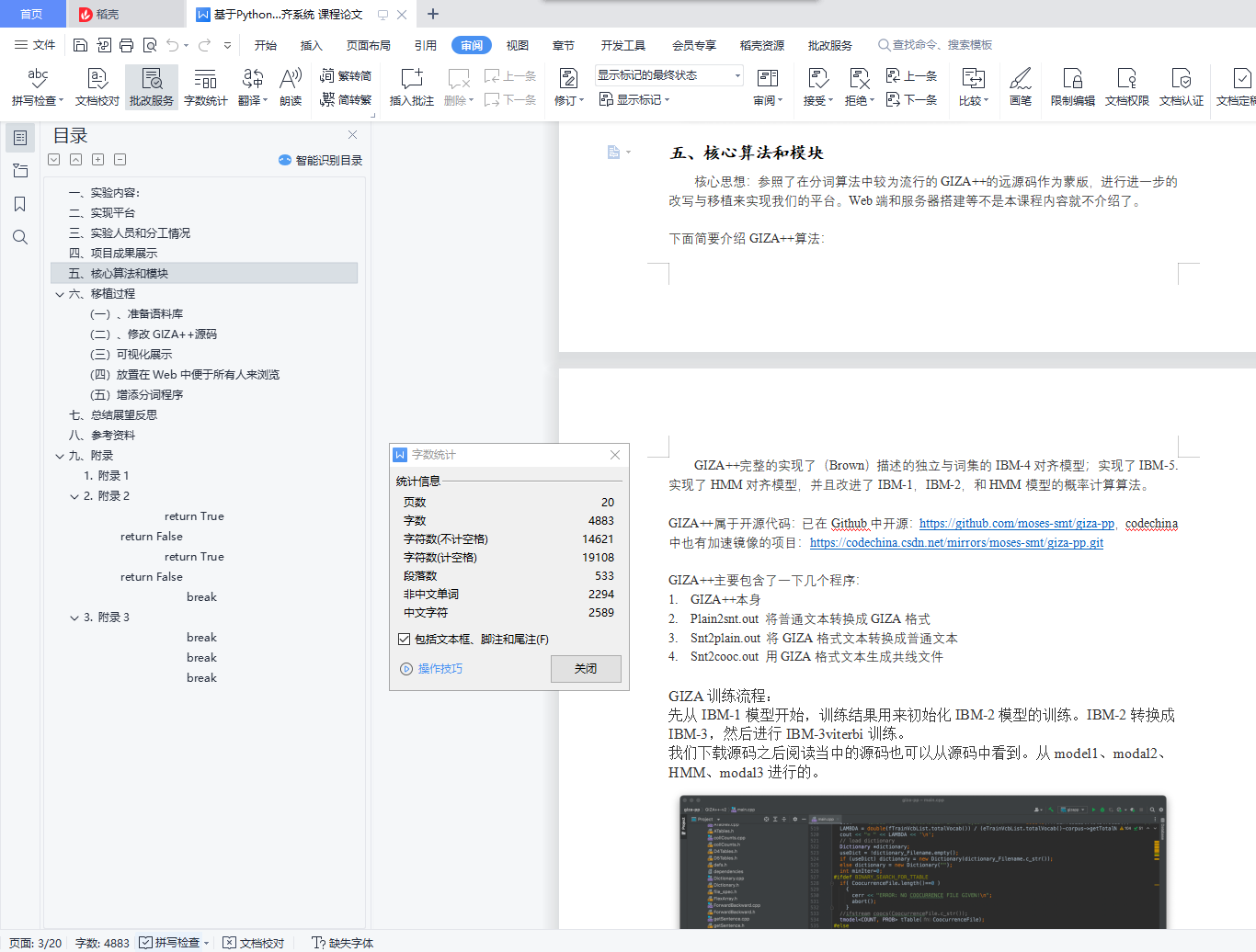 目录一、 实验内容: 1二、实现平台 1三、实验人员和分工情况 1四、项目成果展示 2五、核心算法和模块 3六、移植过程 9(一)、准备语料库 9(二)、修改GIZA++源码 10(三)可视化展示 11(四)放置在Web中便于所有人来浏览 12(五)增添分词程序 12七、总结展望反思 12八、参考资料 13九、附录 131. 附录1 132. 附录2 14return True 16return False 16return True 16return False 16break 193. 附录3 19break 19break 20break 20一、实验内容:选择实验4进行,即汉英词语自动对齐系统二、实现平台本地平台:电脑一:MacBook Air M1,语言选择:Python和Cpp,电脑二:AMD 3800X 16线程 运行Centos便于本地调试。云端服务器:腾讯云1核云服务器,系统为CentOS,Web端选择Django,语言选择为Python和Cpp 。三、实验人员和分工情况由本人独自完成本项目四、项目成果展示为了便于展示成果,也是满足实验要求,将程序放置在云服务器中建立了一个Web应用这样也可以让所有人来访问。网址为 http://NLP.zhj12399.cn,如DNS不正确可访问 http://zhj12399.cn:9200同时也录制了一段自己运行的展示视频在文件夹中。