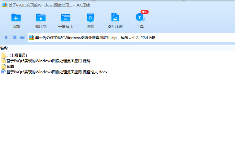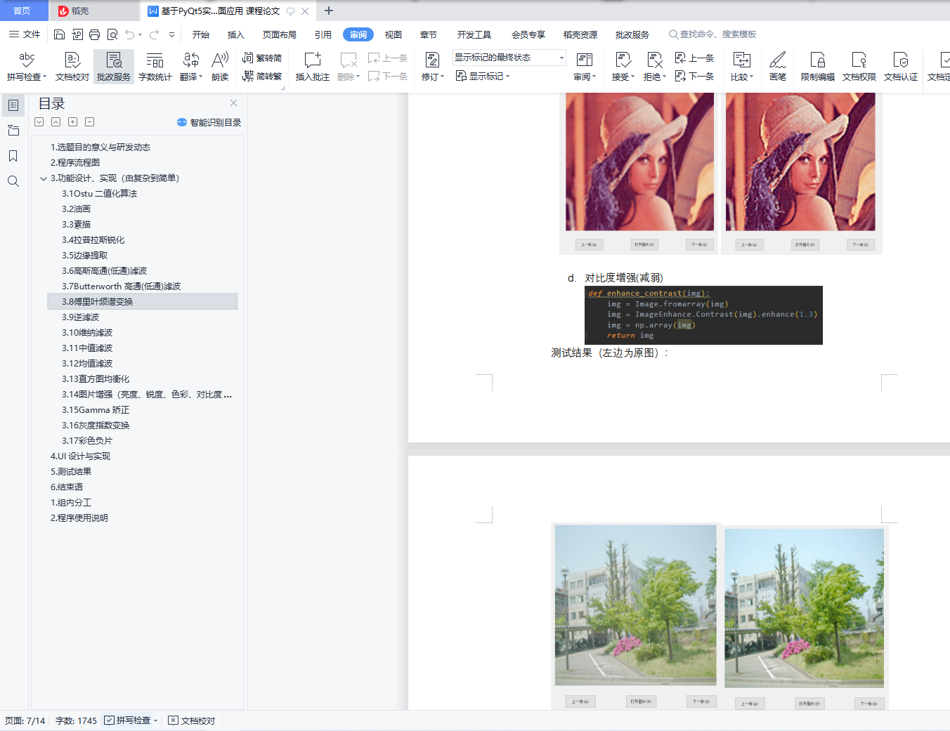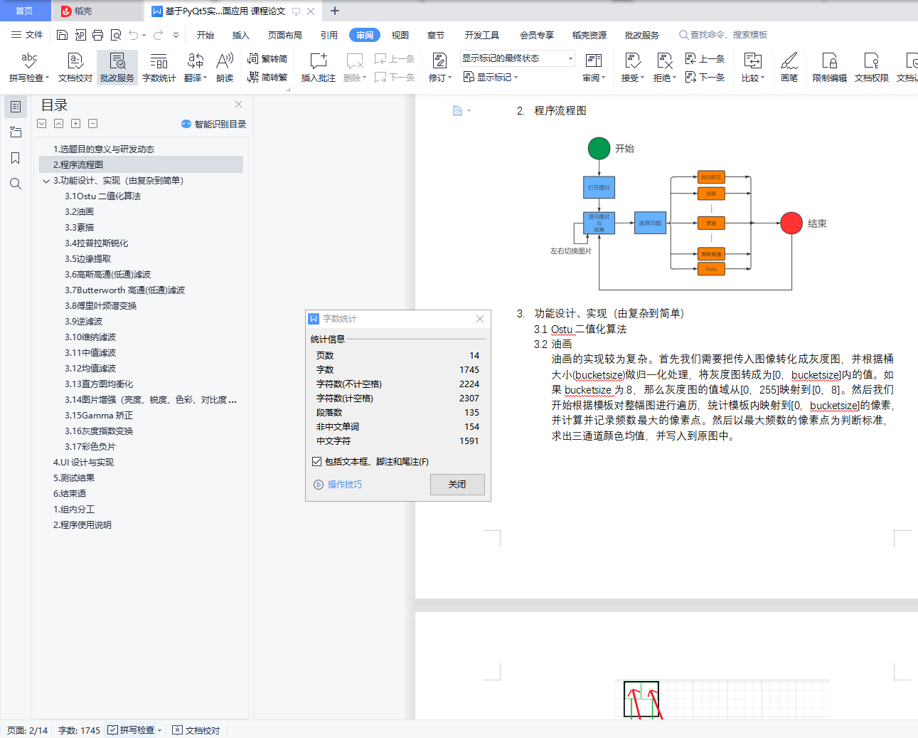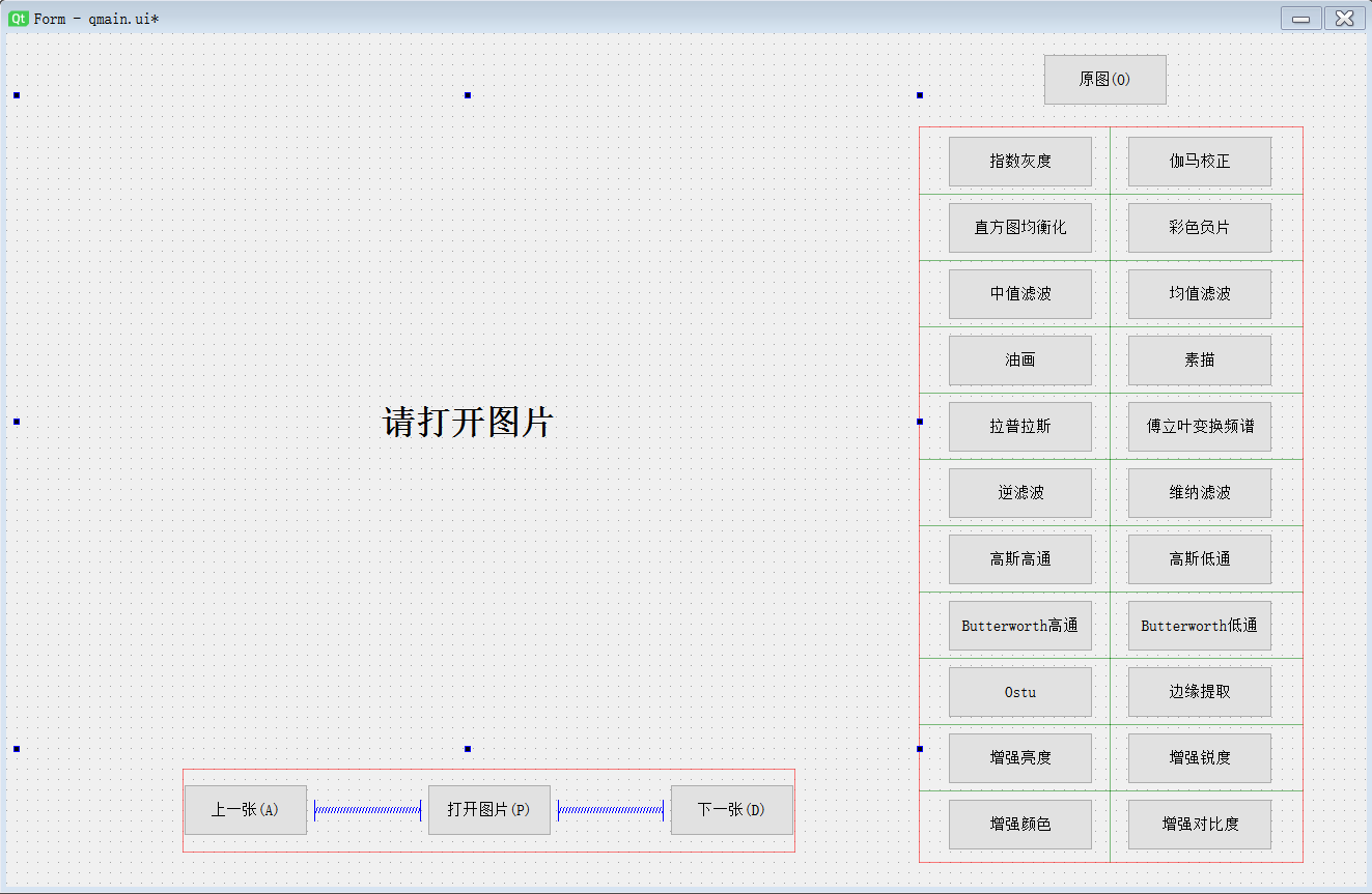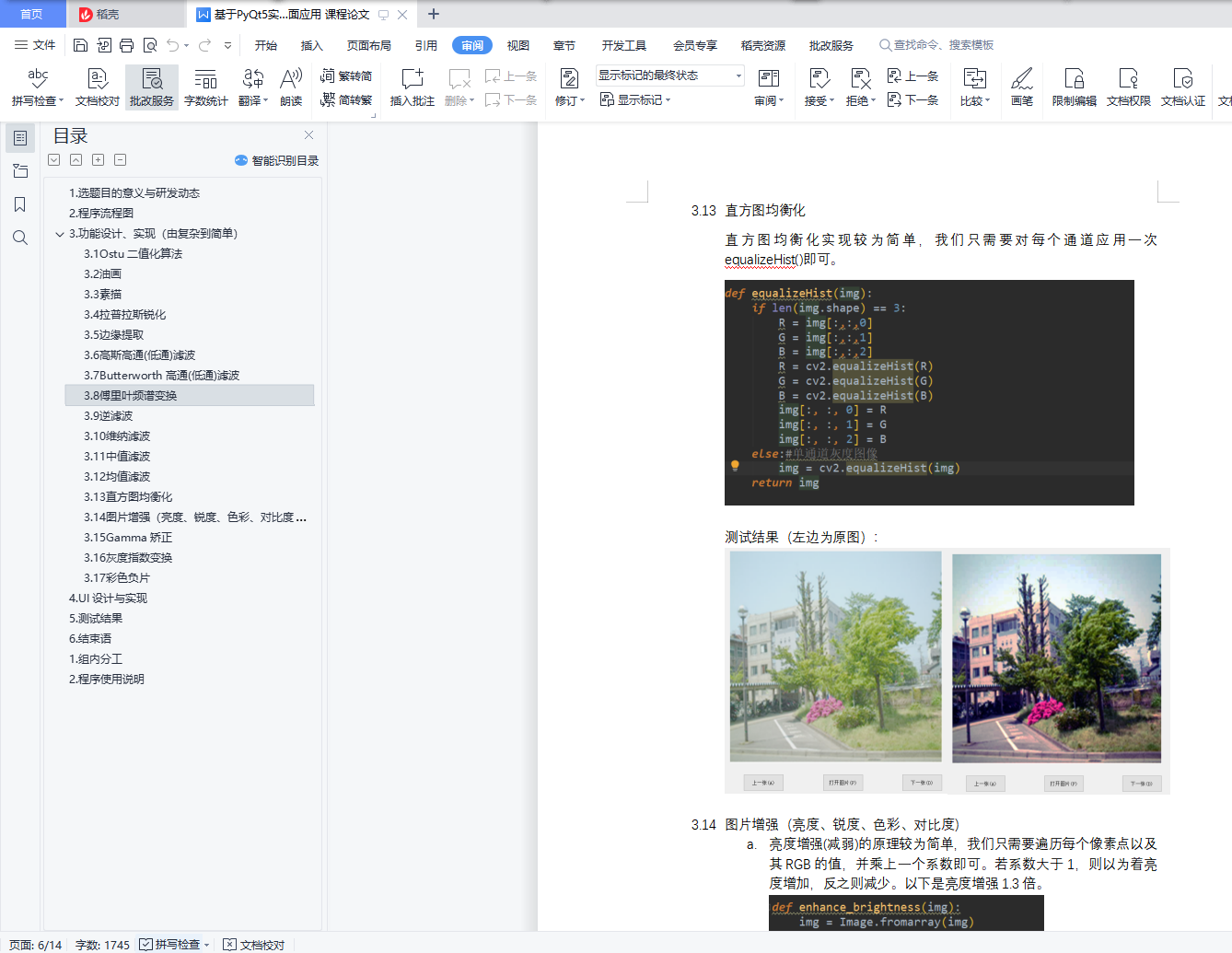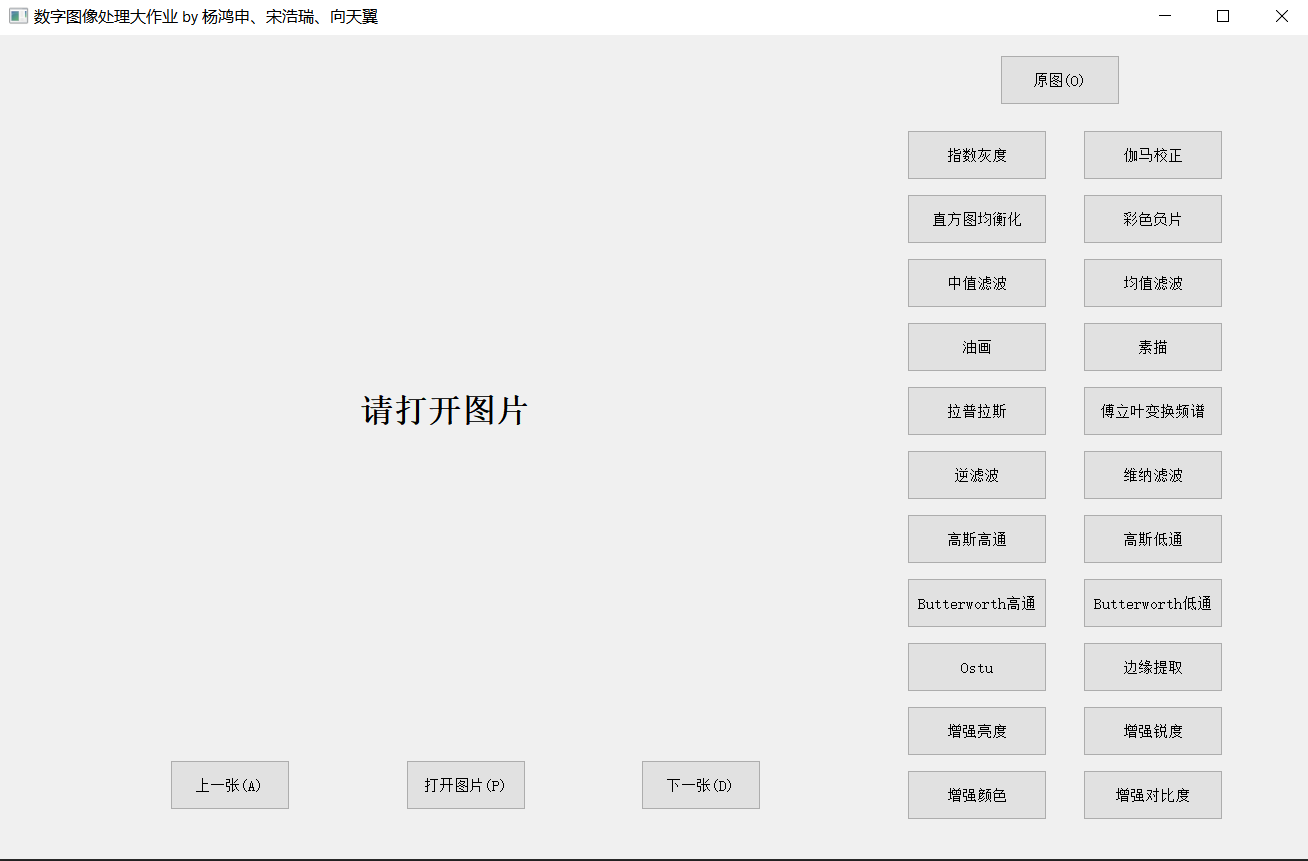 目录1. 选题目的意义与研发动态 22. 程序流程图 23. 功能设计、实现(由复杂到简单) 23.1 Ostu二值化算法 23.2 油画 23.3 素描 43.4 拉普拉斯锐化 43.5 边缘提取 43.6 高斯高通(低通)滤波 53.7 Butterworth高通(低通)滤波 53.8 傅里叶频谱变换 53.9 逆滤波 53.10 维纳滤波 53.11 中值滤波 53.12 均值滤波 53.13 直方图均衡化 63.14 图片增强(亮度、锐度、色彩、对比度) 63.15 Gamma矫正 83.16 灰度指数变换 83.17 彩色负片 94. UI设计与实现 105. 测试结果 126. 结束语 121. 组内分工 122. 程序使用说明 13摘要:在当今社会中,数字图像处理的使用越来越平民化,越来越广泛。本文共实现了21种图像处理算法,并统一接口,设计了相关程序以供有需要的人们使用。在所实现的21种功能中,既有较初级的灰度变换、伽马校正、均值滤波、中值滤波、直方图均衡化、彩色负片等,有稍高级的Gauss滤波、Butterworth滤波,也有更复杂的Ostu二值化,生成油画,生成素描等。上述所有的功能都被集成到一个基于PyQt5实现的Windows桌面应用,以提供便捷的看图与图像处理的工具。关键词:图像处理;滤波;Ostu;油画;素描;PyQt5