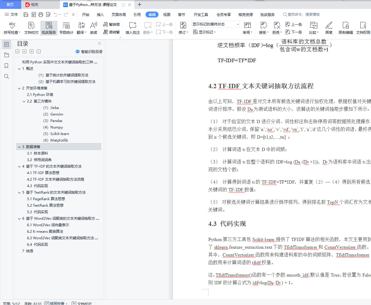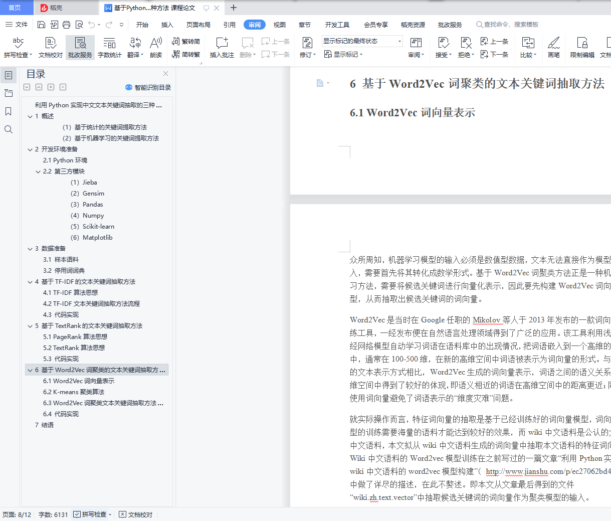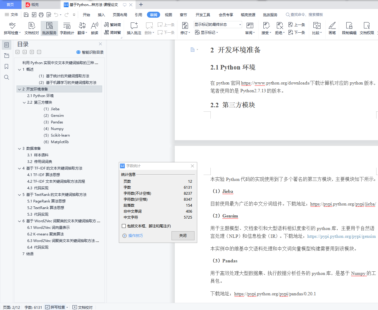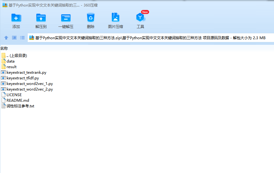 利用Python实现中文文本关键词抽取的三种方法文本关键词抽取,是对文本信息进行高度凝练的一种有效手段,通过3-5个词语准确概括文本的主题,帮助读者快速理解文本信息。目前,用于文本关键词提取的主要方法有四种:基于TF-IDF的关键词抽取、基于TextRank的关键词抽取、基于Word2Vec词聚类的关键词抽取,以及多种算法相融合的关键词抽取。笔者在使用前三种算法进行关键词抽取的学习过程中,发现采用TF-IDF和TextRank方法进行关键词抽取在网上有很多的例子,代码和步骤也比较简单,但是采用Word2Vec词聚类方法时网上的资料并未把过程和步骤表达的很清晰。因此,本文分别采用TF-IDF方法、TextRank方法和Word2Vec词聚类方法实现对专利文本(同样适用于其它类型文本)的关键词抽取,通过理论与实践相结合的方式,一步步了解、学习、实现中文文本关键词抽取。目录利用Python实现中文文本关键词抽取的三种方法 11 概述 12 开发环境准备 22.1 Python环境 22.2 第三方模块 23 数据准备 33.1 样本语料 33.2 停用词词典 44 基于TF-IDF的文本关键词抽取方法 44.1 TF-IDF算法思想 44.2 TF-IDF文本关键词抽取方法流程 54.3 代码实现 55 基于TextRank的文本关键词抽取方法 65.1 PageRank算法思想 65.2 TextRank算法思想 75.3 代码实现 86 基于Word2Vec词聚类的文本关键词抽取方法 86.1 Word2Vec词向量表示 96.2 K-means聚类算法 96.3 Word2Vec词聚类文本关键词抽取方法流程 106.4 代码实现 117 结语 111 概述一篇文档的关键词等同于最能表达文档主旨的N个词语,即对于文档来说最重要的词,因此,可以将文本关键词抽取问题转化为词语重要性排序问题,选取排名前TopN个词语作为文本关键词。目前,主流的文本关键词抽取方法主要有以下两大类: