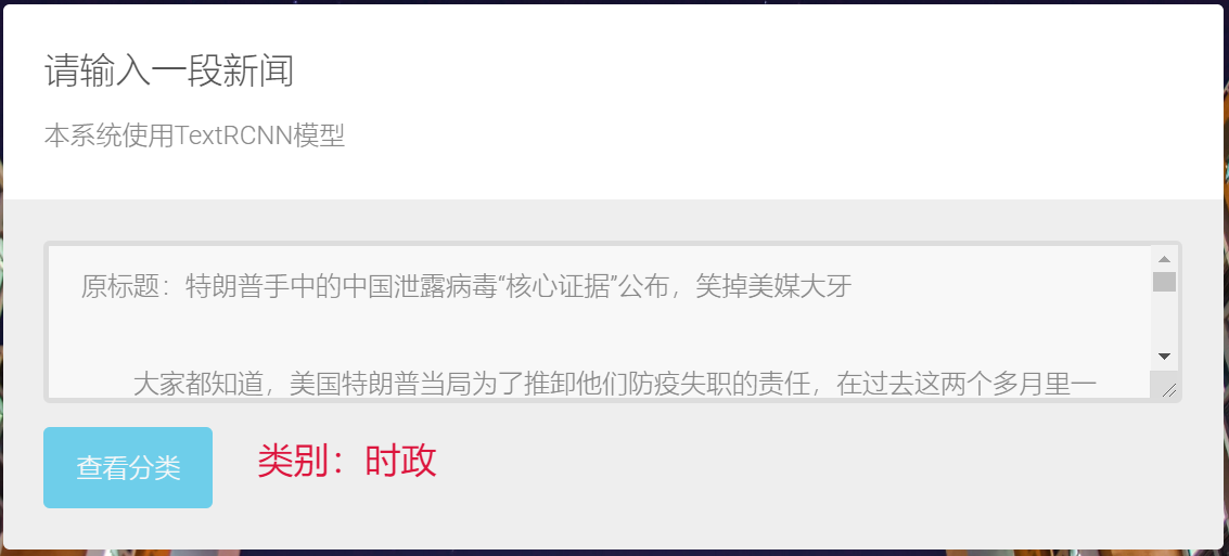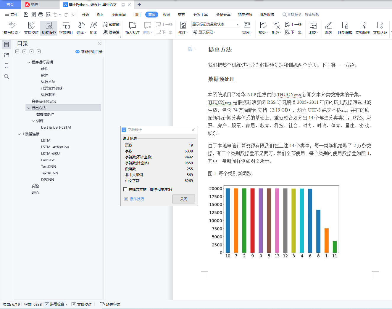 目录程序运行说明 1背景及任务定义 4提出方法 51. 残差连接 10实验 15结论 17程序运行说明硬件GPU: Tesla V100, 32GB显存内存:32GB系统:Linux(训练),Windows(展示)软件CUDA版本: 9.2Pytorch:1.5其他库:gensim,sklearn,tqdm,flask,numpy等运行方法如果直接使用,步骤为:1.进入"Flask"文件夹,在cmd中执行以下命令:python NLP_flask.py,便可启动 flask 后台,然后在浏览器地址栏输入127.0.0.1:5000,即可看到分类系统界面。如果需要训练,步骤为:1.如果想要训练非bert的模型,需要先训练词向量:进入"src"目录下,在terminal中执行以下命令:python train_w2v.py,修改该文件的代码可以设置word2vec的窗口大小、词向量维度等。2.(./src目录)在terminal中输入python run.py --model model_name --word True/False,即可启动相应模型的训练。model_name是选择的模型,word为True(默认)则进行词级别的训练,否则进行字级别的训练。word参数只针对非bert模型,因为bert是分字的。可选的模型会在后面介绍。**注意:**训练之前请先下载数据集和bert的相关文件,在相应的文件夹内有README说明文档,内附有百度云盘下载链接。代码文件说明下面解释./src目录下的代码:run.py 训练主程序train_eval.py 具体的训练逻辑utils.py 工具类函数train_w2v.py 训练词向量global_config.py 全局参数设置,如batch_size等./model 下是不同模型的实现./temp 下存放了预训练的词向量
