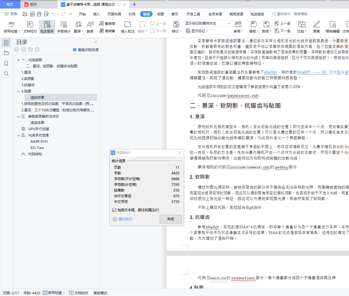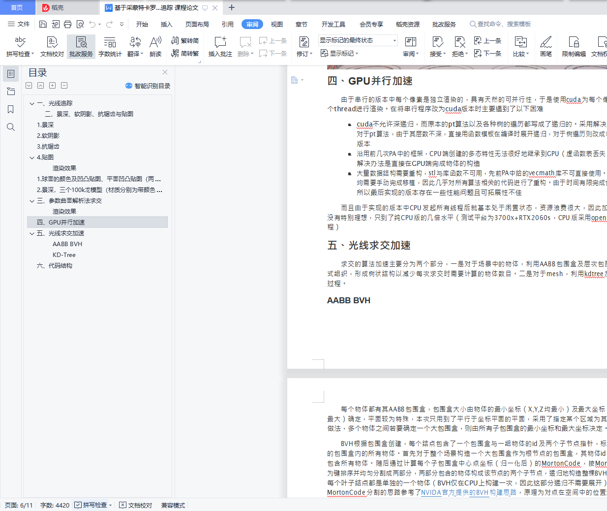 目录⼀、光线追踪 1⼆、景深、软阴影、抗锯⻮与贴图 11. 景深 12. 软阴影 13. 抗锯⻮ 24.贴图 2渲染效果 31. 球⾯的颜⾊及凹凸贴图、平⾯凹凸贴图(两侧砖墙)、表⾯材质类型贴图(地⾯) 32. 景深,三个100k⻰模型(材质分别为带颜⾊的折射、带颜⾊的反射、漫反射) 4三、参数曲⾯解析法求交 4渲染效果 5四、GPU并⾏加速 5五、光线求交加速 5AABB BVH 5KD-Tree 6六、代码结构 7⼀、光线追踪采⽤蒙特卡罗路径追踪算法,通过多次采样从相机发出的光线并追踪其路径,计算路径上的发光、 反射、折射等带来的颜⾊权重,最后求平均以求解物体表⾯的渲染⽅程,这个过程求解的渲染⽅程结果 是⽆偏的,缺点就是收敛速度极慢,采样数直接影响了渲染结果的质量,采样数的增加⼜会导致渲染时⻓增加。且由于只追踪从相机发出的光线(即单向路径追踪,区分于双向路径追踪),导致当光源⾯积 很⼩时很难收敛,也难以模拟焦散等特征。实现路径追踪的基础算法时主要参考了smallpt,同时借助SmallPT ―― 99 ⾏代码光线追踪解析以理解算法。实现了漫反射、镜⾯反射与折射三种表⾯材质类型。光线追踪中⽤到的求交逻辑除了参数曲⾯外均基于前⾯⼏次PA。 代码⻅include/pathtracer.cuh⼆、景深、软阴影、抗锯⻮与贴图1.景深原先的针孔相机模型中,相机(发出初始光线的位置)即为空间中⼀个点;⽽在模拟景深,即带光 圈的相机时,相机(发出初始光线的位置)可以是光圈位置的任何⼀个点,所以通过指定光圈⼤⼩,随 机化地选择初始出射光线来模拟景深,为此另外定义⼀个焦距参数。在与相机所在位置的距离等于焦距的平⾯上,物体应该清晰可⻅,光圈中随机发出的光线需要满⾜ 这⼀特征。采⽤的⽅法是,先在光圈内随机产⽣⼀个点作为光线的出射点,然后计算这个光线的⽅向, 使得其能刚好射向焦点,出射点加⽅向即构成完整的出射光线。景深相机的代码⻅include/camera.cuh 的getRay 部分2.软阴影通过对⾯光源采样,被物体阻挡的部分并不是完全⽆法采样到光照,⽽是随被遮挡的程度逐渐加深⽽呈现出逐渐变深的阴影,因此可以得到带有渐变过渡的阴影。在实现中由于不定义光线,⽽直接给物 体材质加上发光这⼀特征,因此可以⽅便地实现⾯光源,即⾃然实现了软阴影。不附上具体代码,实现结合在pt当中3.抗锯⻮参考smallpt,实现的是SSAA*4抗锯⻮,即将每个像素分为四个⼦像素进⾏采样,采样完毕后将四 个结果取平均作为对该像素本次采样的结果。SSAA的优点是实现⾮常简单,但相应的增加了数倍采样次 数,⼤⼤增加了渲染开销。代码⻅main.cu 的renderPixel 部分,每个像素都分成四个⼦像素渲染再压缩4.贴图实现了平⾯与球体类的纹理映射。对于平⾯,采⽤了指定区域平铺+拉伸的映射⽅法,在创建平⾯ 时可以选择⼀个平铺的基准点以及平铺的两个⽅向向量,⽅向的⻓度同时也决定了材质的拉伸程度。对 于球体,采⽤了墨卡托投影,直接通过交点处的法向换算出uv空间坐标。