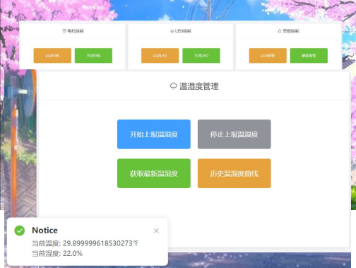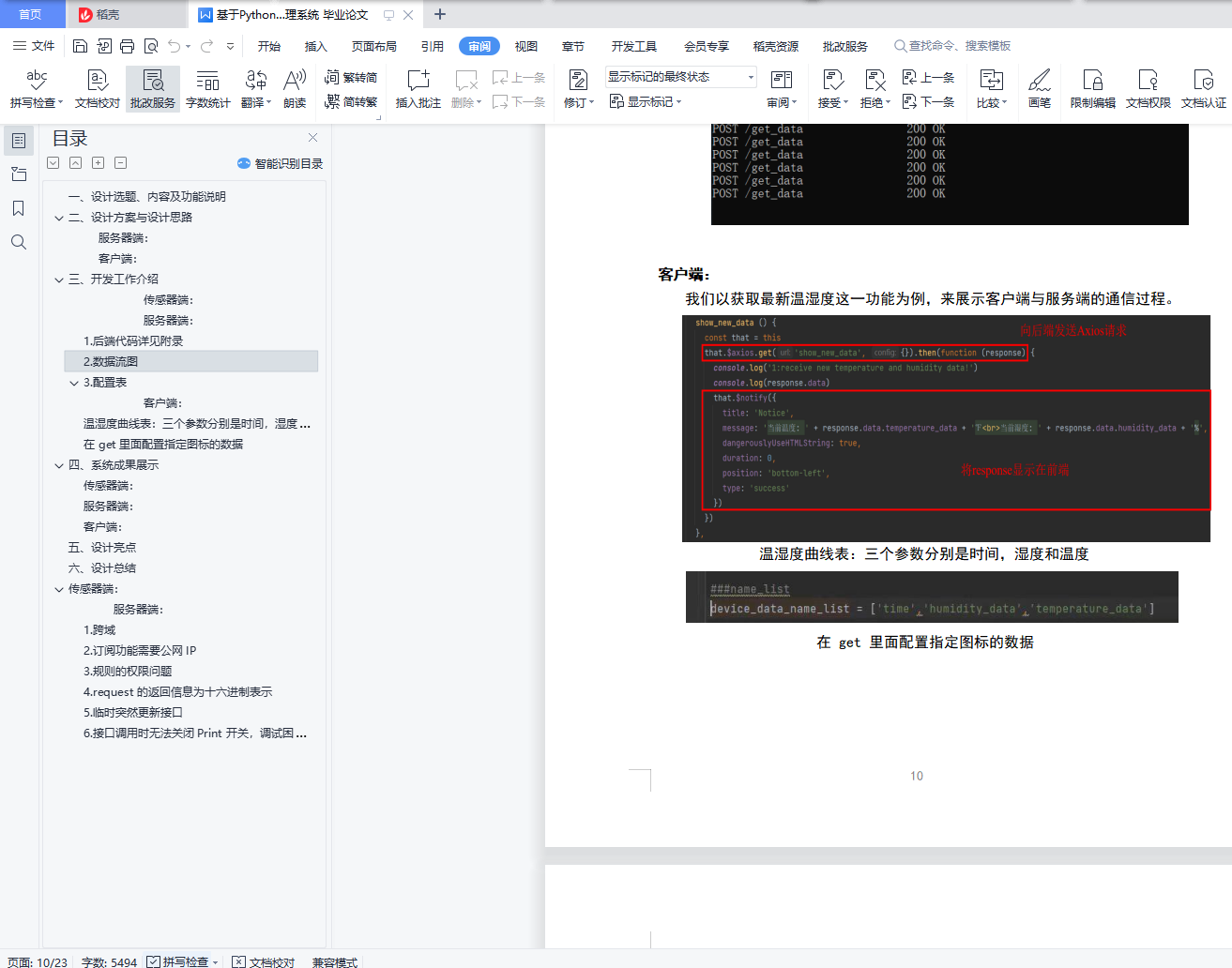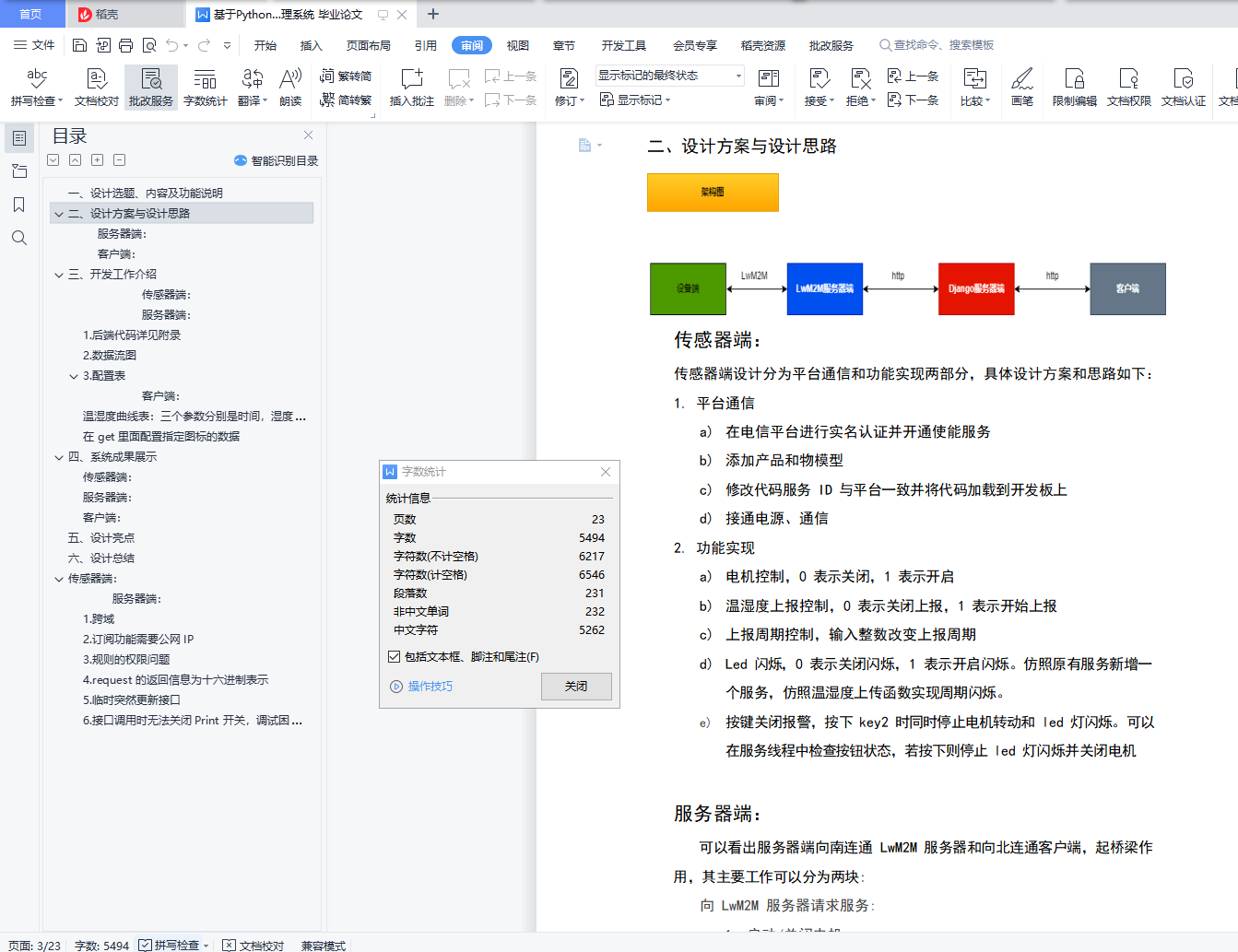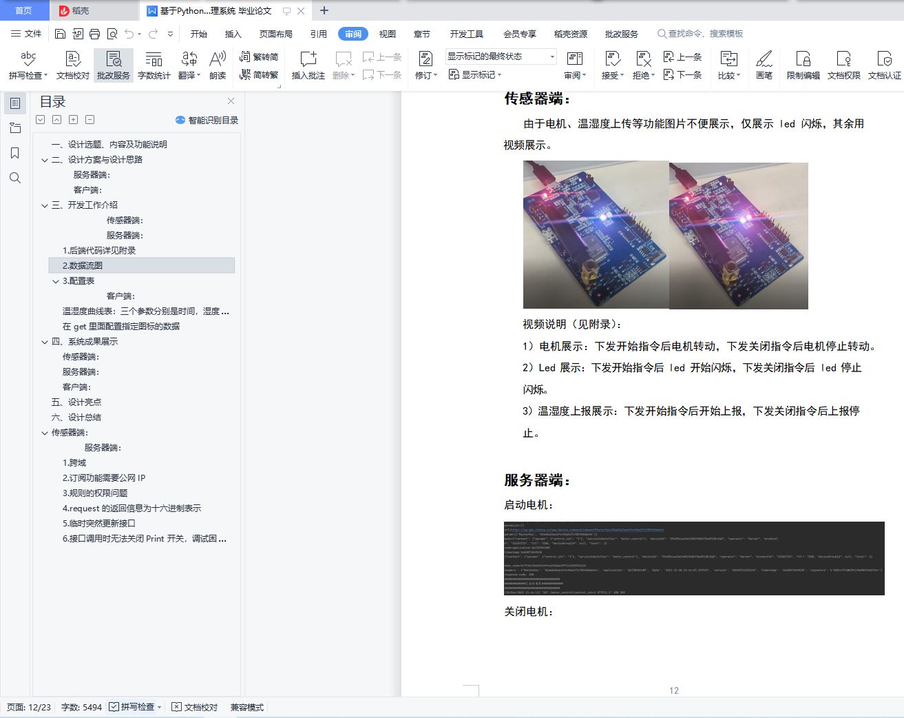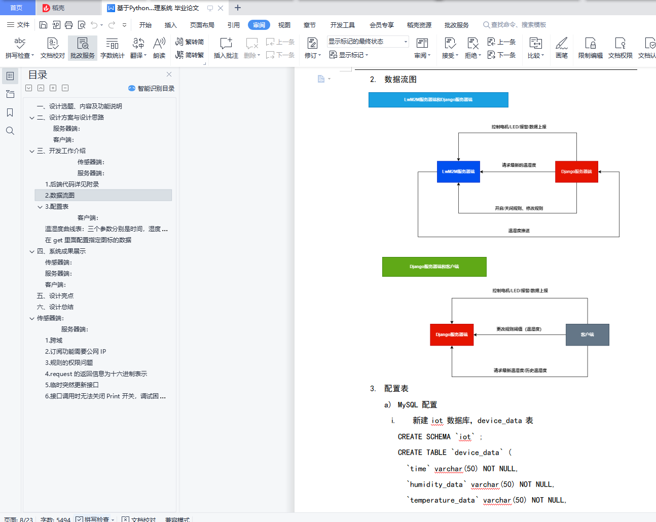 目录一、设计选题、内容及功能说明 1二、设计方案与设计思路 3服务器端: 3客户端: 5三、开发工作介绍 61. 后端代码详见附录 82. 数据流图 93. 配置表 9温湿度曲线表:三个参数分别是时间,湿度和温度 14在 get 里面配置指定图标的数据 14四、系统成果展示 18传感器端: 18服务器端: 18客户端: 22五、设计亮点 25六、设计总结 27传感器端: 271. 跨域 272. 订阅功能需要公网 IP 273. 规则的权限问题 284. request 的返回信息为十六进制表示 285. 临时突然更新接口 286. 接口调用时无法关闭 Print 开关,调试困难 28一、设计选题、内容及功能说明我们设计选择的是题目三:一个火警报警及应急处理系统。主要需要实现四个功能:1.感知环境温度,当环境温度超过阈值,自动触发报警:终端 led 以固定频率闪烁,终端上电机转动2.基础功能指令实现,可以远程设置阈值3.报警状态下,按下按钮可以现场解除报警4.通过网页查询温湿度,显示温湿度曲线,远程关闭或打开报警为了实现上述功能,我们兵分四路,分别处理传感器端、LwM2M 端、Django 服务器端和客户端,通过确定接口,调用 api、订阅信息,完成一系列的工作流程。最终我们完全实现了题目三的要求内容,并颇具亮点。并且,我们还完成了对于传感器端的完全掌握,客户端、服务器端也都留出了相应的接口方便以后的拓展,对于基础 IOT 开发,其工作流程以及工程方面的拓展性,都有了较深的认识。
