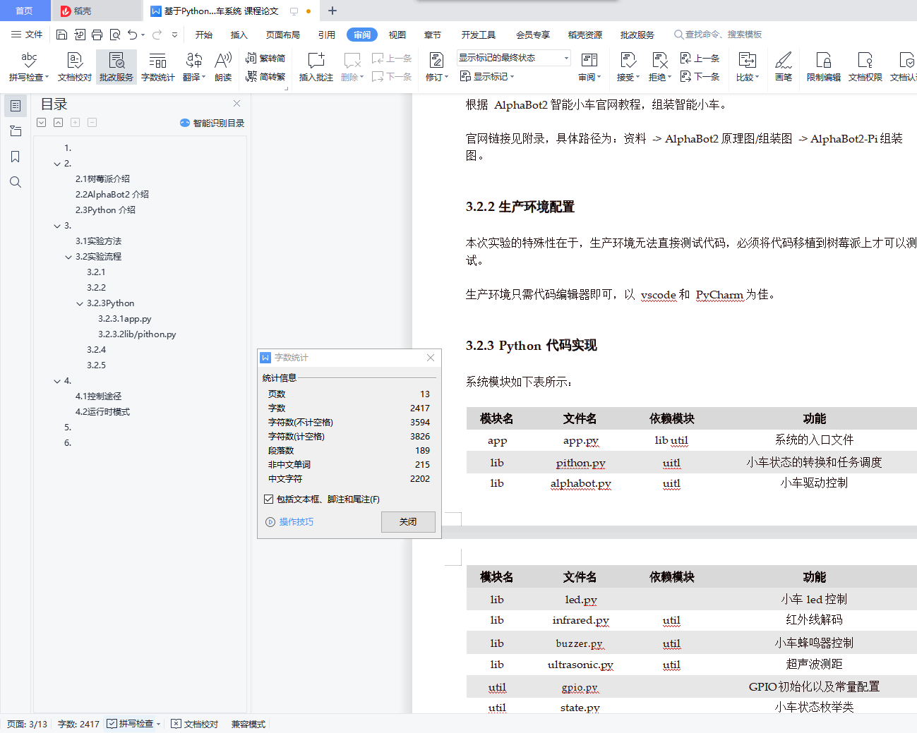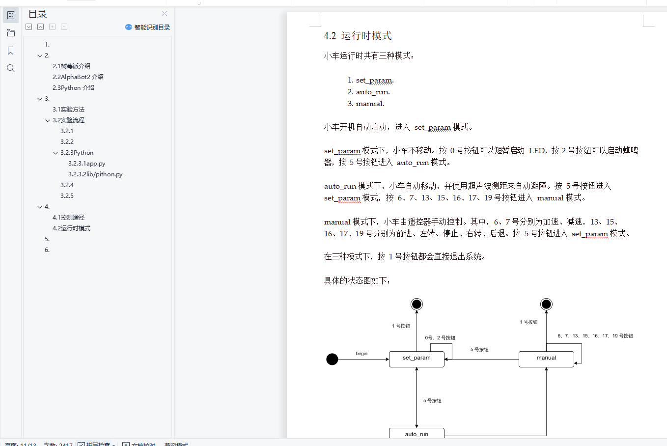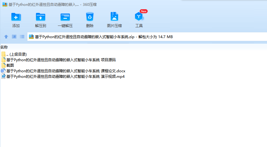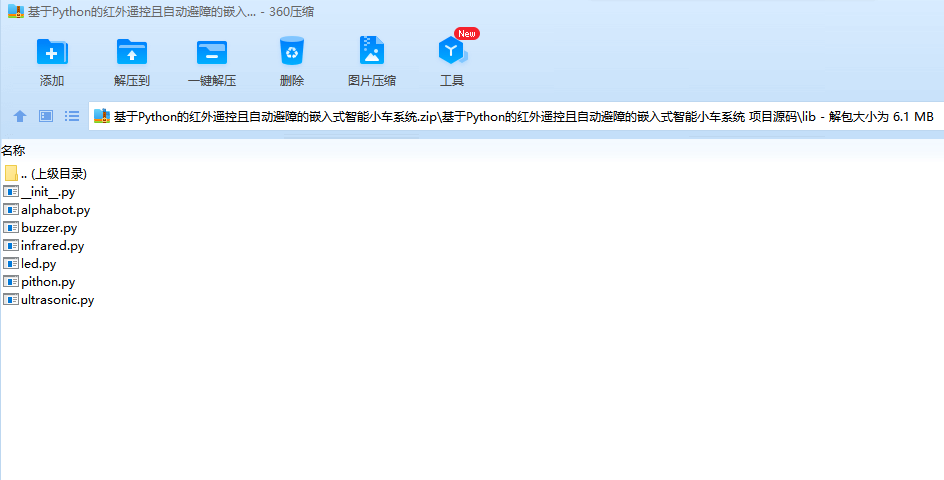 目录1.实验目的2.实验介绍2.1树莓派介绍2.2AlphaBot2 介绍2.3Python 介绍3.实验内容3.1实验方法3.2实验流程3.2.1智能小车组装3.2.2生产环境配置3.2.3Python 代码实现3.2.3.1app.py3.2.3.2lib/pithon.py3.2.4树莓派测试环境配置3.2.5运行智能小车4.实验结果4.1控制途径4.2运行时模式5.收获与不足6.附录1.嵌入式系统(Embedded System),是一种嵌入机械或电气系统内部、具有专一功能和实时计算性能的计算机系统。嵌入式计算机是面向应用、面向产品的、具有特定用途的计算机。它们没有刻意被制造成计算机的形态,往往以产品本身的形式展现在用户面前。本次实验使用树莓派作为开发平台,AlphaBot 作为开发载体,Python 作为开发语言,开发一种基于红外线遥控控制的、可自动避障的嵌入式智能小车系统。2.2.1树莓派介绍树莓派结构简单、体积小、耗电低,却拥有与普通计算机几乎相同的功能和性能,可以很方便地植入到各种应用系统中。此类单板计算机是典型的嵌入式系统的基础。2.2AlphaBot2 介绍AlphaBot2 智能车开发套件,包含一个基板 AlphaBot2-Base 和一个适配板(AlphaBot2-Ar、AlphaBot2-Pi、AlphaBot2-PiZero 三者之一)。其结构稳定,集成度高,不用复杂的组装以及繁琐的接线,有助于快速学习嵌入式系统开发。2.3Python 介绍Python 有着大量支持嵌入式系统开发的第三方库,例如 RPi.GPIO 等。以 Python 作为开发语言,可以避免直接与底层交互,将主要精力放在高层抽象逻辑上。3.源码见附录处。3.1实验方法本次实验使用 Python 的第三方库 RPi.GPIO 和 rpi_ws281x,实现小车的红外控制、led 控制、蜂鸣器控制、超声波自动避障。