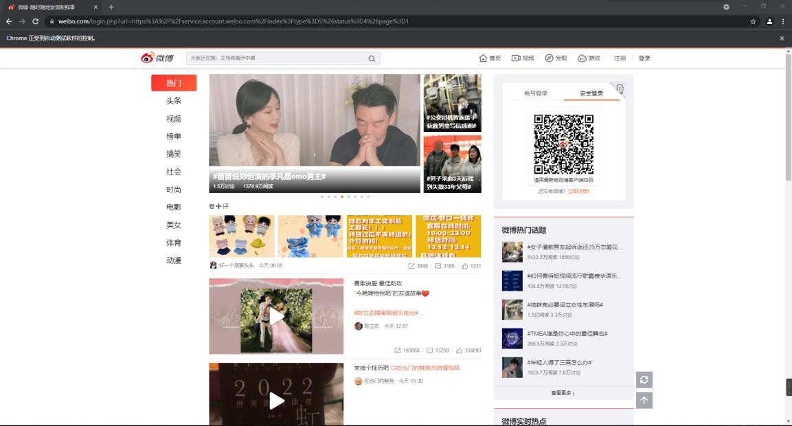 通过多次尝试,我发现,微博网页的 Cookie 获取无论是通过账号密码或是邮箱方式,最后都必须通过手机短信或者手机扫码才能成功,即完全自动化的 Cookie 获取是比较困难的。因此我利用 selenium 来自动跳转至扫码界面(图 2):