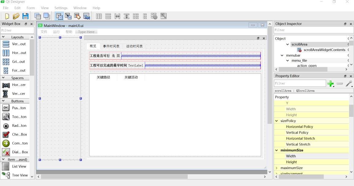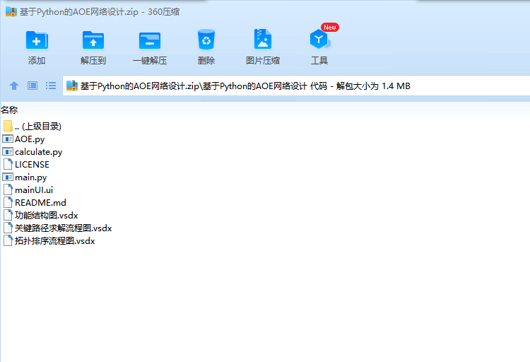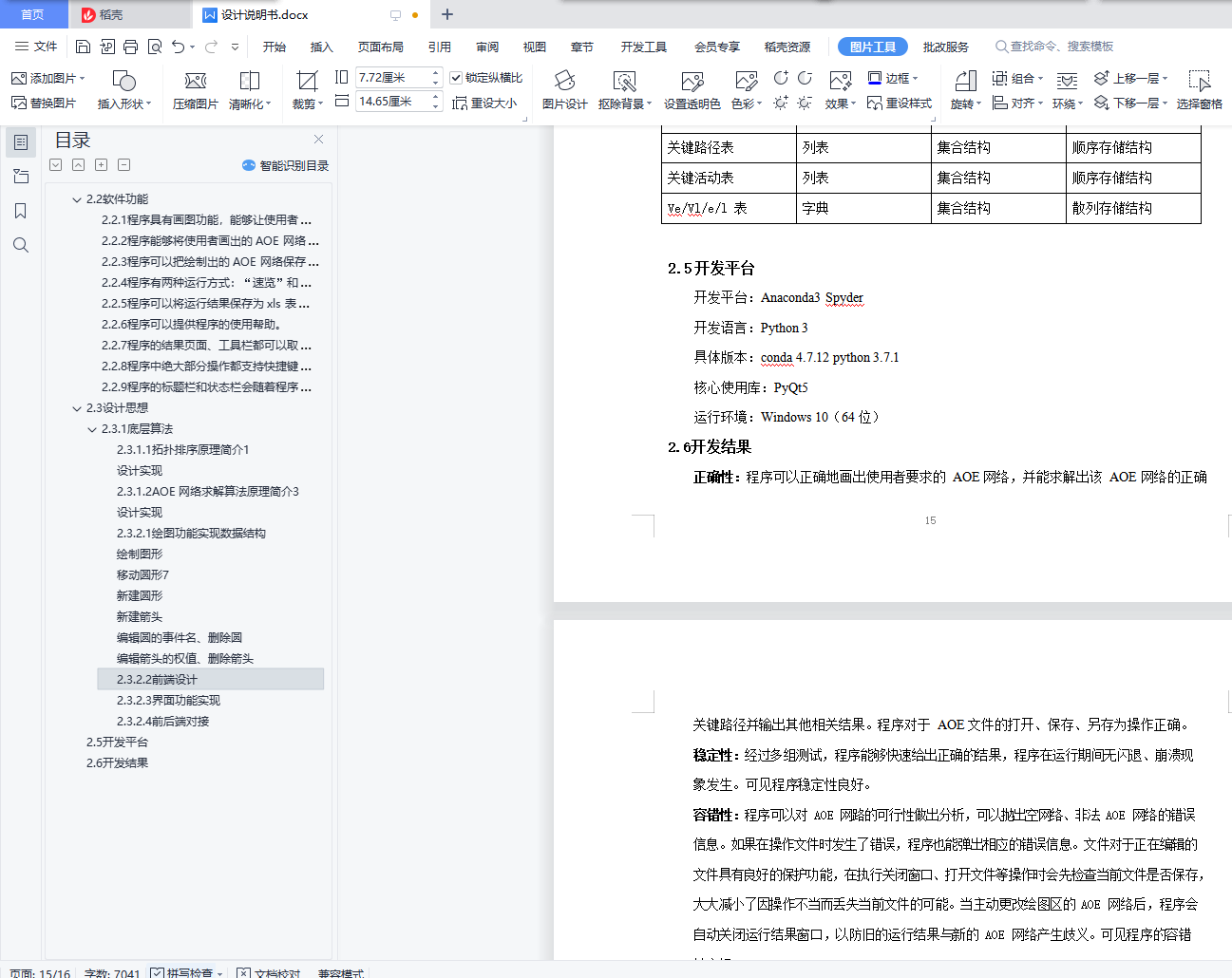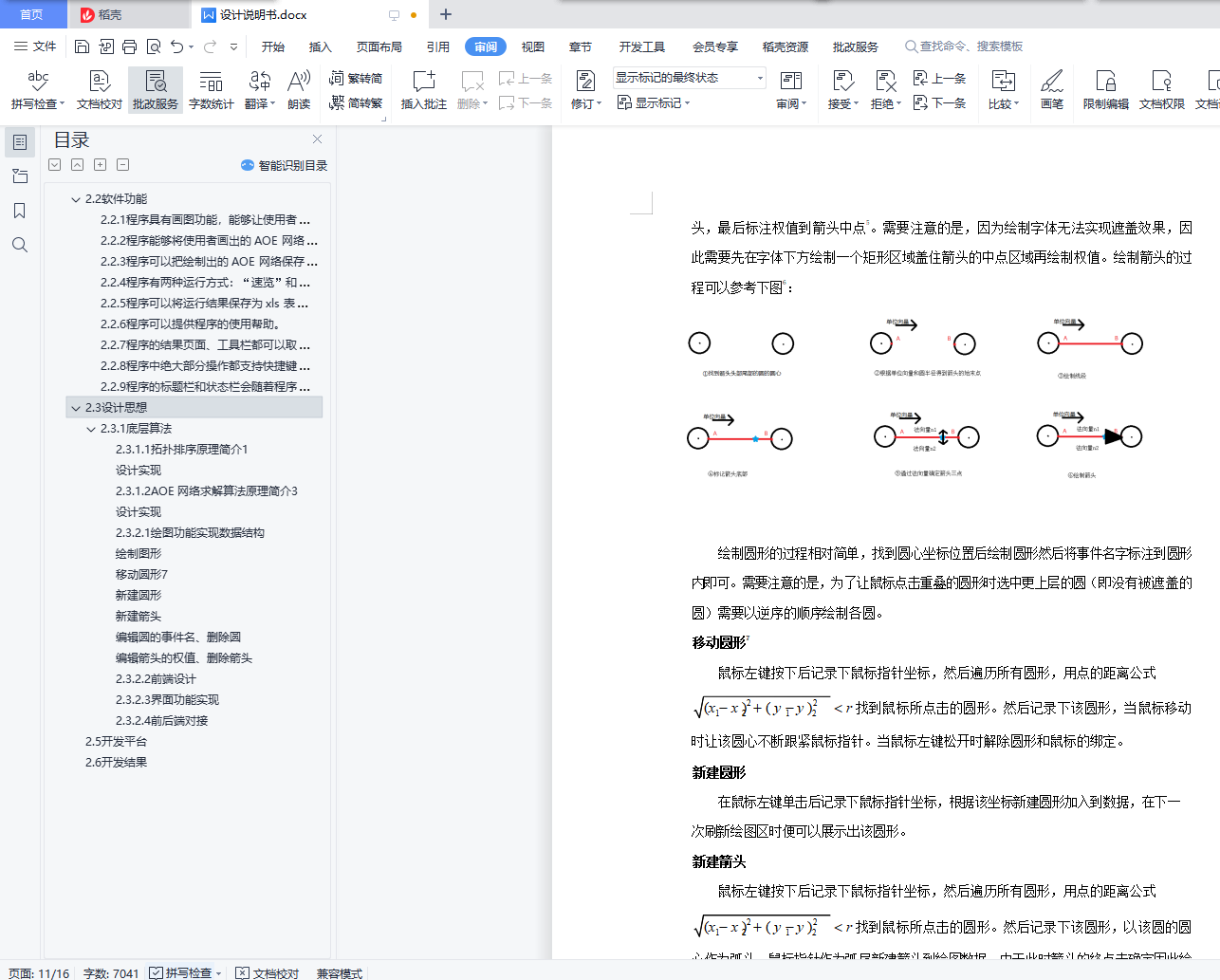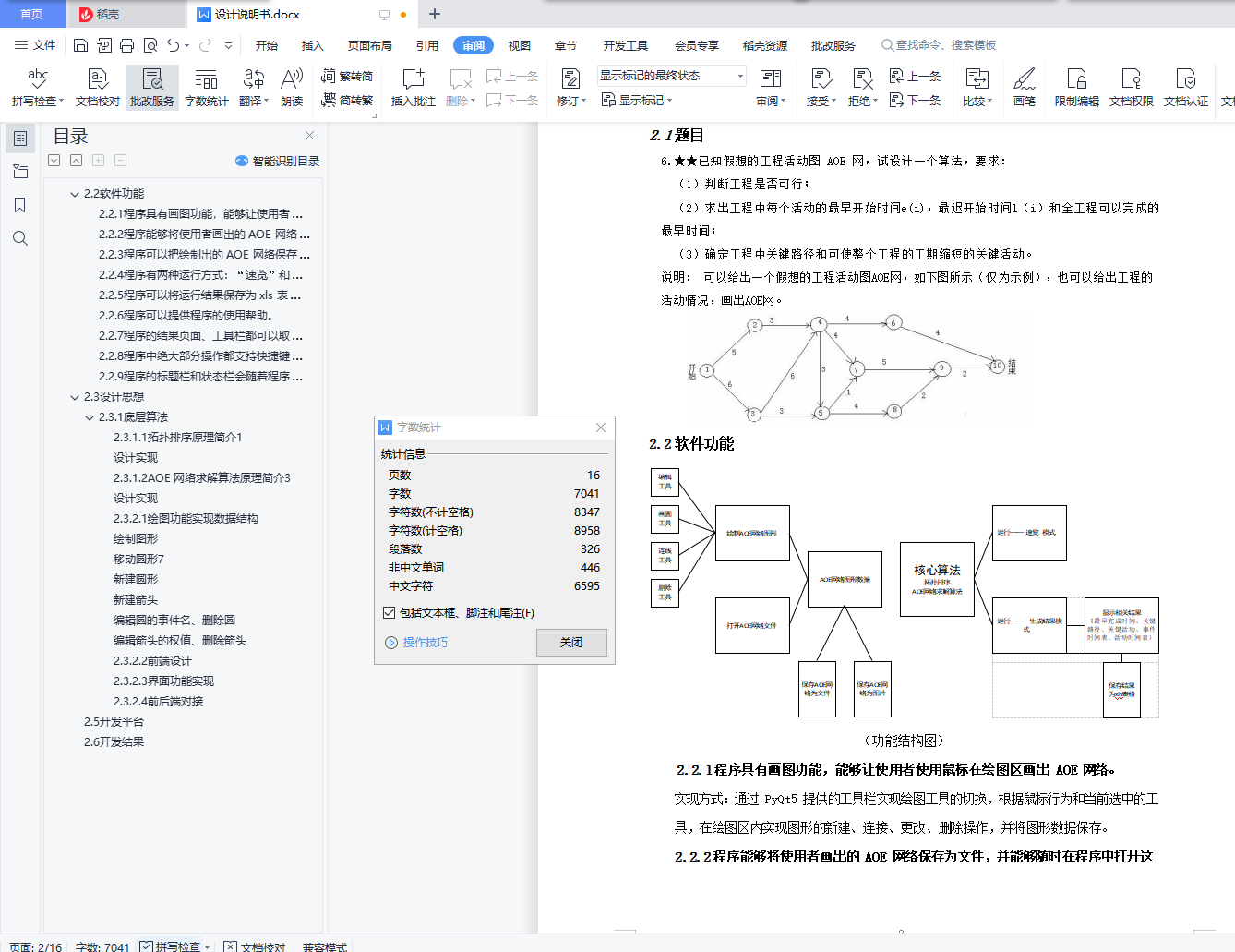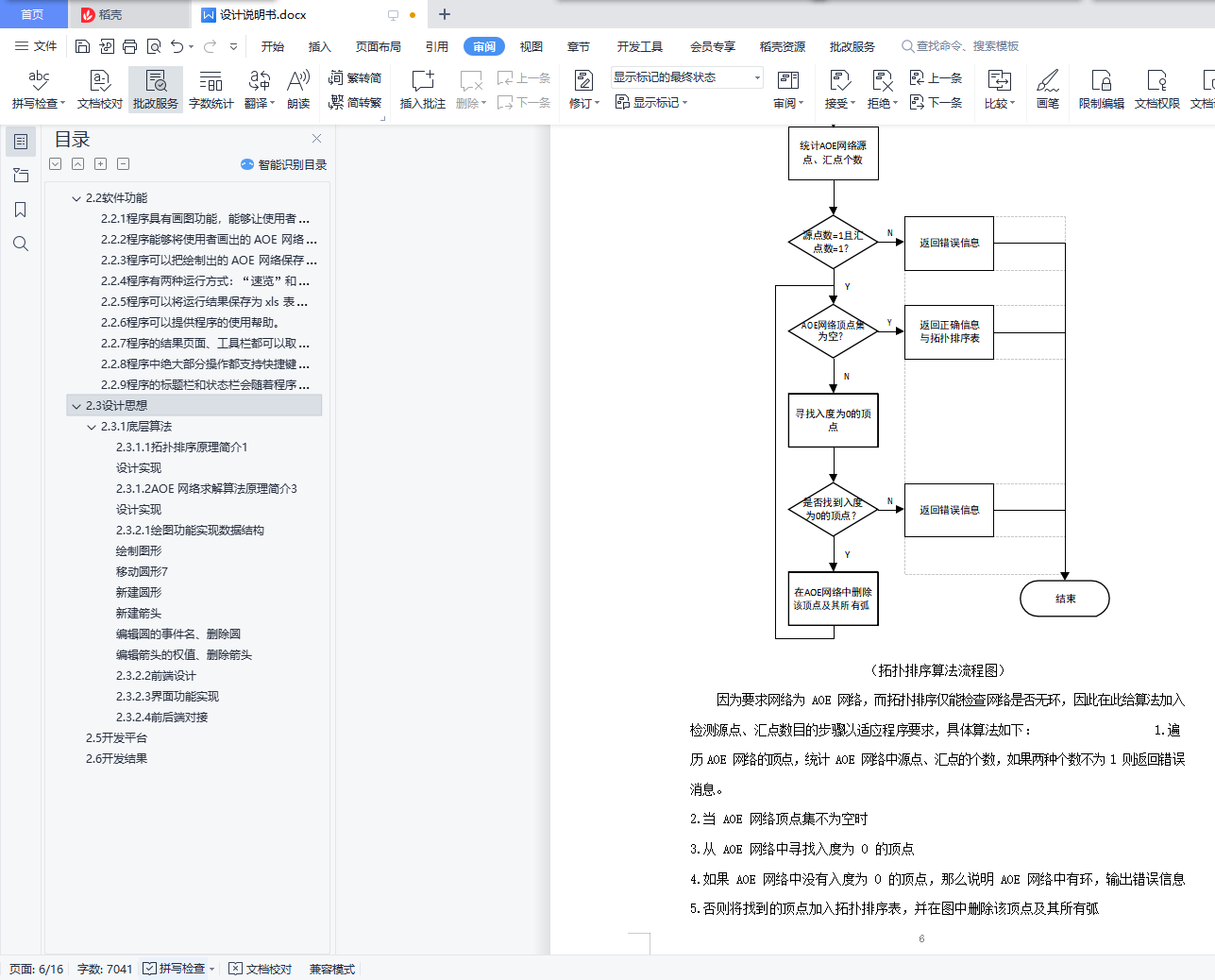 目录2.2 软件功能 12.2.1 程序具有画图功能,能够让使用者使用鼠标在绘图区画出 AOE 网络。 22.2.2 程序能够将使用者画出的 AOE 网络保存为文件,并能够随时在程序中打开这 22.2.3 程序可以把绘制出的 AOE 网络保存为图片,图片支持四种格式:jpg、png、 32.2.4 程序有两种运行方式:“速览”和“生成结果”。“速览”可以检查 AOE 网络是否可行,如果可行将在绘图区内把相应的关键路径标红,如果不可行将输出提示信息。“生成结果”除了能完成“速览”的功能外,还可以输出工程 AOE 网络的最早完成时间、关键路径、关键活动、事件时间表、活动时间表。 32.2.5 程序可以将运行结果保存为 xls 表格文件。 32.2.6 程序可以提供程序的使用帮助。 32.2.7 程序的结果页面、工具栏都可以取消停靠,以新窗口的形式呈现。 32.2.8 程序中绝大部分操作都支持快捷键操作。 32.2.9 程序的标题栏和状态栏会随着程序状态的改变显示不同的信息。 32.3 设计思想 52.3.1 底层算法 52.5 开发平台 152.6 开发结果 15第二部分 综合应用设计说明2.1题目6.★★已知假想的工程活动图 AOE 网,试设计一个算法,要求:(1)判断工程是否可行;(2)求出工程中每个活动的最早开始时间e(i),最迟开始时间l(i)和全工程可以完成的最早时间;(3)确定工程中关键路径和可使整个工程的工期缩短的关键活动。说明: 可以给出一个假想的工程活动图AOE网,如下图所示(仅为示例),也可以给出工程的活动情况,画出AOE网。