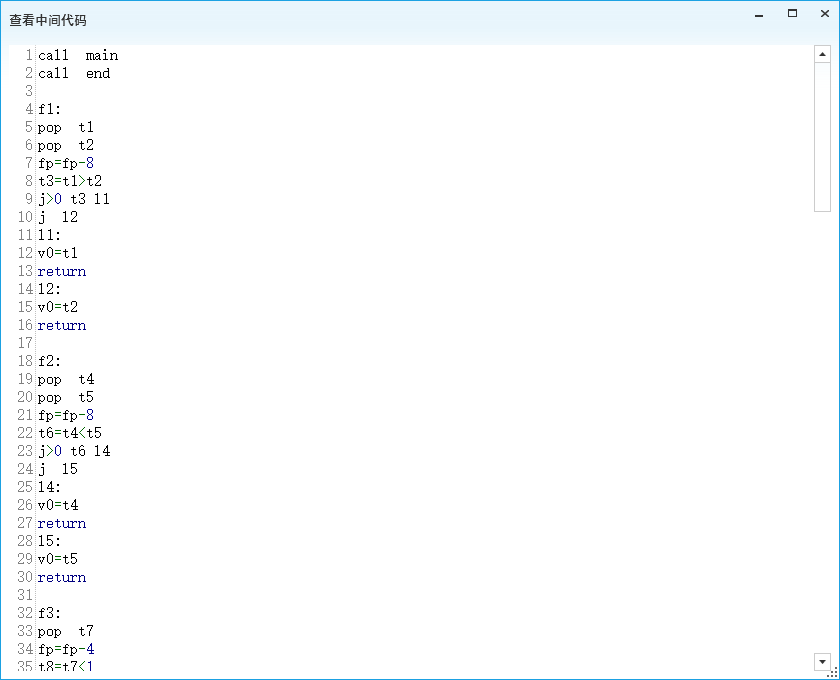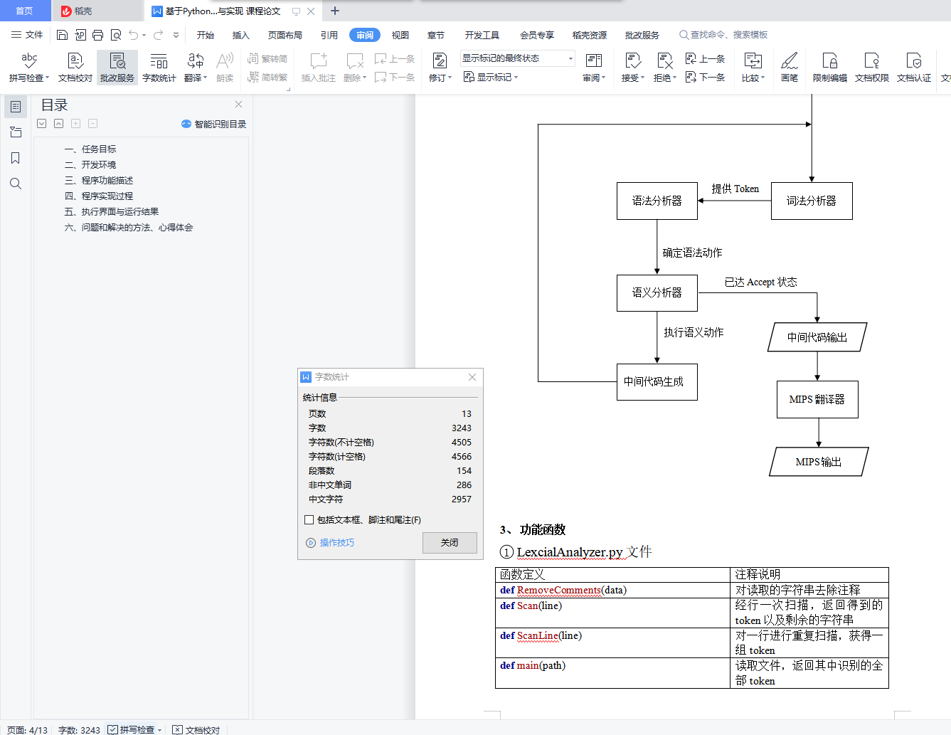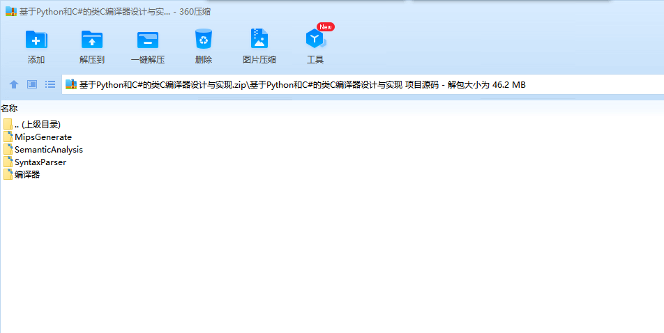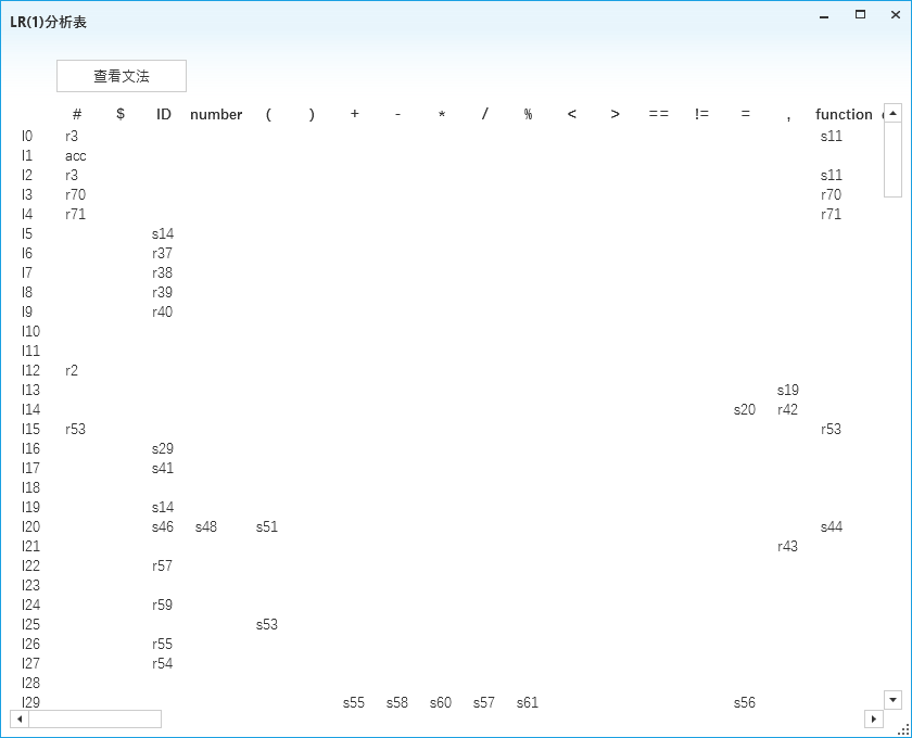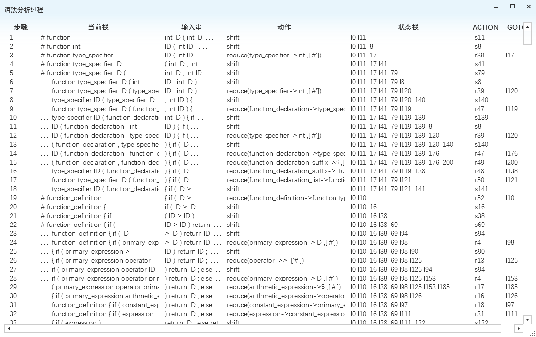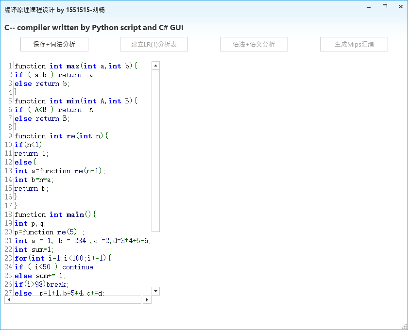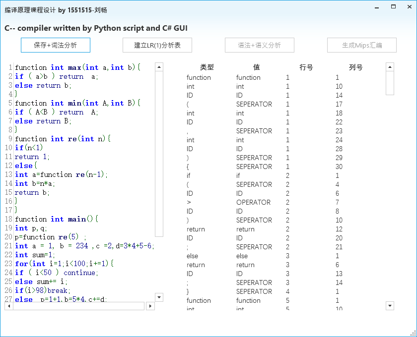 目录一、 任务目标 1二、 开发环境 1三、 程序功能描述 1四、 程序实现过程 1五、 执行界面与运行结果 5六、 问题和解决的方法、心得体会 12一、任务目标1、掌握使用高级程序语言实现一个一遍完成的、简单语言的编译器的方法。2、掌握简单的词法分析器、语法分析器、符号表管理、中间代码生成以及目标代码生成的实现方法。3、掌握将生成代码写入文件的技术。二、开发环境编程语言:Python 2.7、C# 7.0使用工具: Visual Studio 2017、Pycharm 2018操作系统:Windows 10,版本17134运行环境:.Net Framework 4.6.1三、程序功能描述实现了C- -语言的词法分析、对所用文法LR(1)分析表的建立、语法分析、语义分析(包括语义栈、符号表、函数表、中间代码生成以及写入文件,方法为一遍扫描)、MIPS汇编生成及写入文件。支持源代码保存、文法产生式显示、LR(1)分析表显示、分析过程展示、中间代码及MIPS汇编展示。四、程序实现过程1、主要算法与模块①词法分析:正则表达式匹配算法:我借鉴了工具lex的词法分析算法,以正则表达式匹配的方法代替DFA进行词法分析,通过6个正则表达式并行匹配词法元素,每一次将位于开头的最长匹配序列识别为对应的正则表达式所代表的token,从而实现了词法分析。②LR(1)语法分析:求FIRST集算法由于文法中产生式非终结符的FIRST集存在相互依赖关系,使用递归法会导致计算量的巨大,因此我使用了自下而上求解FIRST集依赖的算法:对于每个产生式左侧非终结符T,若其FIRST依赖于另一非终结符F,则将F加入到其FIRST集中。将所有FIRST集中含有非终结符的非终结符加入到列表Q中,当Q不为空时,对每个元素进行遍历:若其依赖的非终结符不在Q中,则将其替换为它的FIRST集中的终结符,当其FIRST集中依赖的非终结符均被替换后,执行出队操作。达到了自底向上求解依赖关系的效果。