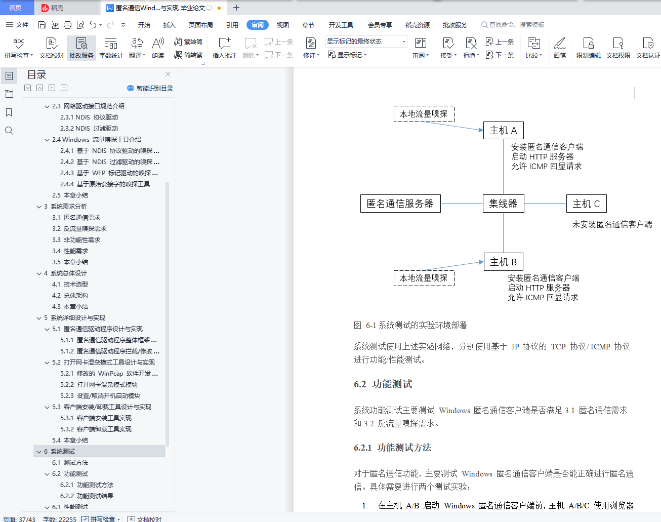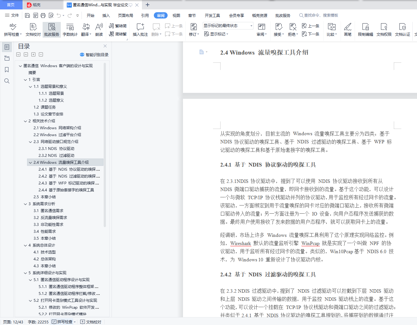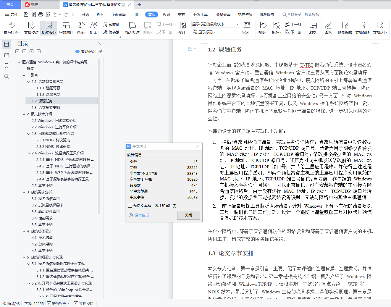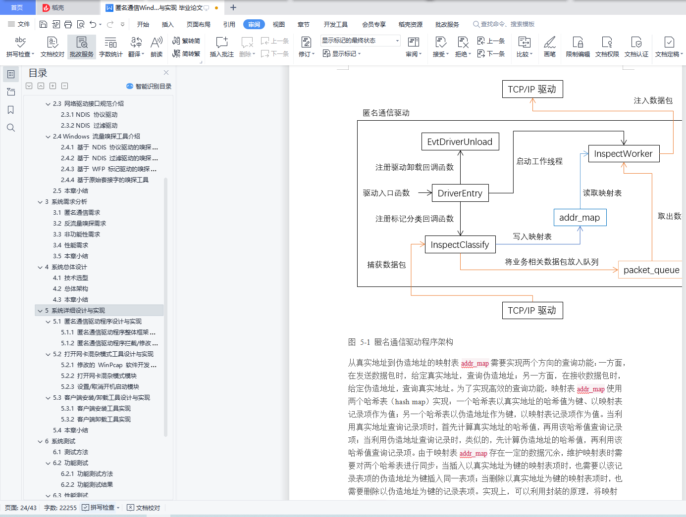匿名通信 Windows 客户端的设计与实现摘要目前许多企业网络面临着流量嗅探的安全威胁。不法分子通过技术手段,拦截、分析网络中的流量。为了防止恶意流量嗅探,可以使用匿名通信技术,将流量中的 MAC 地址、IP 地址、TCP/UDP 端口号进行伪造。匿名通信系统要求在主机上部署匿名通信客户端,用于实现匿名通信协议,同时防止本地恶意软件进行原始流量嗅探。本课题基于 U-TRI 匿名通信系统,设计一个 Windows 匿名通信客户端。该客户端在匿名通信系统中扮演了重要角色,实现了两个重要功能:第一,实现匿名通信协议,拦截/修改主机流量,与匿名通信网络设备共同防止网络中的流量嗅探;第二,采用 WFP 标记驱动作为拦截/修改流量的内核,防止本地流量嗅探。该客户端包括三个部分:用于处理核心拦截/修改业务逻辑的匿名通信驱动程序、用于配合驱动程序工作的打开网卡混杂模式工具和为简化软件部署/移除流程而设计的客户端安装/卸载工具。经系统测试,该客户端通过了功能测试,并达到性能基本要求。本文首先介绍了选题的背景、意义和相关技术;其次分析了系统需求,并根据需求对 Windows 匿名通信客户端进行设计与实现;再次对客户端进行功能测试和性能测试;最后总结了本课题的工作,并提出了存在的问题和对进一步完善的展望。关键词 匿名通信 反嗅探 网络驱动目录匿名通信 Windows 客户端的设计与实现 1摘要 11 引言 21.1 选题背景和意义 21.2 课题任务 31.3 论文章节安排 42 相关技术介绍 52.1 Windows 网络架构介绍 52.2 Windows 过滤平台介绍 82.3 网络驱动接口规范介绍 112.4 Windows 流量嗅探工具介绍 132.5 本章小结 153 系统需求分析 153.1 匿名通信需求 153.2 反流量嗅探需求 163.3 非功能性需求 173.4 性能需求 173.5 本章小结 184 系统总体设计 184.1 技术选型 184.2 总体架构 214.3 本章小结 235 系统详细设计与实现 235.1 匿名通信驱动程序设计与实现 235.2 打开网卡混杂模式工具设计与实现 325.3 客户端安装/卸载工具设计与实现 355.4 本章小结 366 系统测试 376.1 测试方法 376.2 功能测试 386.3 性能测试 406.4 本章小结 427 结束语 427.1 工作总结 427.2 问题与展望 43