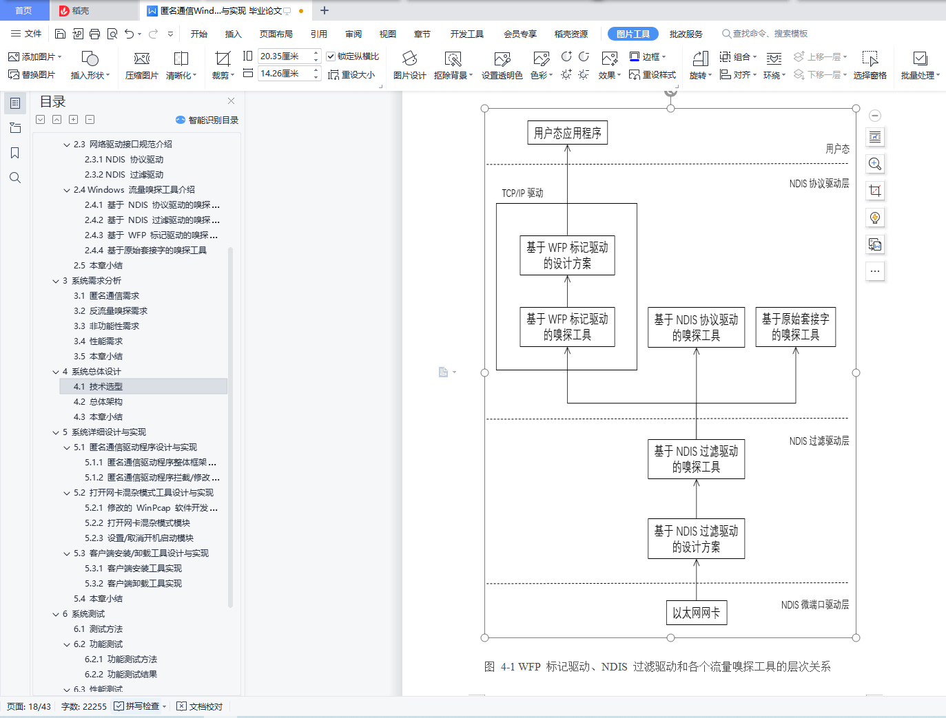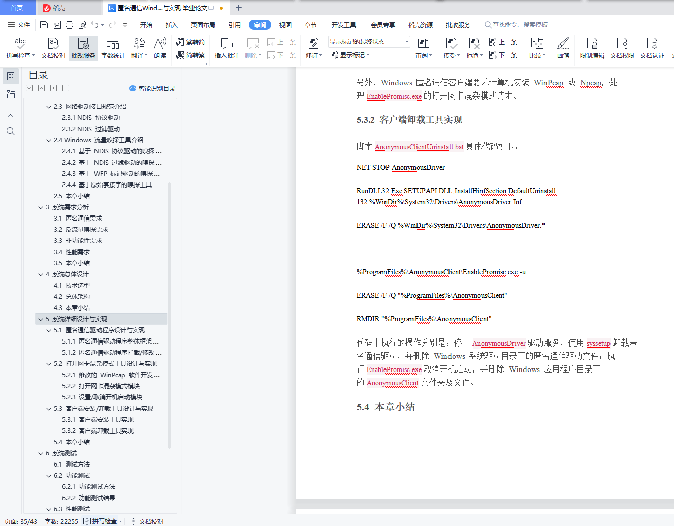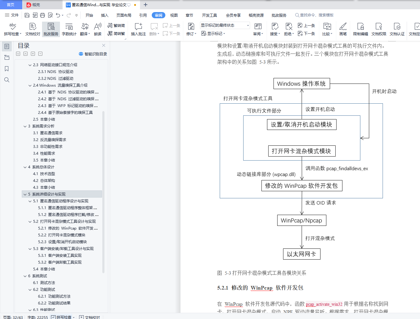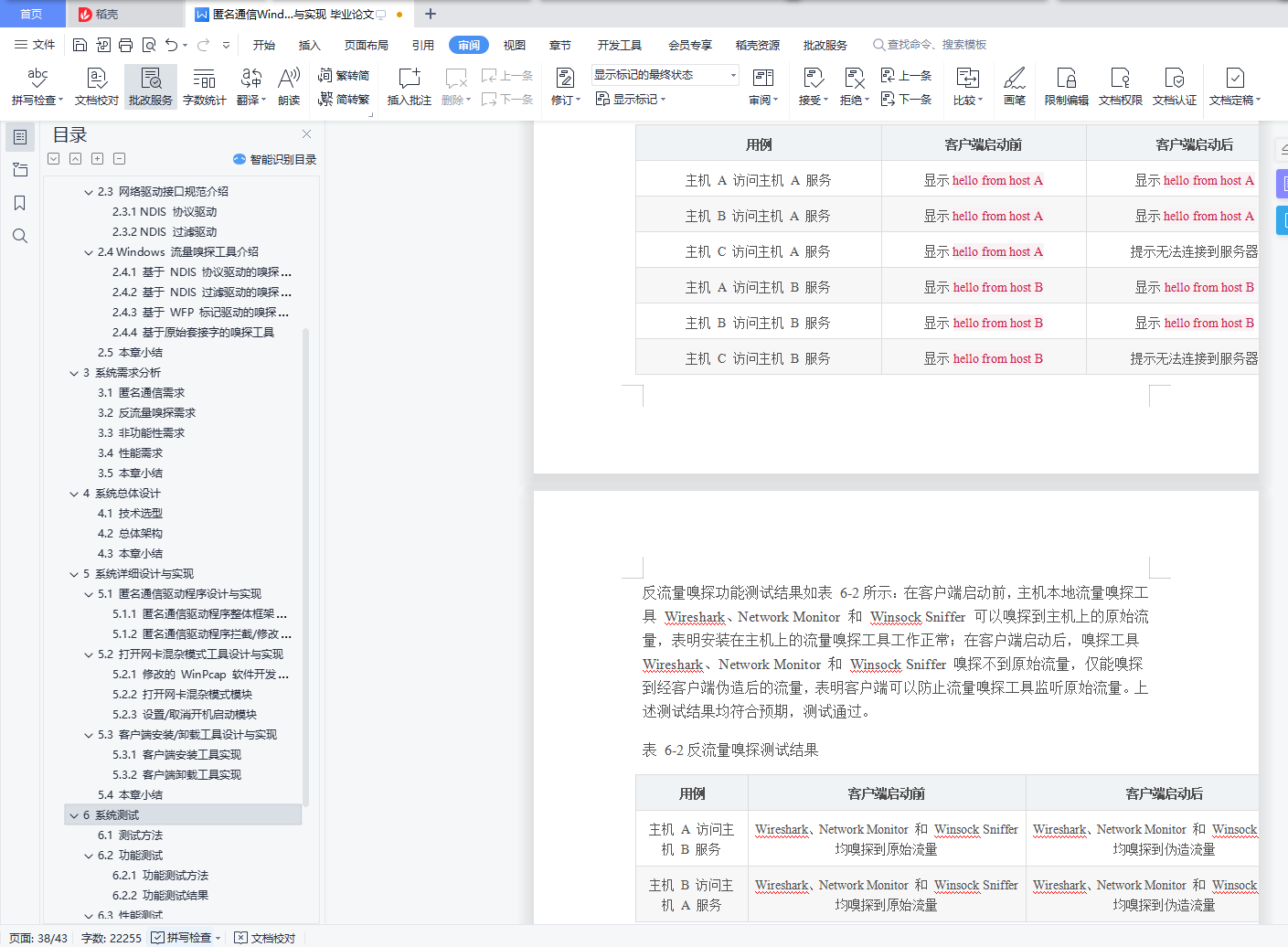 匿名通信 Windows 客户端的设计与实现摘要目前许多企业网络面临着流量嗅探的安全威胁。不法分子通过技术手段,拦截、分析网络中的流量。为了防止恶意流量嗅探,可以使用匿名通信技术,将流量中的 MAC 地址、IP 地址、TCP/UDP 端口号进行伪造。匿名通信系统要求在主机上部署匿名通信客户端,用于实现匿名通信协议,同时防止本地恶意软件进行原始流量嗅探。本课题基于 U-TRI 匿名通信系统,设计一个 Windows 匿名通信客户端。该客户端在匿名通信系统中扮演了重要角色,实现了两个重要功能:第一,实现匿名通信协议,拦截/修改主机流量,与匿名通信网络设备共同防止网络中的流量嗅探;第二,采用 WFP 标记驱动作为拦截/修改流量的内核,防止本地流量嗅探。该客户端包括三个部分:用于处理核心拦截/修改业务逻辑的匿名通信驱动程序、用于配合驱动程序工作的打开网卡混杂模式工具和为简化软件部署/移除流程而设计的客户端安装/卸载工具。经系统测试,该客户端通过了功能测试,并达到性能基本要求。本文首先介绍了选题的背景、意义和相关技术;其次分析了系统需求,并根据需求对 Windows 匿名通信客户端进行设计与实现;再次对客户端进行功能测试和性能测试;最后总结了本课题的工作,并提出了存在的问题和对进一步完善的展望。关键词 匿名通信 反嗅探 网络驱动目录匿名通信 Windows 客户端的设计与实现 1摘要 11 引言 21.1 选题背景和意义 21.2 课题任务 31.3 论文章节安排 42 相关技术介绍 52.1 Windows 网络架构介绍 52.2 Windows 过滤平台介绍 82.3 网络驱动接口规范介绍 112.4 Windows 流量嗅探工具介绍 132.5 本章小结 153 系统需求分析 153.1 匿名通信需求 153.2 反流量嗅探需求 163.3 非功能性需求 173.4 性能需求 173.5 本章小结 184 系统总体设计 184.1 技术选型 184.2 总体架构 214.3 本章小结 235 系统详细设计与实现 235.1 匿名通信驱动程序设计与实现 235.2 打开网卡混杂模式工具设计与实现 325.3 客户端安装/卸载工具设计与实现 355.4 本章小结 366 系统测试 376.1 测试方法 376.2 功能测试 386.3 性能测试 406.4 本章小结 427 结束语 427.1 工作总结 427.2 问题与展望 43
