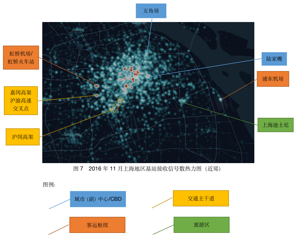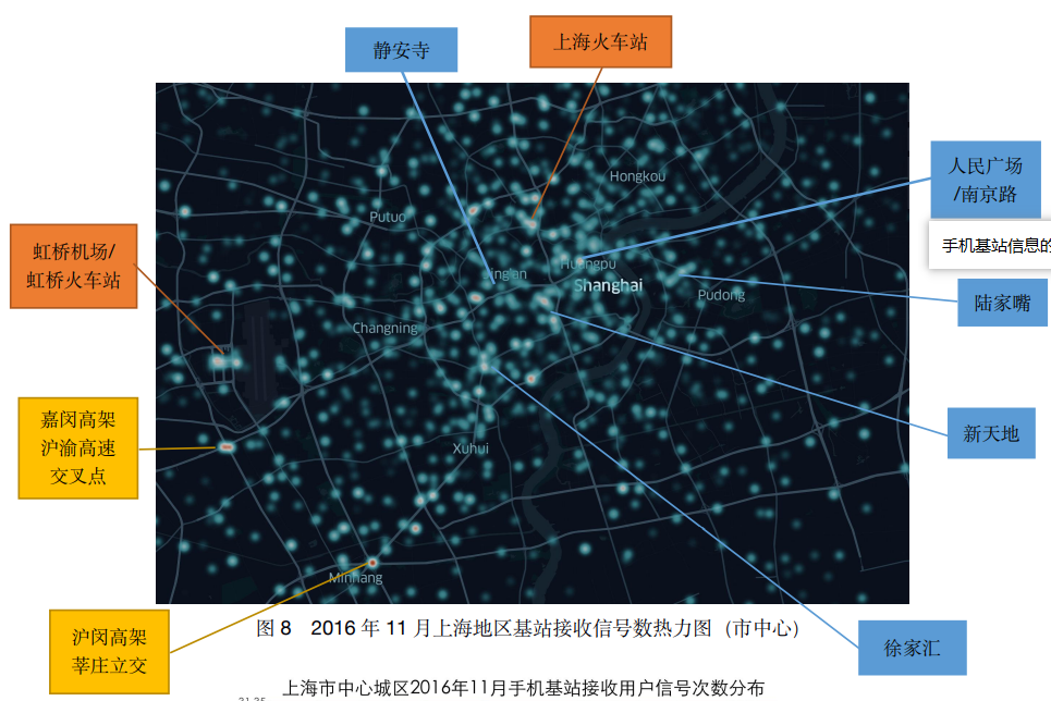 对基站位置作出散点图不难发现,数据的覆盖范围为上海市。注意到,原始数据中不包含单条信令的时间戳,而是用户月度在单个基站的观测总数,难以从微观上分析用户单日的行为特征,或区分工作地与居住地。但是原始数据的大数据量对于从宏观上分析上海市各个区域的经济特征提供了充分的信息,因此本研究着重于对已有的手机信令数据进行可视化展示,找出手机信令集中的热点地区;以及分区统计,尝试分析手机信令信息与各区经济指标、产业划分的联系。由于原始数据中不包含基站所属的行政区划信息,首当其冲的一步是需要根据各个基站的经纬度,获得其所属的区划信息。这里使用 R 中的 rgdal 包对互联网上获得的全国县级行政区划边界数据2进行了预处理(代码见 code/shanghai_map.R),运用 python的 shapely 包中实现的地理围栏算法获得了基站经纬度的对应区划( 代码见code/geo_fencing.py)。