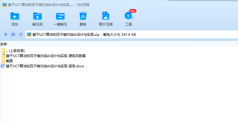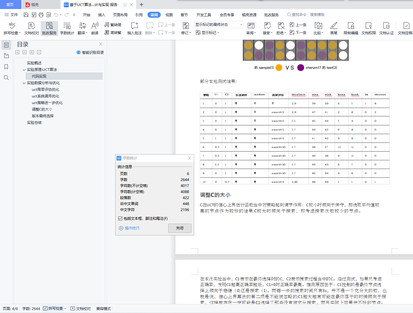 四⼦棋实验报告四子棋实验报告实验概述实验原理:UCT算法代码实现实验数据分析与优化uct局面评估优化uct系统调用优化uct策略进一步优化调整C的大小版本最终选择实验总结实验概述1.实现了使用UCT算法的的四子棋对战AI。2.对算法的性能进行了分析并做出对应优化。3.最终版本采用:使用UCT算法+系统调用优化+随机优化。4.在OJ和本地分别对给出的50个dll分别采用先、后手进行测试,OJ胜率94%,本地胜率97%。实验原理:UCT算法在算法的选择上,有 剪枝和蒙特卡洛两种算法。 剪枝算法需要先给定一个对四子棋局面的评估函数,但在本次实验当中,四子棋并不是所有的地方都可以落子,因此人工给出估价函数是一个比较困难的事情。而蒙特卡洛方法采用的是多次模拟、选取胜率最大节点的方法,并不需要关于四子棋的知识。UCT算法是对蒙特卡洛方法的扩展,引入了信心上界来对局面进行评 估: