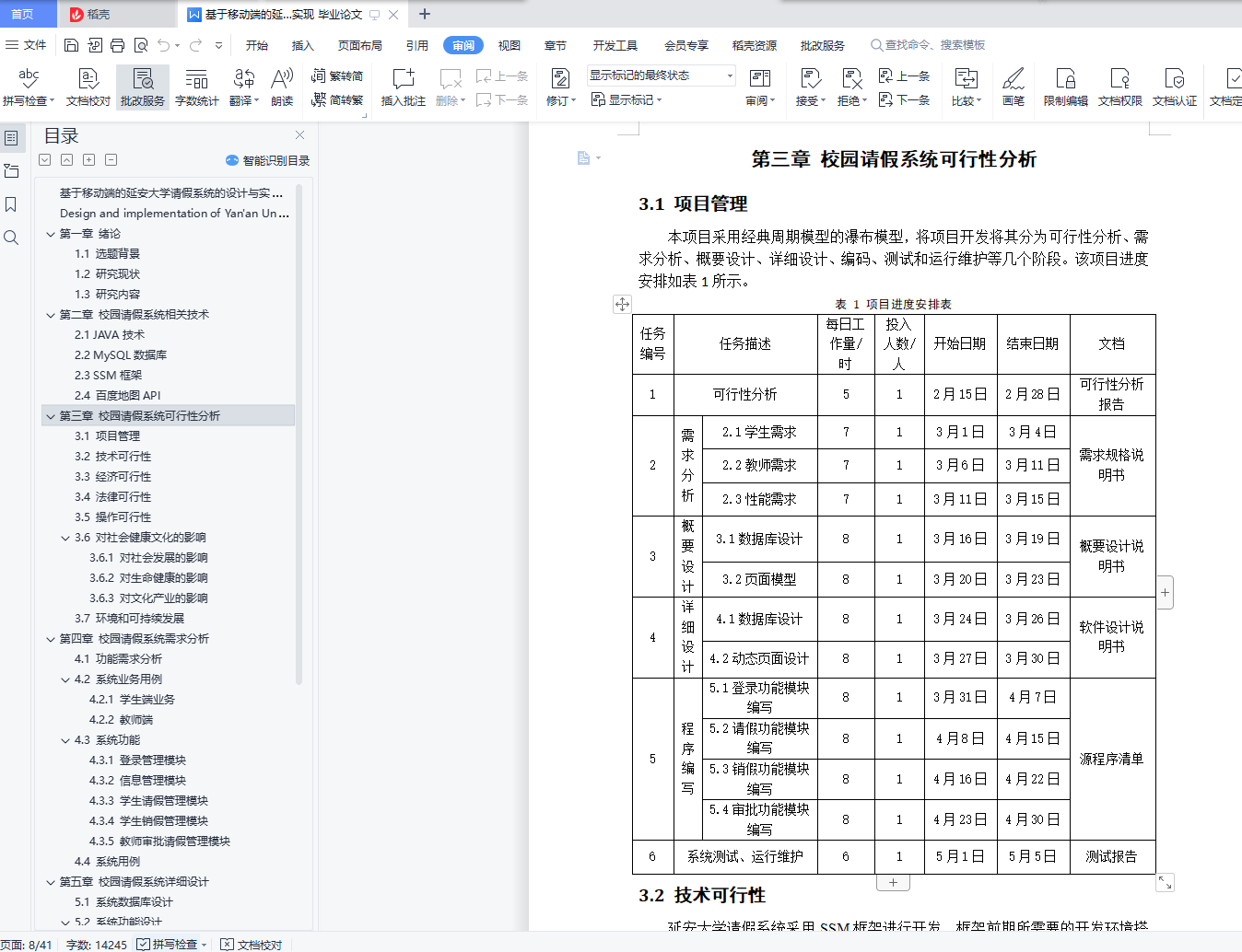 基于移动端的延安大学请假系统的设计与实现摘要:目前,延安大学请假是学生提出书面申请,请假不超过三日由辅导员审批,请假三日以上由院系主管学生工作负责人审批,这种请假模式效率低、耗时。为了方便学生、辅导员和负责人,本毕业设计实现延安大学请假系统。该系统依据延安大学本科生学籍管理手册的请假制度,设计学生请假、管理员审批、定位销假、请假信息管理等功能。利用SSM框架进行开发,Java为编程语言,MySQL为数据库管理,实现在线请销假功能。利用黑盒测试方法,检测了学生提交请假申请,管理员在线审批,学生定位销假,查询请销假信息等功能,系统可以满足延安大学请销假需求,提高管理效率。关键词:手机软件;请假系统;设计与实现;SSM框架Design and implementation of Yan'an University leave system based on mobile terminalAbstract: At present, Yan'an university leave is a written application by students, which is approved by counselors for no more than three days, and approved by the person in charge of student affairs of the Department for more than three days. This leave mode is inefficient and time-consuming. In order to facilitate students, counselors and principals, this graduation project implements Yan'an university leave system. According to the leave system of Yan'an University's undergraduate student status management manual, the system designs the functions of students' leave, administrator's approval, positioning and cancellation of leave, leave information management and so on. Using SSM framework for development, Java as the programming language, MySQL as the database management, to achieve online leave function.By using the black box test method, the functions of students' submitting leave application, administrator's online approval, students' locating leave, query leave information and so on are tested. The system can meet the leave demand of Yan'an University and improve the management efficiency.Key words: Mobile software; Campus leave system; Design and Implementation; SSM framework目录第一章 绪论 11.1 选题背景 11.2 研究现状 11.3 研究内容 1第二章 校园请假系统相关技术 12.1 JAVA技术 12.2 MySQL数据库 12.3 SSM框架 12.4 百度地图API 2第三章 校园请假系统可行性分析 33.1 项目管理 33.2 技术可行性 43.3 经济可行性 43.4 法律可行性 43.5 操作可行性 43.6 对社会健康文化的影响 43.6.1 对社会发展的影响 43.6.2 对生命健康的影响 53.6.3 对文化产业的影响 53.7 环境和可持续发展 5第四章 校园请假系统需求分析 64.1 功能需求分析 64.2 系统业务用例 64.2.1 学生端业务 64.2.2 教师端 64.3 系统功能 74.3.1 登录管理模块 74.3.2 信息管理模块 84.3.3 学生请假管理模块 94.3.4 学生销假管理模块 104.3.5 教师审批请假管理模块 114.4 系统用例 12第五章 校园请假系统详细设计 145.1 系统数据库设计 145.2 系统功能设计 165.2.1 请假系统用例分析 165.2.2 请假系统类图 205.2.3 请假系统时序图 23第六章 校园请假系统实现 316.1 技术路线 316.2 登录模块实现 316.3 信息模块实现 326.4 学生请假实现 336.5 学生销假实现 356.6 教师审批请假实现 356.7 工程与社会 38第七章 校园请假系统测试 397.1 测试目的 397.2 测试方案设计 397.3 测试用例设计 39第八章 总结与展望 42参考文献 43致谢 44