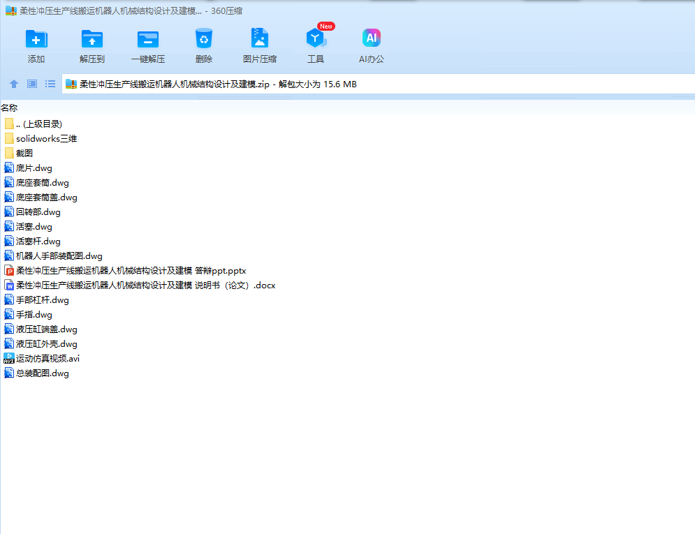 首先,针对柔性冲压生产线的实际情况对机器人进行结构设计、材料的选择及其强度、刚度验证,包括机器人应具有的合理自由度的确定、各个关节尺寸设计,及各个运动关节的结构设计。其次,对机器人关节所需动力源的计算选择,并给出相关技术参数。本文所选择的提供机器人运动的动力元件为液压缸。进行液压缸活塞驱动力计算,及其材料的强度、刚度验证。然后,给出机器人运动控制的初步方案。最后,根据已经设计好的尺寸运用绘图软件建模。将所设计机器人模型导入ADAMS中,通过运动关系副的添加进行运动分析,得到其角速度以及角加速度的运动曲线图,以验证其合理性。