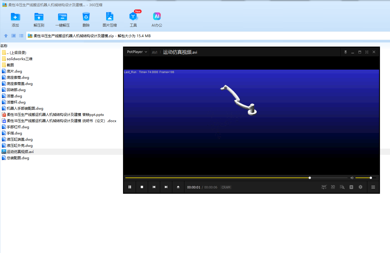 Firstly, choose the materials which is able to satisfy the stiffness and the strength in the actual situation. Also, I have design the structure of the machine. Next, do the job which is verifying the freedom and structure Secondly, the calculation and selection of the power source for the robot joints is given, and the relevant technical parameters are given. The power element of the robot motion is hydraulic cylinder. Hydraulic cylinder piston driving force, and its material strength, stiffness verification. Then, the preliminary scheme of robot motion control is given. Finally, according to the size of the design do the graphics software. Model the robot I have designed into ADAMS. Through the kinematic analysis, the angular velocity and angular acceleration of the motion curve are obtained, and the rationality of the motion curve is verified.