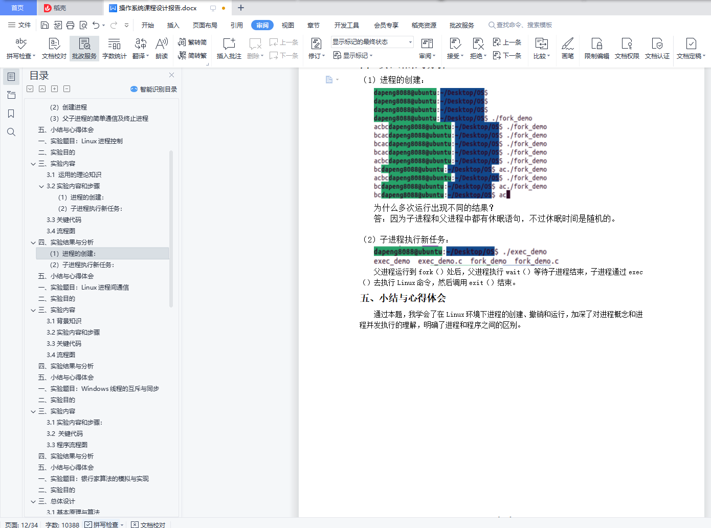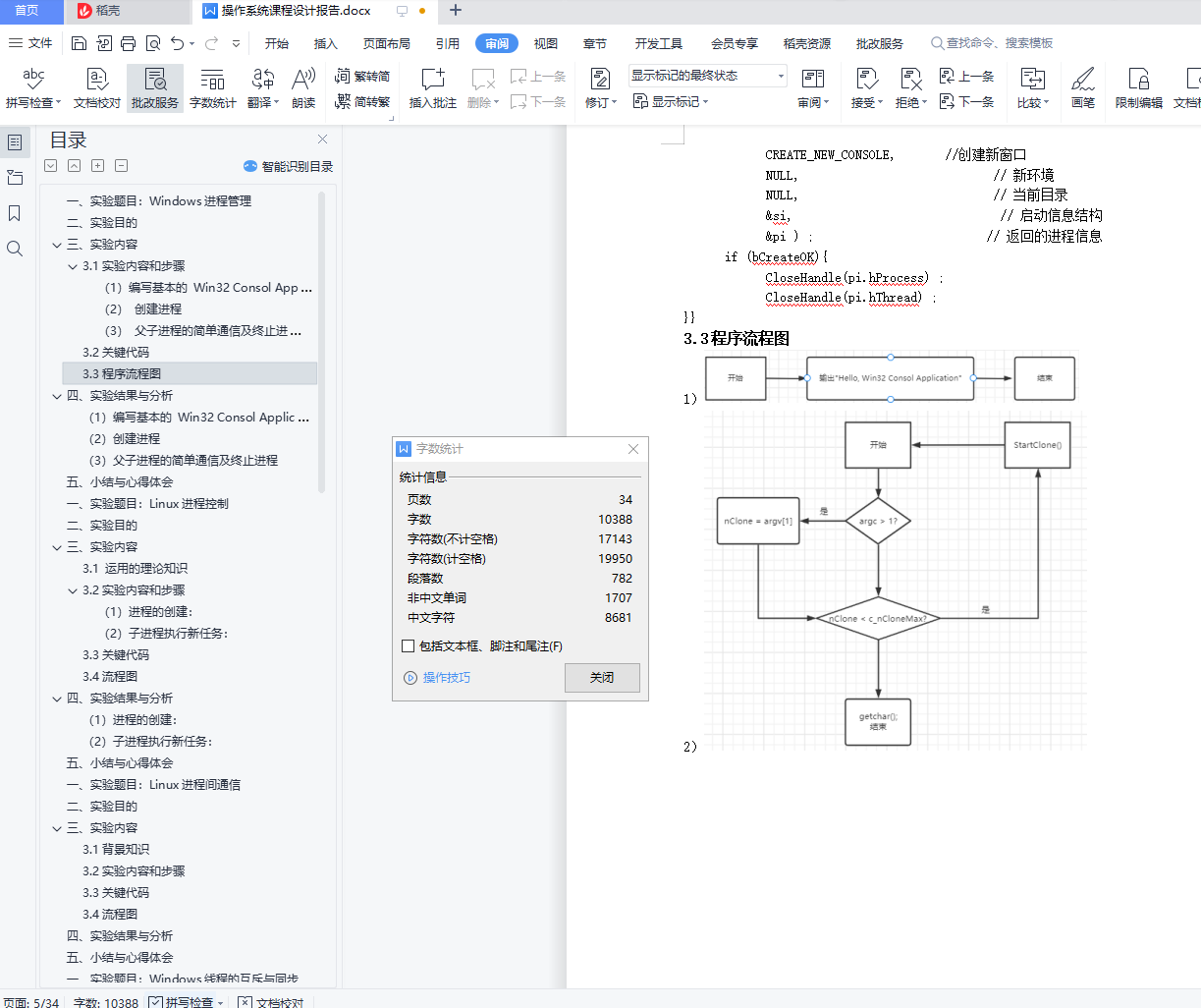 目录一、 实验题目:Windows进程管理 3二、实验目的 3三、实验内容 33.1实验内容和步骤 3(1)编写基本的 Win32 Consol Application 3(2) 创建进程 3(3) 父子进程的简单通信及终止进程 43.2关键代码 43.3程序流程图 5四、 实验结果与分析 6(1)编写基本的 Win32 Consol Application 6(2) 创建进程 6(3) 父子进程的简单通信及终止进程 7五、小结与心得体会 8一、实验题目:Linux进程控制 8二、实验目的 8三、实验内容 83.1 运用的理论知识 83.2实验内容和步骤 9(1)进程的创建: 9(2) 子进程执行新任务: 93.3关键代码 93.4流程图 10四、实验结果与分析 12(1)进程的创建: 12(2)子进程执行新任务: 12五、小结与心得体会 12一、实验题目:Linux进程间通信 13二、实验目的 13三、实验内容 133.1背景知识 133.2实验内容和步骤 133.3关键代码 143.4流程图 15四、实验结果与分析 15五、小结与心得体会 15一、实验题目:Windows线程的互斥与同步 16二、实验目的 16三、实验内容 163.1实验内容和步骤: 163.2 关键代码 163.3程序流程图 17四、实验结果与分析 18五、小结与心得体会 19一、实验题目:银行家算法的模拟与实现 20二、实验目的 20三、总体设计 203.1基本原理与算法 203.2模块介绍 203.3设计步骤 20四、详细设计(含主要的数据结构、程序流程图、关键代码等) 204.1主要的数据结构 204.2程序流程图 214.3关键代码 21五、 实验结果与分析 22六、 小结与心得体会 23一、 实验题目:磁盘调度算法的模拟与实现 24二、实验目的 24三、总体设计 243.1基本原理与算法 243.2模块介绍S 24四、 详细设计 244.1程序流程图 244.2关键代码 25五、 实验结果与分析 265.1实验结果 265.2分析 26六、小结与心得体会 26一、实验题目:虚拟内存系统的页面置换算法模拟 27二、实验目的 27三、总体设计(含背景知识或基本原理与算法、或模块介绍、设计步骤等) 273.1基本原理与算法 273.2模块介绍 27四、 详细设计(含主要的数据结构、程序流程图、关键代码等) 274.1数据结构 274.2程序流程图 284.3关键代码 28五、 实验结果与分析 305.1实验结果 305.2分析 30六、 小结与心得体会 30一、实验题目:基于信号量机制的并发程序设计 31二、实验目的 31三、总体设计 313.1基本原理与算法 313.2模块介绍 313.3设计步骤 31四、详细设计(含主要的数据结构、程序流程图、关键代码等) 324.1数据结构 324.2程序流程图 324.3关键代码 33五、实验结果与分析 345.1实验结果 345.2分析 34六、小结与心得体会 34实验一一、实验题目:Windows进程管理二、实验目的(1)学会使用 VC 编写基本的 Win32 Consol Application(控制台应用程序)。(2)通过创建进程、观察正在运行的进程和终止进程的程序设计和调试操作,进一步熟悉操作系统的进程概念,理解 Windows 进程的“一生”。(3)通过阅读和分析实验程序,学习创建进程、观察进程、终止进程以及父子进程同步的基本程序设计方法。三、实验内容3.1实验内容和步骤(1)编写基本的 Win32 Consol Application步骤 1:登录进入 Windows 系统,启动 VC++ 6.0。步骤 2:在“FILE”菜单中单击“NEW”子菜单,在“projects”选项卡中选择“Win32 Consol Application”,然后在“Project name”处输入工程名,“Location” 处输入工程目录。创建一个新的控 制台应用程序工程。步骤 3:在“FILE”菜单中单击“NEW”子菜单,在“Files”选项卡中选择“C++ Source File”, 然后在“File”处输入 C/C++源程序的文件名。步骤 4:将清单 2-1 所示的程序清单复制到新创建的 C/C++源程序中。编译成可执行文件。步骤 5:在“开始”菜单中单击“程序”-“附件”-“命令提示符”命令,进入 Windows“命令提示符”窗口,然后进入工程目录中的 debug 子目录,执行编译好的可执行程序,列出运行结果 (如果运行不成功,则可能的原因是什么?)(2) 创建进程本实验显示了创建子进程的基本框架。该程序只是再一次地启动自身,显示它的系统进程 ID和它在进程列表中的位置。步骤 1:创建一个“Win32 Consol Application”工程,然后拷贝清单 2-2 中的程序,编译成可执行文件。步骤 2:在“命令提示符”窗口运行步骤 1 中生成的可执行文件,列出运行结果。按下 ctrl+alt+del,调用 windows 的任务管理器,记录进程相关的行为属性。步骤 3:在“命令提示符”窗口加入参数重新运行生成的可执行文件,列出运行结果。按下ctrl+alt+del,调用 windows 的任务管理器,记录进程相关的行为属性。步骤 4:修改清单 2-2 中的程序,将 nClone 的定义和初始化方法按程序注释中的修改方法进行修改,编译成可执行文件(执行前请先保存已经完成的工作)。再按步骤 2 中的方式运行,看看结果会有什么不一样。列出行结果。从中你可以得出什么结论?说明 nClone 的作用。变量的定义和初始化方法(位置)对程序的执行结果有影响吗?为什么?(3) 父子进程的简单通信及终止进程步骤 1:创建一个“Win32 Consol Application”工程,然后拷贝清单 2-3 中的程序,编译成可执行文件。步骤 2:在 VC 的工具栏单击“Execute Program”(执行程序) 按钮,或者按 Ctrl + F5 键,或者在“命令提示符”窗口运行步骤 1 中生成的可执行文件,列出运行结果。步骤 3:按源程序中注释中的提示,修改源程序 2-3,编译执行(执行前请先保存已经完成的工作),列出运行结果。在程序中加入跟踪语句,或调试运行程序,同时参考 MSDN 中的帮助文件CreateProcess()的使用方法,理解父子进程如何传递参数。给出程序执行过程的大概描述。步骤 4