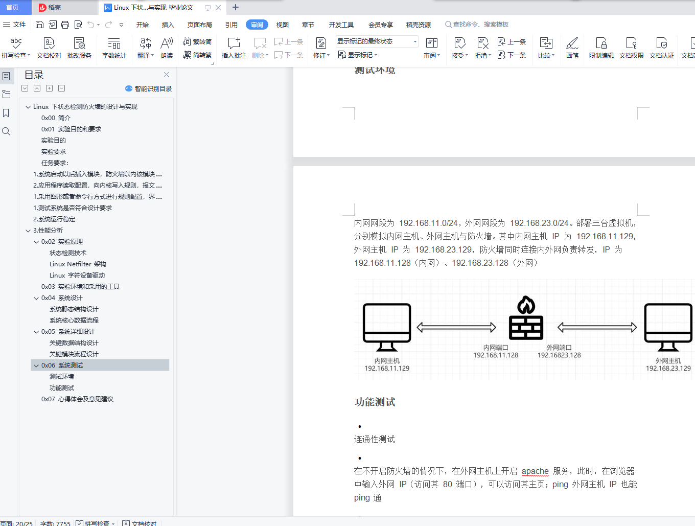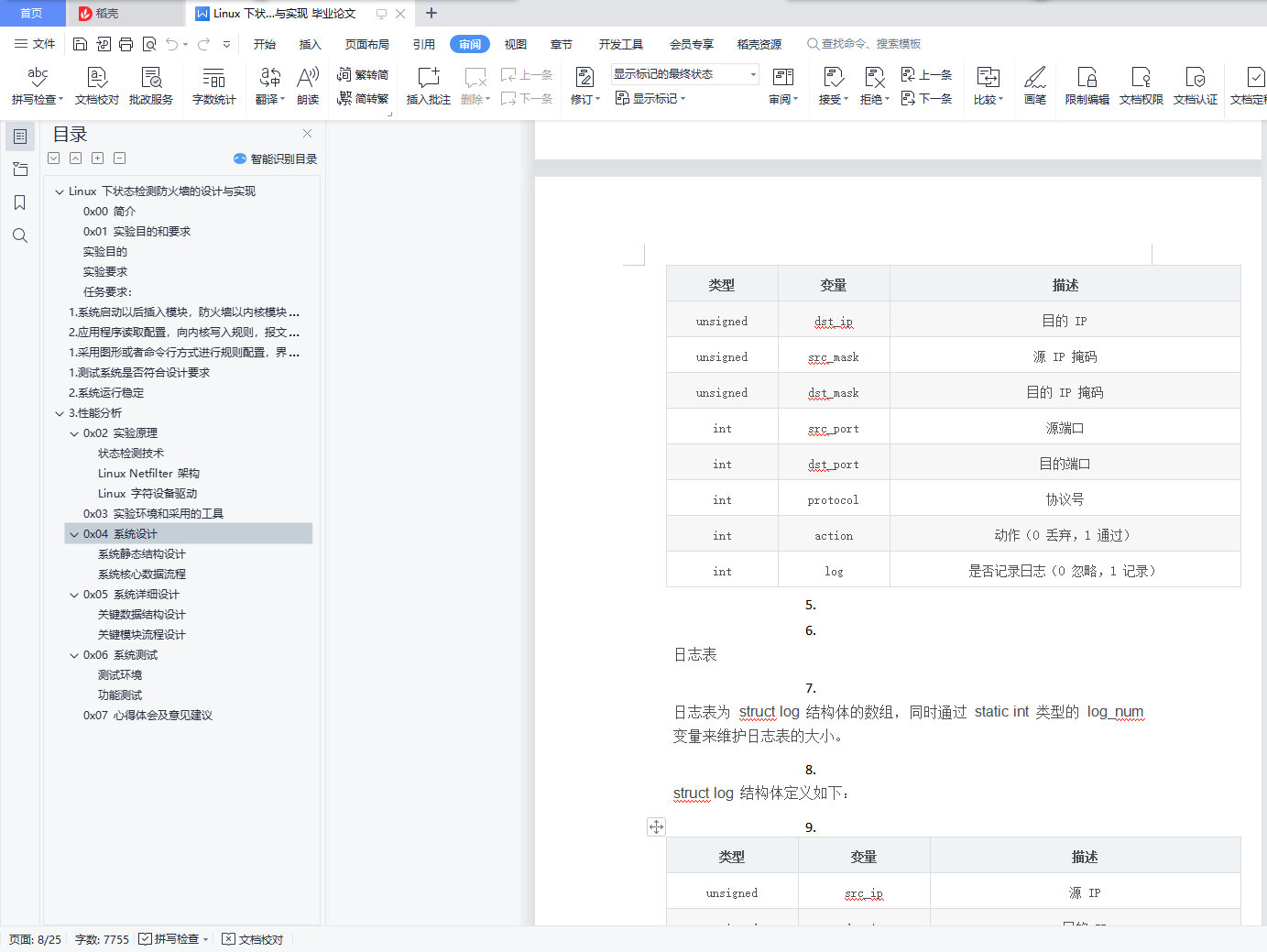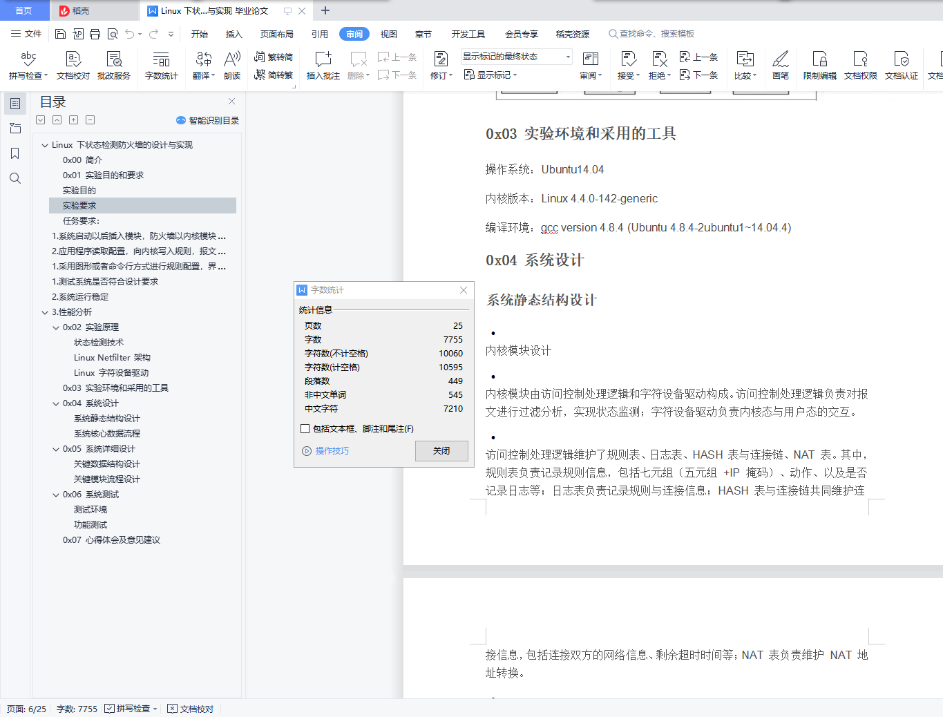 目录Linux 下状态检测防火墙的设计与实现 10x00 简介 10x01 实验目的和要求 1实验目的 1实验要求 2任务要求: 21. 系统启动以后插入模块,防火墙以内核模块方式运行 22. 应用程序读取配置,向内核写入规则,报文到达,按照规则进行处理 21. 采用图形或者命令行方式进行规则配置,界面友好 21. 测试系统是否符合设计要求 32. 系统运行稳定 33. 性能分析 30x02 实验原理 3状态检测技术 3Linux Netfilter 架构 4Linux 字符设备驱动 50x03 实验环境和采用的工具 60x04 系统设计 6系统静态结构设计 6系统核心数据流程 80x05 系统详细设计 8关键数据结构设计 8关键模块流程设计 140x06 系统测试 20测试环境 20功能测试 210x07 心得体会及意见建议 24Linux 下状态检测防火墙的设计与实现0x00 简介本实验为 2021 年华中科技大学网络空间安全学院《网络安全课程设计》的实验,要求实现一个带 NAT 功能的状态检测防火墙(NAT 我没有实现)。这份课设本来就有参考之前的学长学姐的代码,虽然我写的很垃但还是贡献出来,送给想划水的同学,希望能帮到你,也希望你写好之后也能上传分享给以后的学弟学妹0x01 实验目的和要求实验目的结合理论课程学习,深入理解计算机网络安全的基本 原理与协议,巩固计算机网络安全基本理论知识熟练掌握计算机网络编程方法,拓展学生的应用能力加强对网络协议栈的理解提高分析、设计软件系统以及编写文档的能力培养团队合作能力。实验要求正确理解题意具有良好的编程规范和适当的注释有详细的文档,文档中应包括设计题目涉及的基础知识、 设计思路、程序流程图、程序清单、开发中遇到的问题及解决方法、设计中待解决的问题及改进方向任务要求:1.系统运行2.1.系统启动以后插入模块,防火墙以内核模块方式运行2.应用程序读取配置,向内核写入规则,报文到达,按照规则进行处理3.界面4.1.采用图形或者命令行方式进行规则配置,界面友好5.功能要求6.1.能对 TCP、UDP、ICMP 协议的报文进行状态分析和过滤2.每一条过滤规则至少包含:报文的源 IP(带掩码的网络地址)、目的 IP(带掩码的网络地址)、源端口、目的端口、 协议、动作(禁止/允许),是否记录日志3.过滤规则可以进行添加、删除、保存,配置的规则能立即生效4.过滤日志可以查看5.具有 NAT 功能,转换地址分按接口地址转换和指定地址转 换(能实现源或者目的地址转换的任一种即可)6.能查看所有连接状态信息7.测试8.1.测试系统是否符合设计要求2.系统运行稳定3.性能分析