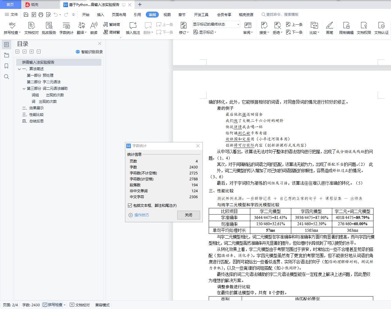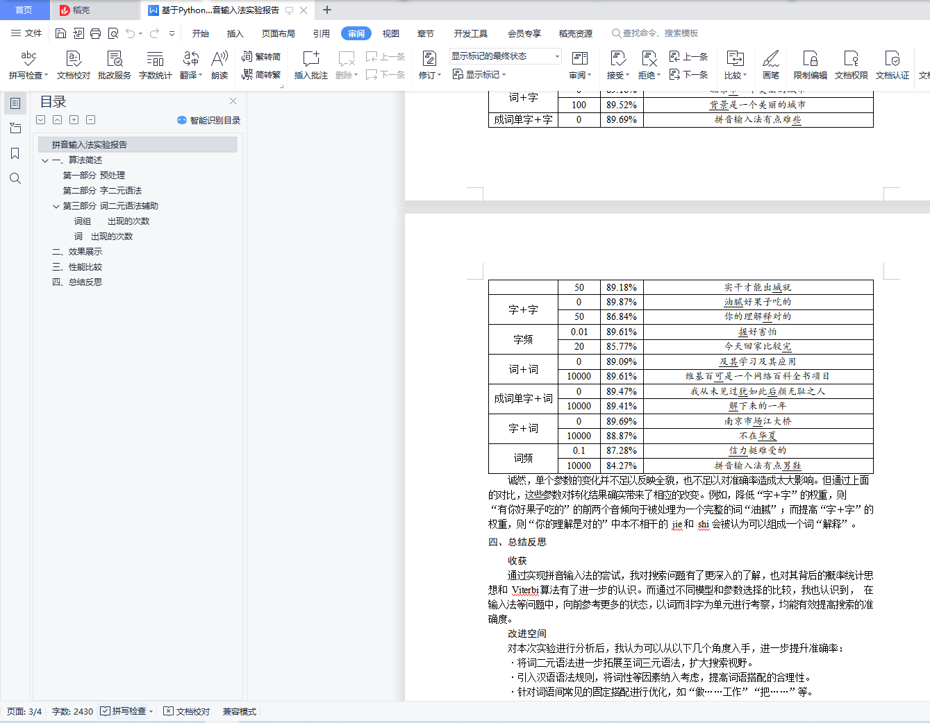 拼音输入法实验报告目录拼音输入法实验报告 1一、算法简述 1第一部分 预处理 1第二部分 字二元语法 1第三部分 词二元语法辅助 1词组𝑥𝑐出现的次数 1词𝑥出现的次数 1二、效果展示 1三、性能比较 3四、总结反思 4一、算法简述输入法主体采用动态规划算法实现。在尝试了字二元语法和字四元语法模型后,最终选择了词二元语法辅助的字二元语法模型。第一部分 预处理对语料进行注音和分词。统计语料中所有相邻 k (=1, 2, 3)字组出现的次数,连同注音存于 char_cnt.txt 中。统计语料中出现的所有词语,连同注音存于 words.txt 中。统计语料中所有词语出现的次数,连同注音存于 word_cnt.txt 中。统计语料中所有相邻两词出现的次数,连同注音存于 phrase_cnt.txt 中。