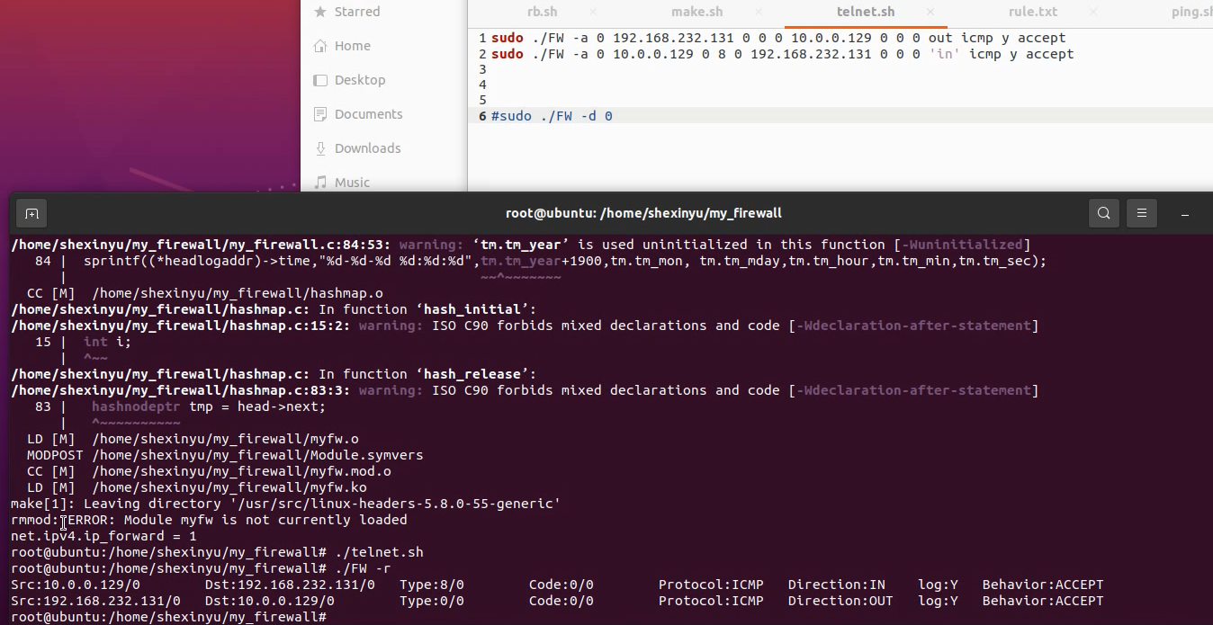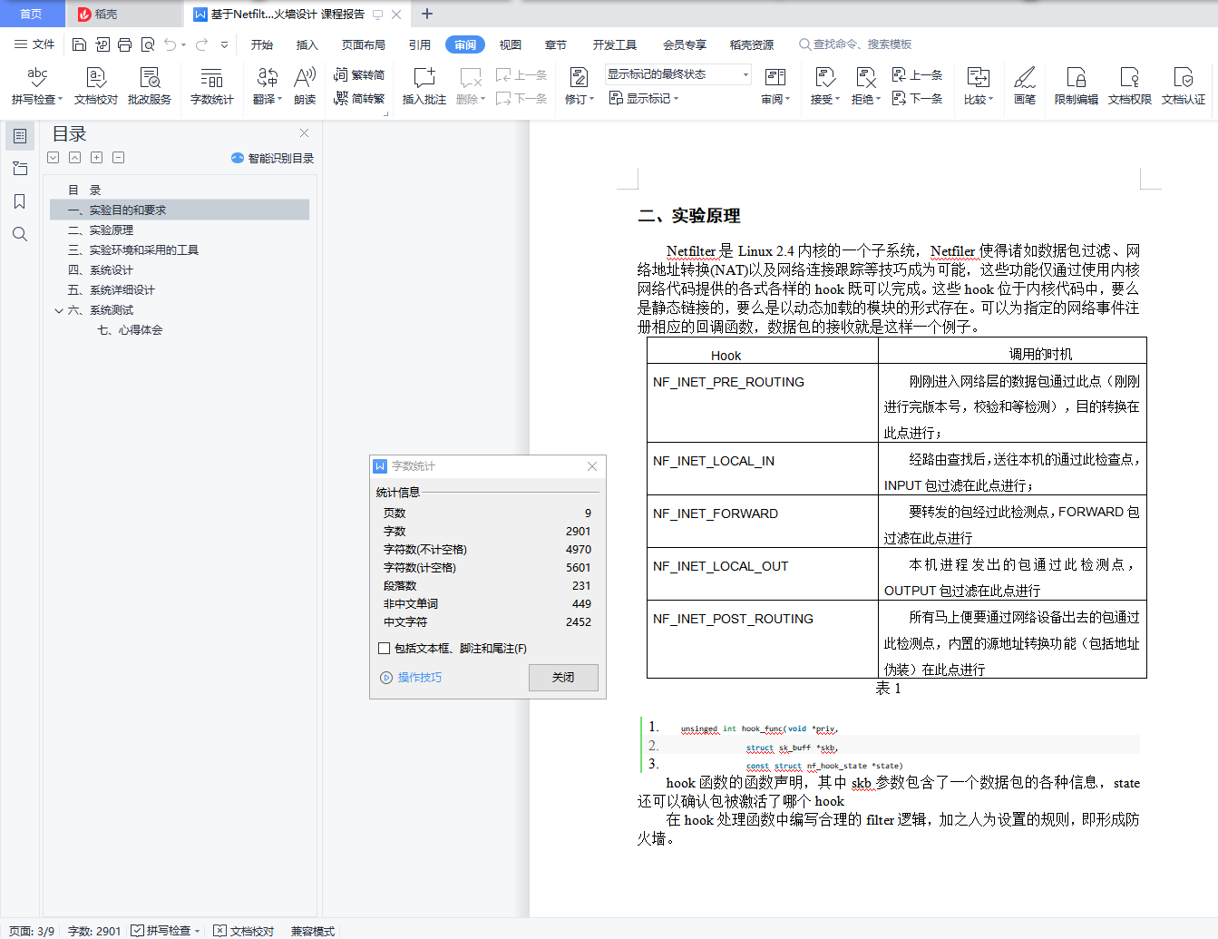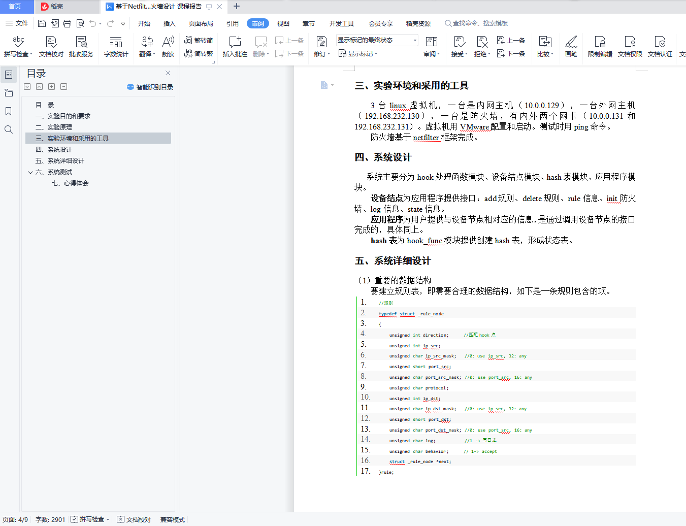 目 录目 录 1一、实验目的和要求 2二、实验原理 3三、实验环境和采用的工具 4四、系统设计 4五、系统详细设计 4六、系统测试 1七、心得体会 3一、实验目的和要求(1)实验目的通过本课程设计要使学生达到以下目标:1.结合理论课程学习,深入理解计算机网络安全的基本原理与协议,巩固计算机网络安全基本理论知识;2.熟练掌握计算机网络编程方法,拓展学生的应用能力;3.加强对网络协议栈的理解;4.提高分析、设计软件系统以及编写文档的能力;5.培养团队合作能力。(2)实验内容1.通过学习和了解Linux Netfilter架构和原理,了解Linux的网络协议栈的处理过程;2.利用Linux Netfilter架构,编写一个具有状态检测的linux防火墙,能对收发的报文进行状态分析和过滤;3.实验验证阶段需要综合运用网络组网技术、网络协议分析技术;4.通过Linux下的开发过程提升学生的内核编程能力和分析问题、解决问题的能力;5.撰写课程设计报告;6.实验结果展示。(3)具体要求课程设计的防火墙系统包括内核模块和应用程序两个部分。内核模块植入hook截获报文,通过防火墙的规则过滤,根据规则可否通行;若放行,则NAT判断是否有相应表项,若无则直接转发,有则地址转换以后转发;此外,还要维护一个连接状态表,记录已经连接的hash,若在其中有表项,则直接Accept。规则由应用程序通过跟内核重写的ioctl函数接口写入,这里也需要自己重写; 应用程序用来设置规则,并调用编译好的新ioctl写入内核;查看日志;查看连接等操作,需要跟内核模块之间通过一定的接口来进行数据交换。1.系统运行:插入模块,防火墙以内核模块方式运行;应用程序向内核写入规则;2.界面:采用图形或者命令行方式进行规则配置,界面友好;3.功能要求:能对TCP、UDP、ICMP协议的报文进行状态分析和过滤;每一条过滤规则至少包含:报文的源IP(带掩码的网络地址)、目的IP(带掩码的网络地址)、源端口、目的端口、协议、动作(禁止/允许),是否记录日志;过滤规则可以进行添加、删除、保存,配置的规则能立即生效;过滤日志可以查看;具有NAT功能,转换地址分按接口地址转换和指定地址转换(能实现源或者目的地址转换的任一种即可);能查看所有连接状态信息;4.测试:测试系统是否符合设计要求、系统运行稳定、性能分析。