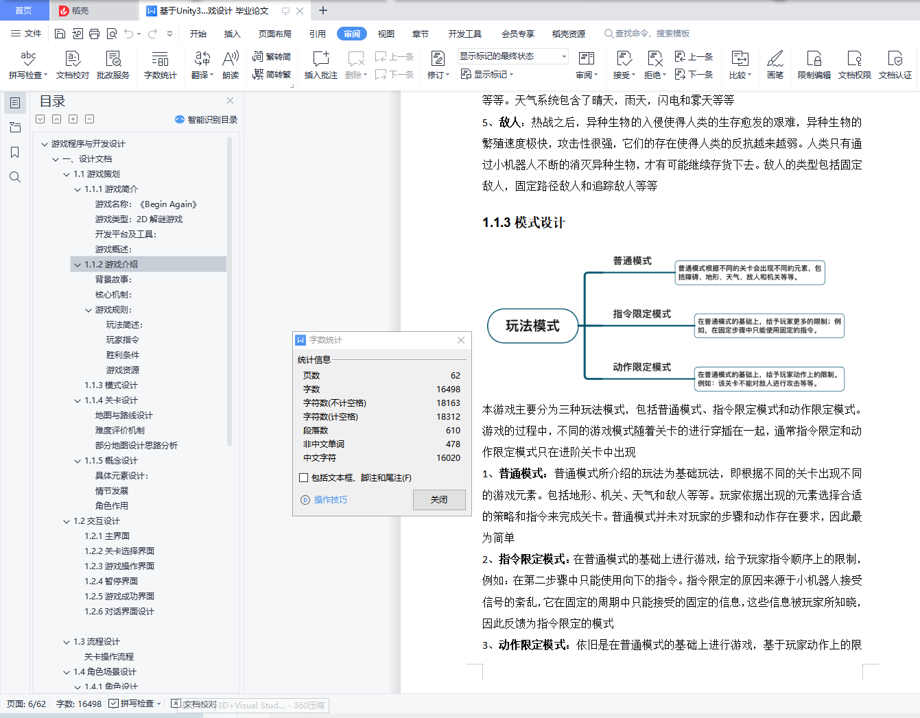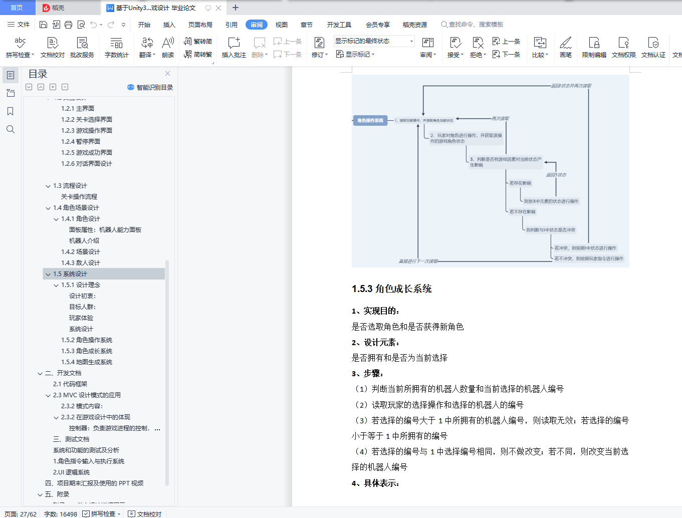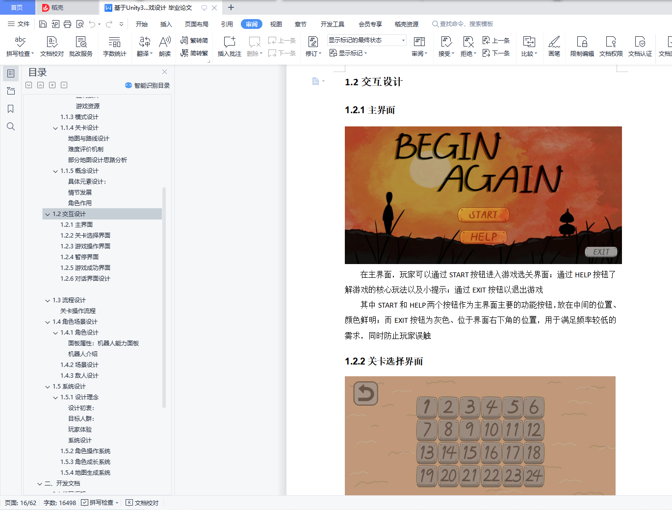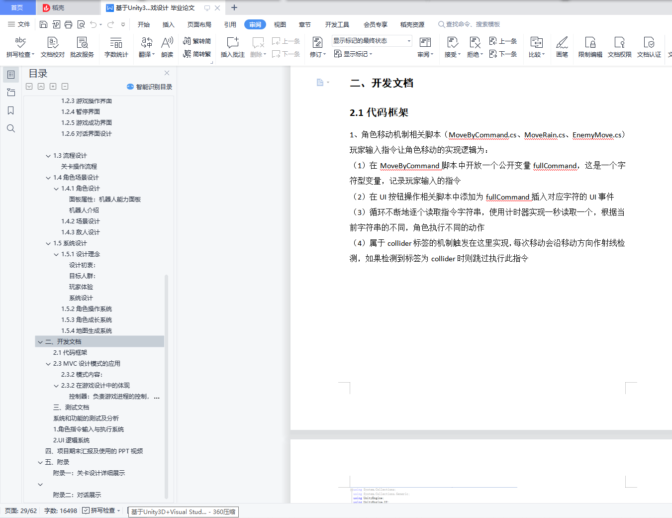 游戏程序与开发设计目录游戏程序与开发设计期末期末开发文档 1一、设计文档 21.1游戏策划 21.2交互设计 161.3流程设计 211.4角色场景设计 211.5系统设计 25二、开发文档 292.1代码框架 292.3 MVC设计模式的应用 42三、测试文档 44系统和功能的测试及分析 441. 角色指令输入与执行系统 442. UI逻辑系统 48四、 项目期末汇报及使用的PPT视频 51五、 附录 51附录一:关卡设计详细展示 5151附录二:对话展示 59一、设计文档1.1游戏策划1.1.1游戏简介游戏名称:《Begin Again》游戏名称为《Begin Again》,取自“周而复始”的英文go round and begin again。游戏名称的来源与游戏本身的玩法机制以及设计理念相符合,它既体现了小机器人循环往复的行动模式,同时也体现了游戏希望玩家不断尝试,不断探索地图以完成关卡的设计初衷游戏类型:2D解谜游戏游戏在2D的棋盘格中进行,各个棋盘格的数量和障碍摆放的位置均不相同,玩家仅仅凭借一次的尝试可能无法通过游戏,玩家需要通过尝试摸索出各个障碍的特点,从而找出到达终点的路径开发平台及工具:1、开发工具:本游戏使用Unity3D进行项目开发,使用Tilemap系统来进行关卡的设计和布局,引入Fungus插件来实现对话系统,使用粒子系统来实现粒子特效;游戏在Visual Studio 2019上进行脚本代码的编写,实现了角色行动、攻击,场景切换,UI逻辑,自动生成地图等游戏功能;游戏的美术和UI的设计在Procreate上完成2、发布平台:本游戏原先在PC端(windows系统)上进行设计和实现,而后通过Unity的多平台开发功能移植到手机端(安卓系统),并在安卓端为其设计了操作界面UI等适配以获得更好的体验效果游戏概述:热战之后环境因素和异种生物的大量繁殖导致了人类文明的大量流失,人类无法适应当前的环境,只能在地下避难所中进行避难,通过派遣较为落后的,只能进行“重复操作”的小机器人进行运输任务,来满足人类最基本的生存需要玩家操作一台小机器人,而这台小机器人不够“智能”,会重复特定的指令,还会被各种环境因素所影响,但如果操作正确,这条重复的指令是小机器人完成任务的关键。玩家需要不断通过小机器人正确的执行任务来通过关卡,这可不是一件容易的事情
