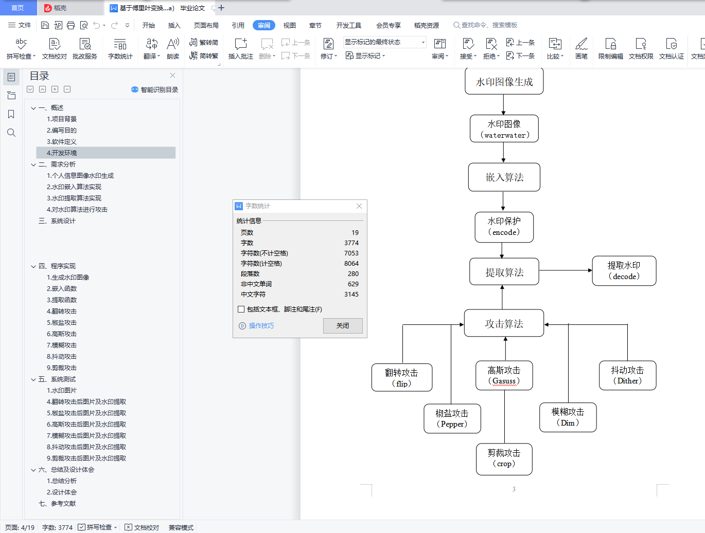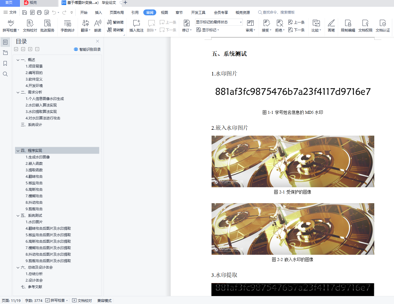 目 录一、 概述 11.项目背景 12.编写目的 13.软件定义 14.开发环境 1二、 需求分析 21. 个人信息图像水印生成 22. 水印嵌入算法实现 23. 水印提取算法实现 24. 对水印算法进行攻击 2三、 系统设计 3四、程序实现 51.生成水印图像 52.嵌入函数 53.提取函数 64.翻转攻击 65.椒盐攻击 76.高斯攻击 77.模糊攻击 88.抖动攻击 89.剪裁攻击 9五、系统测试 101.水印图片 104.翻转攻击后图片及水印提取 115.椒盐攻击后图片及水印提取 116.高斯攻击后图片及水印提取 127.模糊攻击后图片及水印提取 128.抖动攻击后图片及水印提取 139.剪裁攻击后图片及水印提取 13六、总结及设计体会 141.总结分析 142.设计体会 16七、参考文献 18一、概述1.项目背景随着数字水印技术的发展,数字水印的应用领域也得到了扩展,数字水印的基本应用领域是防伪溯源、版权保护、隐藏标识、认证和安全隐蔽通信。当数字水印应用于防伪溯源时,包装、票据、证卡、文件印刷打印都是潜在的应用领域。用于版权保护时,潜在的应用市场在于电子商务、在线或离线地分发多媒体内容以及大规模的广播服务。数字水印用于隐藏标识时,可在医学、制图、数字成像、数字图像监控、多媒体索引和基于内容的检索等领域得到应用。数字水印的认证方面主要ID卡、信用卡、ATM卡等上面数字水印的安全不可见通信将在国防和情报部门得到广泛的应用。 多媒体技术的飞速发展和Internet的普及带来了一系列政治、经济、军事和文化问题,产生了许多新的研究热点。2.编写目的数字作品(如电脑美术、扫描图像、数字音乐、视频、三维动画)的版权保护是当前的热点问题。由于数字作品的拷贝、修改非常容易,而且可以做到与原作完全相同,所以原创者不得不采用一些严重损害作品质量的办法来加上版权标志,而这种明显可见的标志很容易被篡改。“数字水印”利用数据隐藏原理使版权标志不可见或不可听,既不损害原作品,又达到了版权保护的目的。目前,用于版权保护的数字水印技术已经进入了初步实用化阶段,IBM公司在其“数字图书馆”软件中就提供了数字水印功能,Adobe公司也在其著名的Photoshop软件中集成了Digimarc公司的数字水印插件。然而实事求是地说,目前市场上的数字水印产品在技术上还不成熟,很容易被破坏或破解,距离真正的实用还有很长的路要走。3.软件定义基于盲水印算法实现的图像自适应水印算法4.开发环境Anaconda3(2019.10) Python3.7