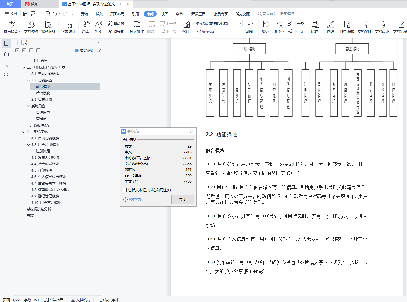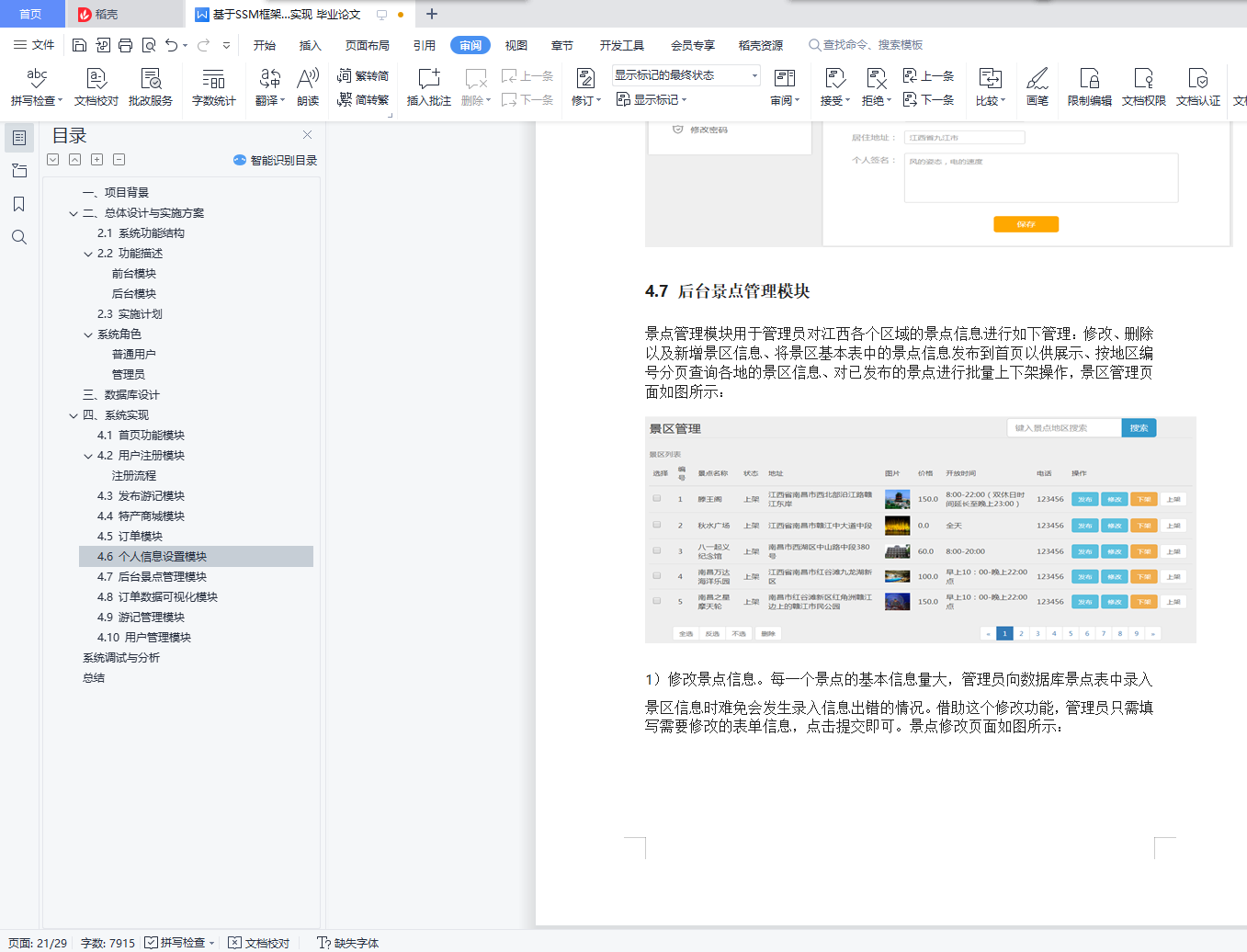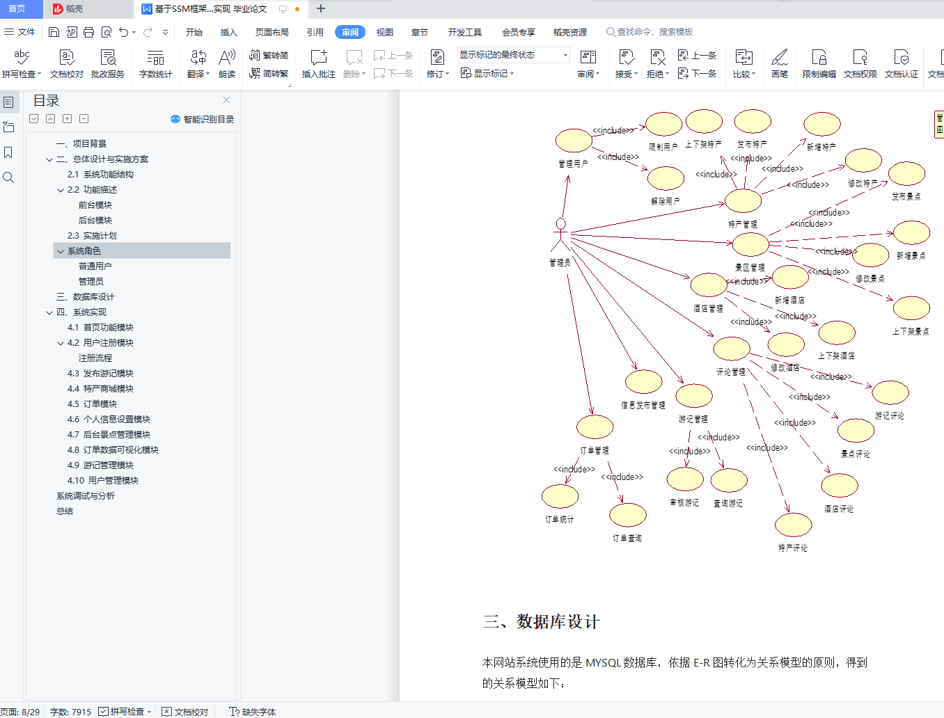 目录一、项目背景 1二、总体设计与实施方案 22.1 系统功能结构 22.2 功能描述 22.3 实施计划 5系统角色 6三、数据库设计 7四、系统实现 94.1 首页功能模块 104.2 用户注册模块 104.3 发布游记模块 124.4 特产商城模块 144.5 订单模块 164.6 个人信息设置模块 194.7 后台景点管理模块 204.8 订单数据可视化模块 234.9 游记管理模块 254.10 用户管理模块 26系统调试与分析 26总结 28一、项目背景旅游业作为一个快速成长的服务行业,游客希望获取的旅游资源相比较以往而言更加的多样化。游客需求变化的同时对旅游网站信息化建设的要求也在不断的提高。各地旅游部门为了加快本土旅游业的发展,正在通过各种途径积极探索旅游业发展的新模式。在互联网和电子商务蓬勃发展的大背景下,通过互联网技术建立当地独具特色的旅游门户网站将有效的促进旅游资源的推广。无论是山水风光还是红色旅游资源,江西都具有自身的独特优势。如今旅游业的发展与互联网联系的更加密切,只有加快旅游业信息化发展的步伐,提高旅游业的信息化建设水平,江西旅游产业才能扩大知名度,紧跟信息化时代的发展步伐。传统的旅游服务信息化水平早已无法满足当下用户的多样化需求,管理效率相对低下,数据处理粗糙,信息共享闭塞等问题严重制约着旅游业的发展。旅游网站在整合不同的旅游资源方面具有自身的优势,它可以将以往分散的旅游资源,包括酒店、景区、特产商品等有效的整合分类。网站负责提供全面的旅游信息化服务,用户就不必为寻找不同的旅游资源而花费大量的时间,可以将精力集中用于良好的旅游体验上。这种服务模式在便利了游客出行的同时也实现了旅游资源利用率的最大化。各类服务资源在互补的同时也满足了用户多样化的需求,旅游服务信息化水平的提高在一定程度上会拉动旅游业的增长。利用时下热门的互联网技术打造江西省旅游门户网站,整合江西各大旅游资源。在充分考虑用户使用体验的基础上,实现用户游记发布、特产购买、景点查询等功能。有效提高江西旅游业的信息化服务水平。二、总体设计与实施方案该系统最核心需要解决的问题是如何满足游客出行旅游多样化的需求。旅游业作为一个庞大的服务生态链,它涵盖的服务场景非常广泛。其中包括酒店、景区、交通等各大环节,不同的环节上对应着各自的服务场景。本网站系统最大的作用就是将这些分支服务有效的整合起来,让用户通过一个平台就可以获得各类旅游资源整合后所带来的更加高效、便捷的服务。游客借助这个平台可以更加方便的了解江西独特的旅游文化并且乐于去体验江西旅游资源所带来的旅行服务,从而达到促进江西旅游业发展的目标。