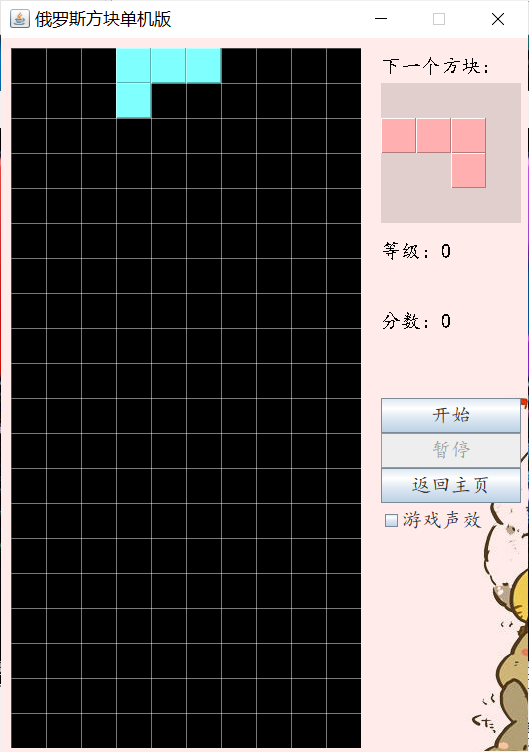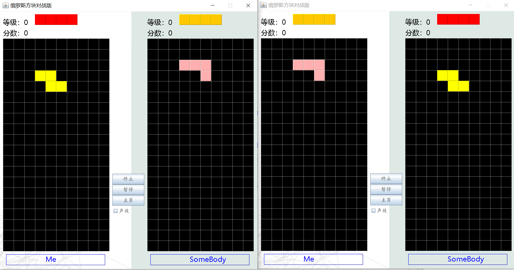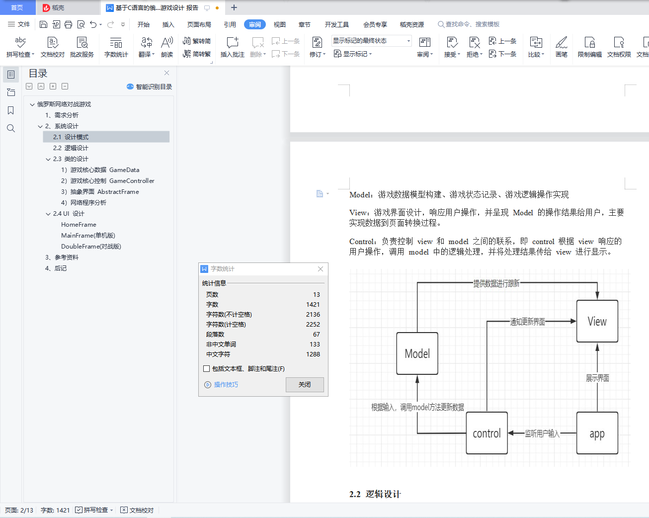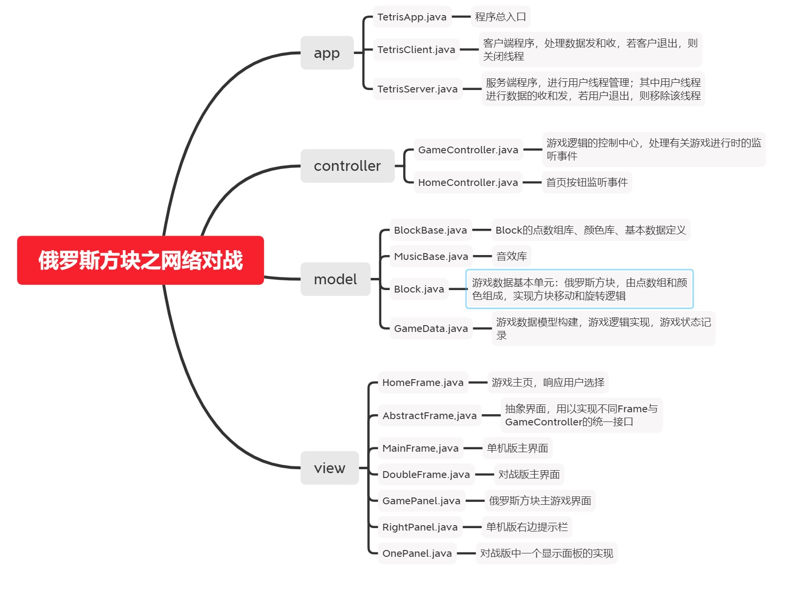 俄罗斯网络对战游戏目录俄罗斯网络对战游戏 11、需求分析 12、系统设计 12.1 设计模式 12.2 逻辑设计 22.3 类的设计 52.4 UI 设计 113、参考资料 124、后记 131、需求分析1)实现俄罗斯方块的基本游戏逻辑:如方块的自动下落、操作左右下移动、操作旋转、操作直落、方块消行、方块碰底及碰顶判断。这些操作,是对游戏数据的底层修改,可以将其封装在数据操作层(model 构建)里面,进行统一管理,每当监听(controller 构建)到相应事件输入(view 构建即图形界面和用户进行交互)后,程序调用该数据操作即可。2)利用 Socket 编写服务器端和客户端程序:根据“三次握手四次挥手”原理编写,用 ObjectInputSream 和 ObjectOutputSream 收发游戏数据层类,以此定义网络通信协议。3)实现俄罗斯方块的联网对战功能:如创建服务端后,客户端连接服务器,传送己方数据给服务端,服务端接收数据并传给另一个客户端,另一个客户端将收到他方数据,这样即可完成数据通信,根据他方数据做成图形界面进行直观对比,达到对战效果。4)实现计分、音效等辅助功能:可根据消行数来记录分数,音效响应相关按键或点击事件即可。2、系统设计2.1 设计模式MVC 框架,即 model-view-controller(模型-视图-控制器),适用于交互编程项目开发。Model:游戏数据模型构建、游戏状态记录、游戏逻辑操作实现View:游戏界面设计,响应用户操作,并呈现 Model 的操作结果给用户,主要实现数据到页面转换过程。Control:负责控制 view 和 model 之间的联系,即 control 根据 view 响应的用户操作,调用 model 中的逻辑处理,并将处理结果传给 view 进行显示。