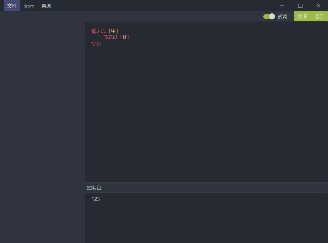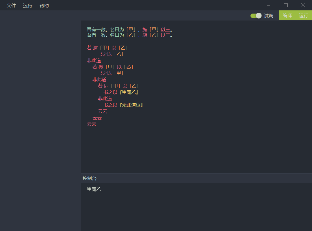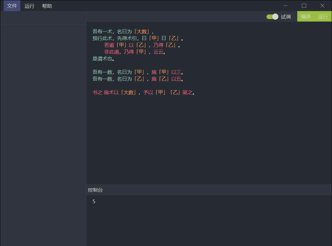 目录阅读本文时请先查看以下注意事项: 1标识符: 1变量声明: 1字符/字符串: 3二元运算: 3比较运算: 3输出(打印): 3循环: 4基于Java实现的文言文语法编程(及其编译器)说明阅读本文时请先查看以下注意事项:1、当前编译器并未提供注释的解析,在使用以下代码测试时,请去除以 // 注释的内容;2、由于古文并没有标点符号,为了增强代码可读性,编码过程中可按需加入逗号,句号,空格,Tab四种中文符号,但为了客观性,符号做了长度限制;3、与传统编程语言不同,该语法支持的是中文状态的符号(句号,逗号);4、实现语法功能有限。标识符:以「」包裹,且不出现关键字与数字变量声明:变量赋值:数字:基础数值组合元素:0、1、2、3、4、5、6、7、8、9分别对应文言文语法数值组合元素:零、一、二、三、四、五、六、七、八、九。支持单位有千万亿