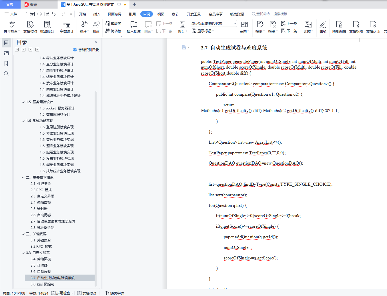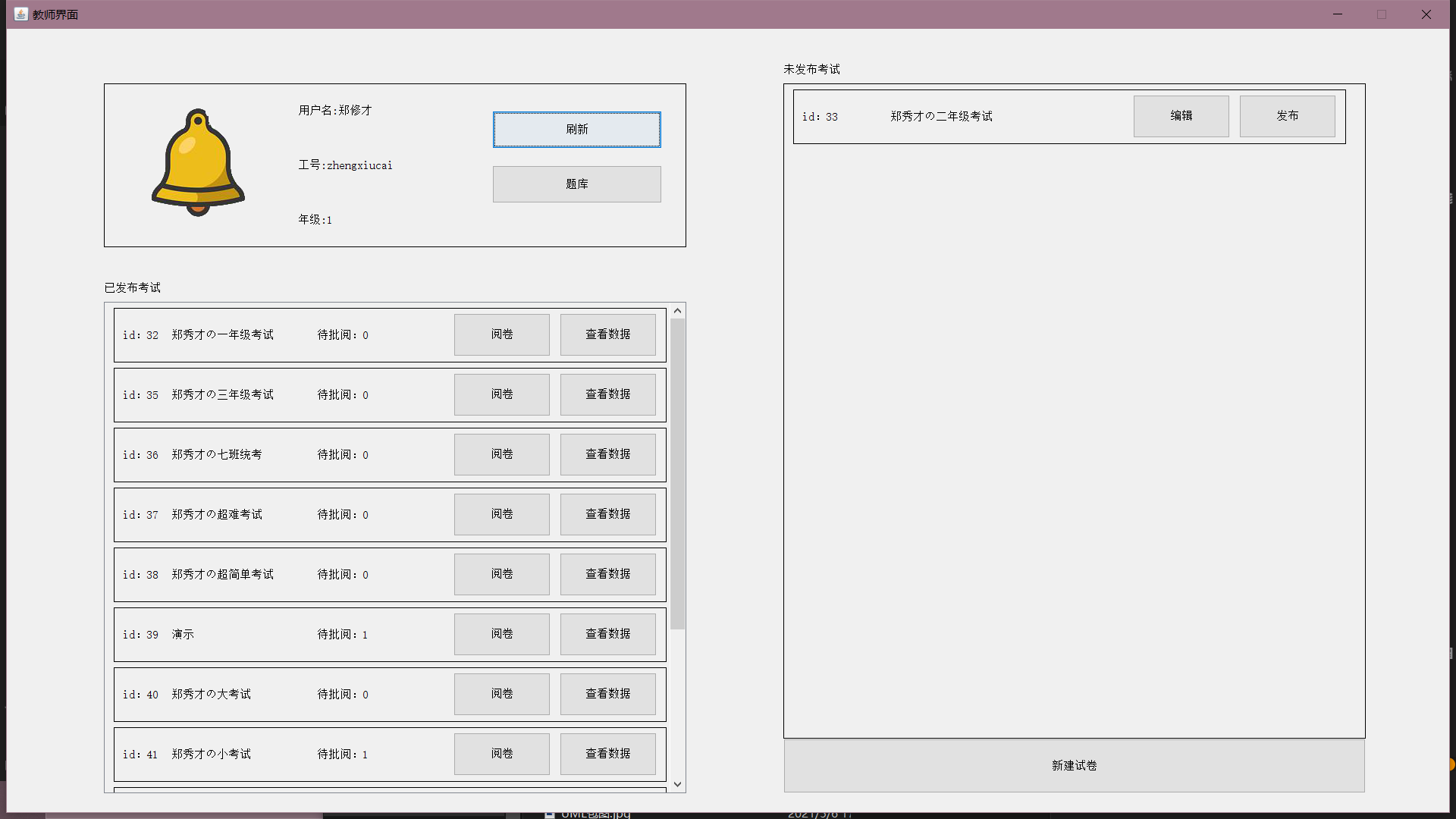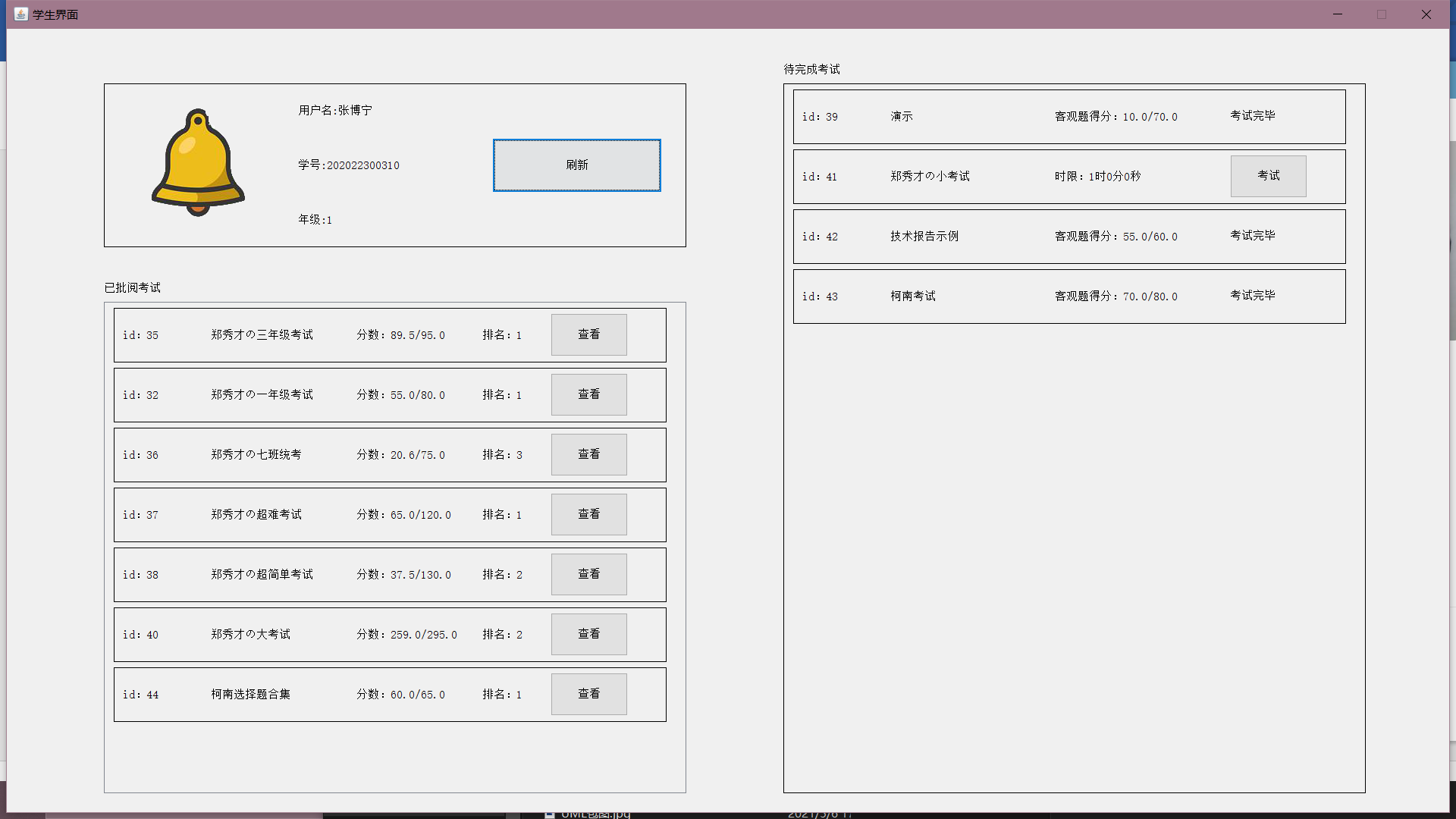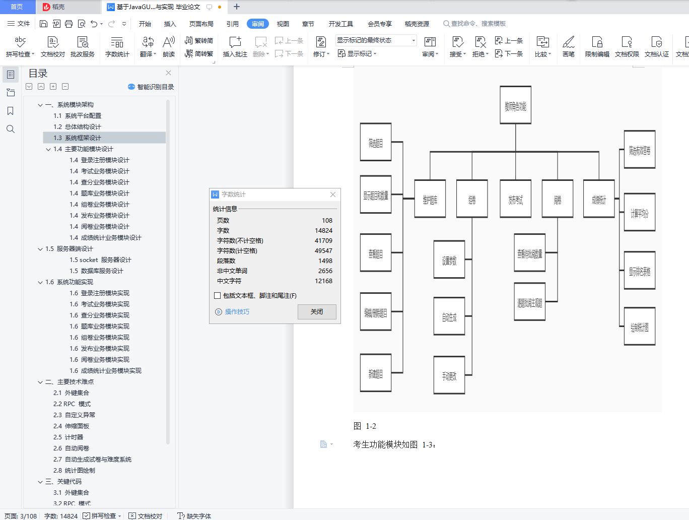 目录一、系统模块架构 11.1 系统平台配置 11.2 总体结构设计 21.3 系统框架设计 21.4 主要功能模块设计 41.5 服务器端设计 191.6 系统功能实现 26二、主要技术难点 712.1 外键集合 712.2 RPC 模式 722.3 自定义异常 772.4 伸缩面板 782.5 计时器 832.6 自动阅卷 832.7 自动生成试卷与难度系统 832.8 统计图绘制 84三、关键代码 853.1 外键集合 853.2 RPC 模式 863.3 自定义异常 923.4 伸缩面板 943.5 计时器 1013.6 自动阅卷 1023.7 自动生成试卷与难度系统 1043.8 统计图绘制 106一、系统模块架构1.1 系统平台配置如表 1-1:表 1-1 系统平台配置表服务器/客户端操作系统 Windows10数据库 MySQL开发环境 IntelliJ IDEA开发语言 Java1.2 总体结构设计基于 C/S 架构实现的在线考试系统的整体结构可以划分为数据库、服务器和客户端三大结构。总体架构如图 1-1 所示(图源百度):