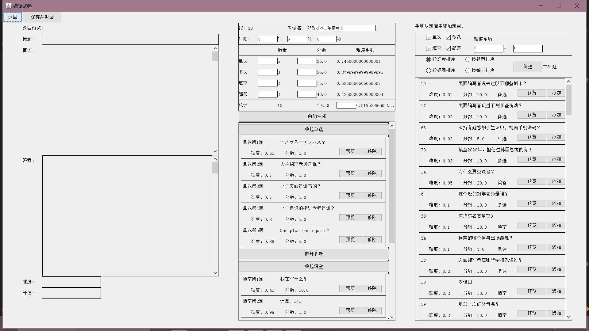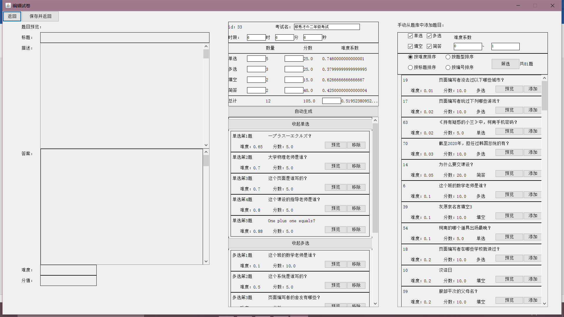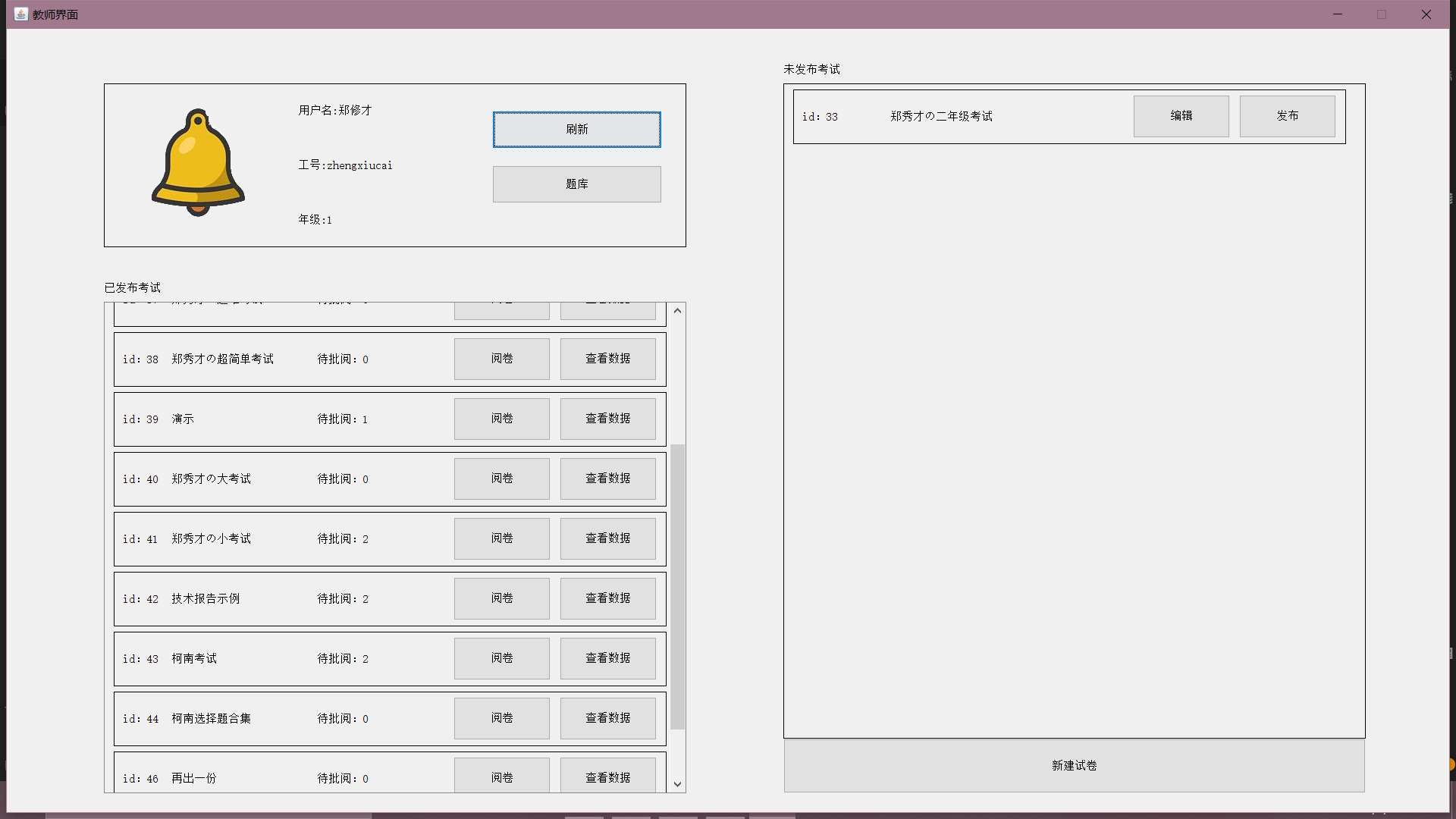 目录一、系统模块架构 11.1 系统平台配置 11.2 总体结构设计 21.3 系统框架设计 21.4 主要功能模块设计 41.5 服务器端设计 191.6 系统功能实现 26二、主要技术难点 712.1 外键集合 712.2 RPC 模式 722.3 自定义异常 772.4 伸缩面板 782.5 计时器 832.6 自动阅卷 832.7 自动生成试卷与难度系统 832.8 统计图绘制 84三、关键代码 853.1 外键集合 853.2 RPC 模式 863.3 自定义异常 923.4 伸缩面板 943.5 计时器 1013.6 自动阅卷 1023.7 自动生成试卷与难度系统 1043.8 统计图绘制 106一、系统模块架构1.1 系统平台配置如表 1-1:表 1-1 系统平台配置表服务器/客户端操作系统 Windows10数据库 MySQL开发环境 IntelliJ IDEA开发语言 Java1.2 总体结构设计基于 C/S 架构实现的在线考试系统的整体结构可以划分为数据库、服务器和客户端三大结构。总体架构如图 1-1 所示(图源百度):